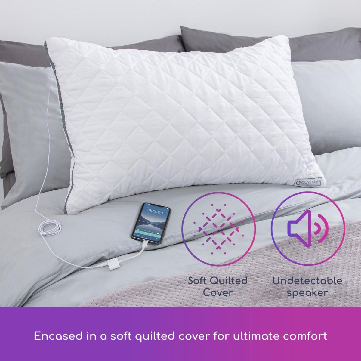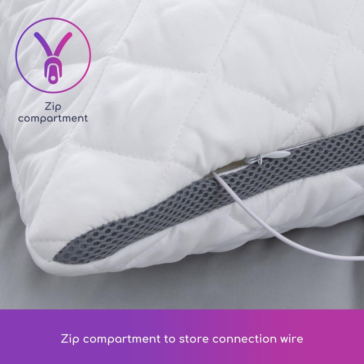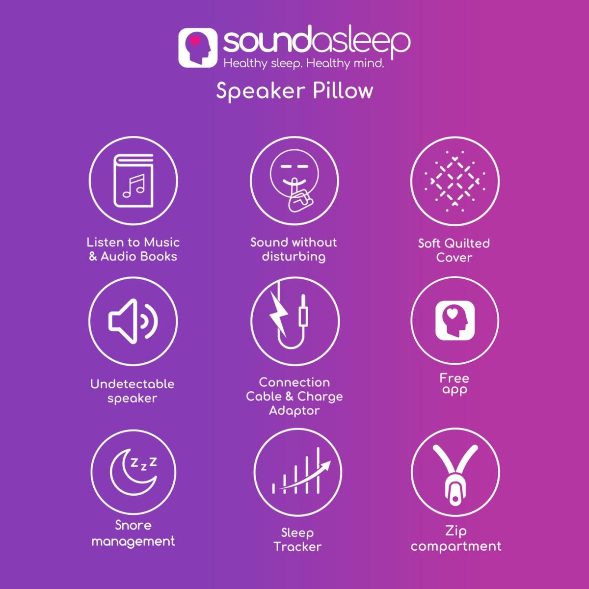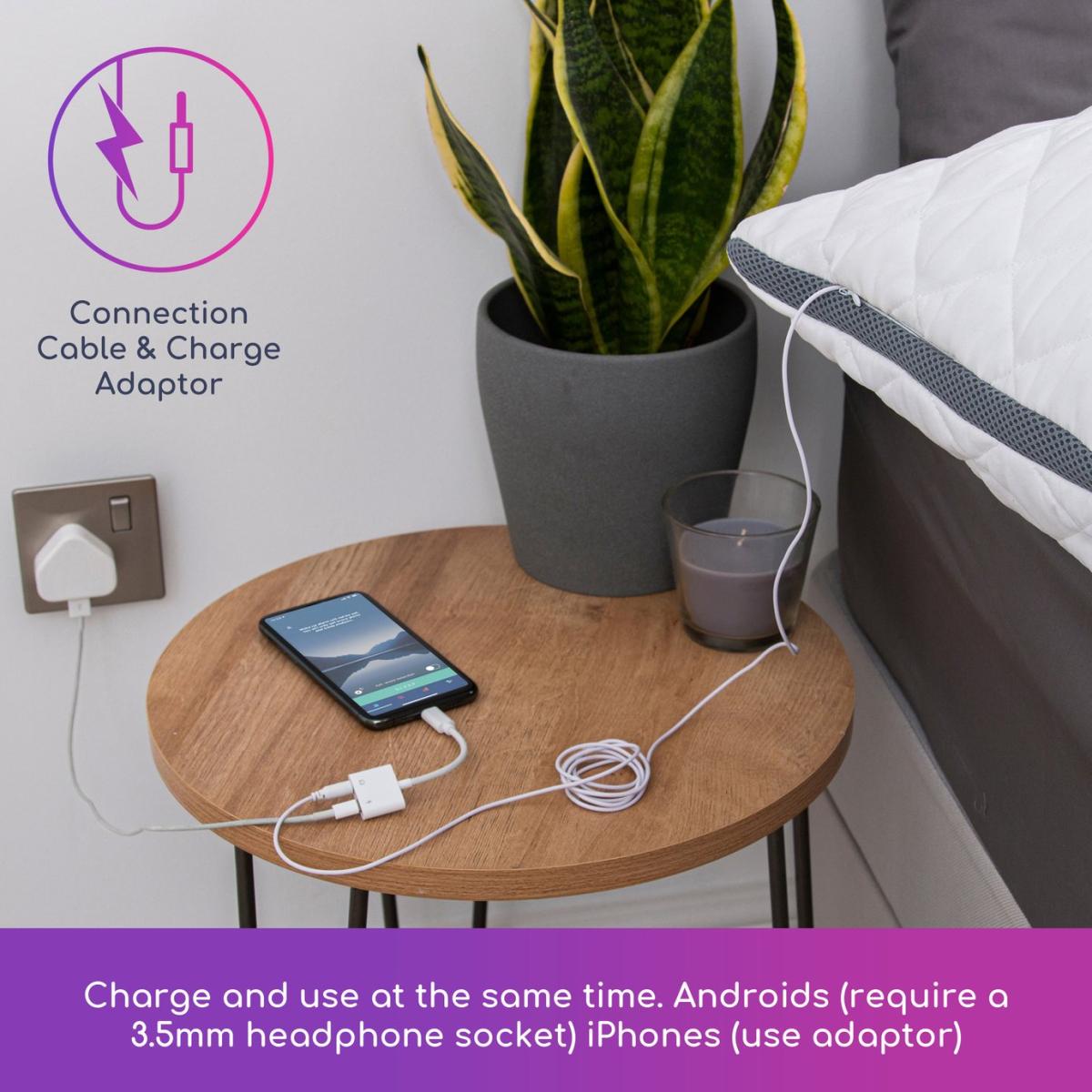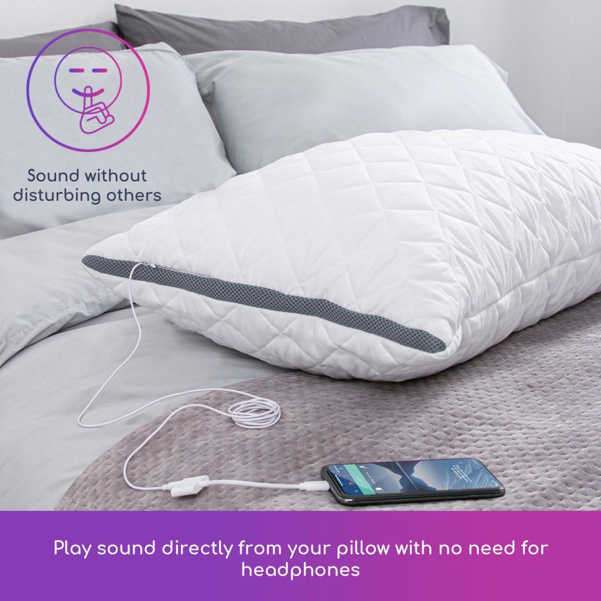 Comfort and sound come together in perfect harmony; you can listen to your favourite sounds without disturbing others and without the need for headphones. Connect to your device's headphone socket, and control the sound directly from your device, tailoring the volume to the level desired. The pillow comes complete with a 2 in 1 connection cable and charging adaptor. The pillow is covered in a soft quilted cover and filled with squishy fibres. The speaker lies undetectable inside, so you won't even know it's there. A revolutionary way to unwind! Our unique speaker pillow has been designed to help improve mental wellbeing, through better sleep and relaxation by using the power of sound and technology. Pack quantity: 1. Cover made from 100% polyester. Filling made from 100% polyesterpolyester. Medium pillow. Suitable for any sleepers. Size L74, W48cm. 1.8kg. Spot clean only. Line dry only. Manufacturer's 2 year guarantee.