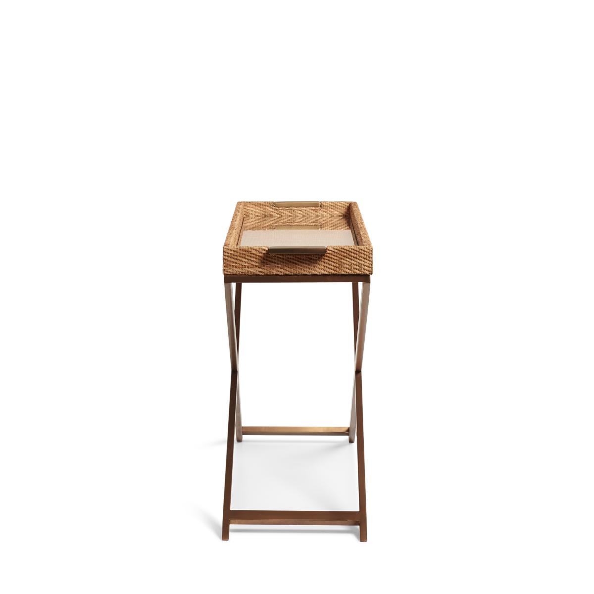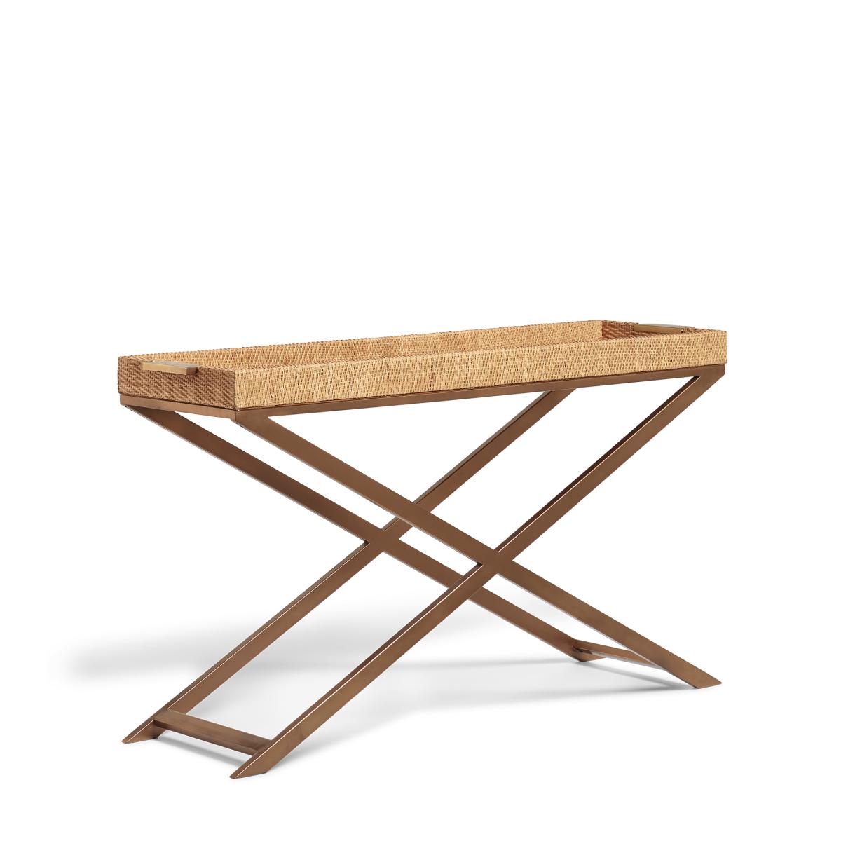 A taller iteration of the classic Butler’s tray, the Sovannah Console Table features high criss-crossing legs in a brass finish and a rattan tabletop in a wicker weave. The rattan is coated and topped with a glass panel, creating a more durable and stable surface.