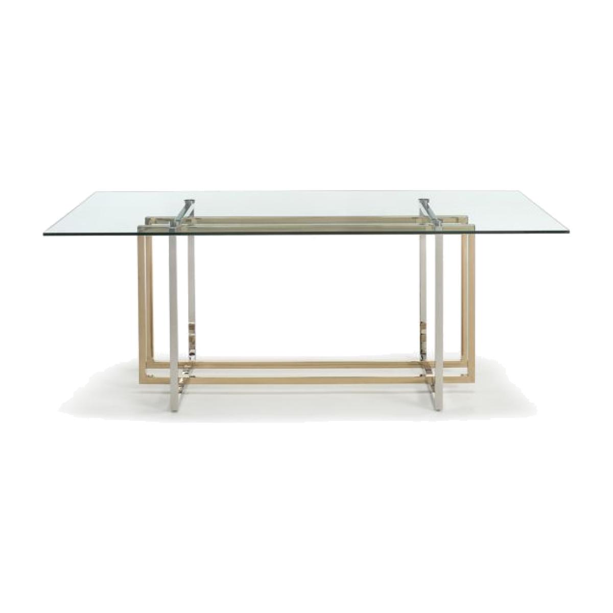 The Sovereign Dining Table is the centre piece of the on trend Sovereign collection. It is part of a full dining and occasional range of furniture. The slim geometric frame with a uprights in polished stainless steel framed by a bracing frame of elegant champagne gold plating using our state of the art PVD process all goes into making this piece timeless classic. Dining Table Dimensions - W 200 x D 100 x H 75cm Table Top - 10mm clear toughened glass, secured with aluminium bosses bonded beneath Frame - Polished stainless steel with a polished champagne finish using PVD titanium Part of the Sovereign furniture range Please note, the dining chairs pictured are not included but are available to purchase separately.