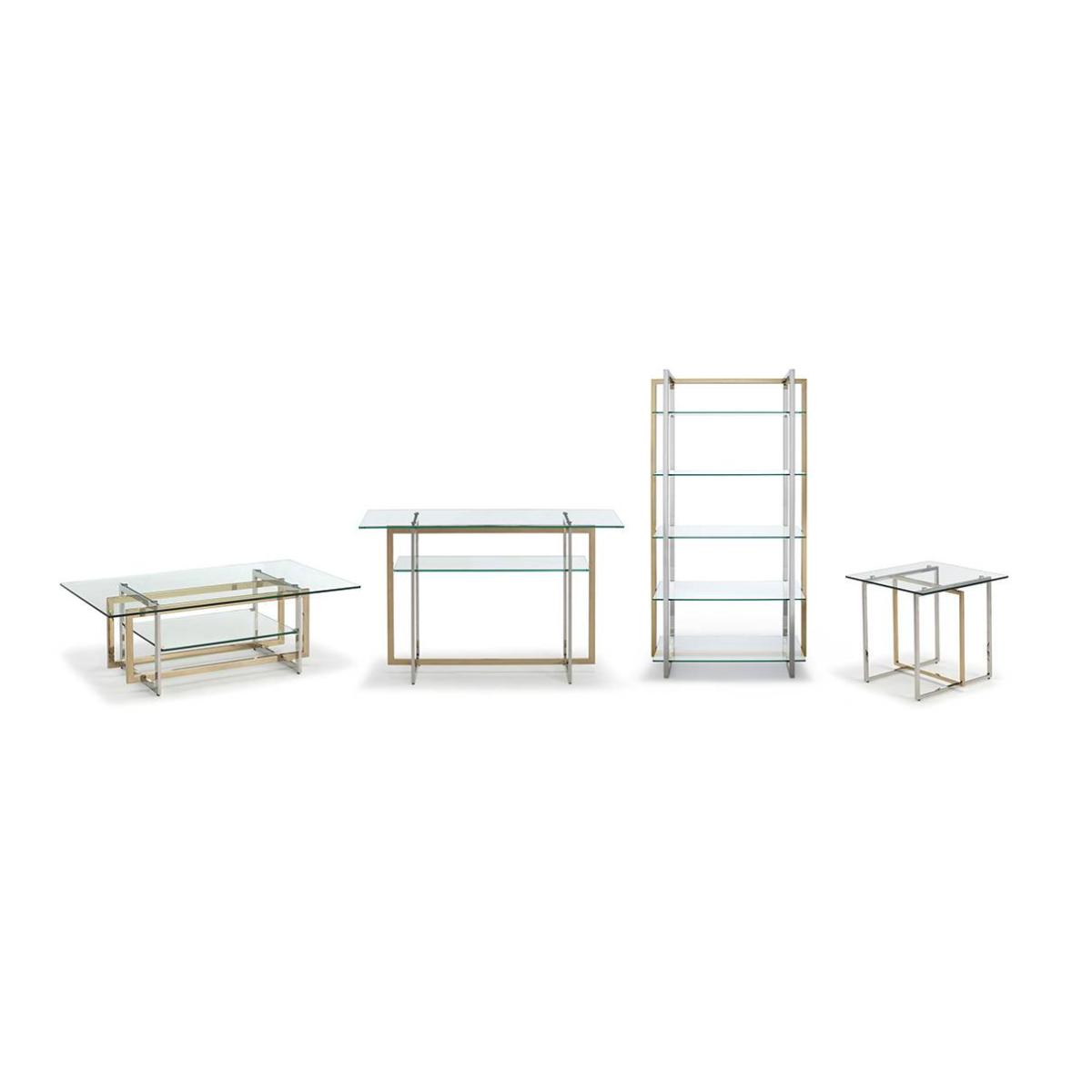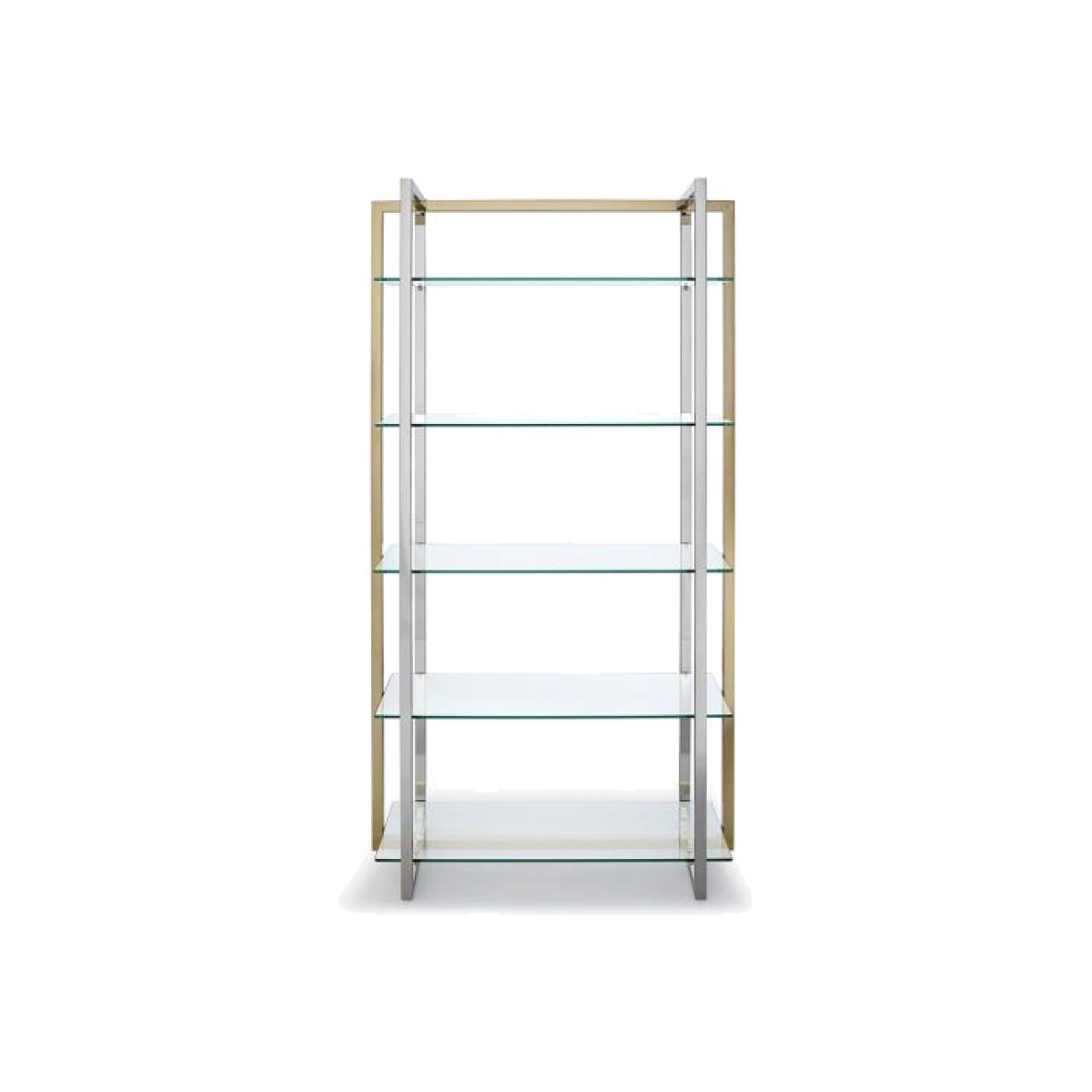 This elegant display unit is part of a full dining and occasional Sovereign furniture range. The slim geometric frame with a uprights in polished stainless steel is framed with an elegant section of steel finished in champagne gold plate using the state of the art PVD process that all goes into making this range a timeless classic. The Sovereign Shelf Unit stands just over six feet tall has five clear glass tempered shelves to display your finest. Narrow Wall Unit Dimensions - W x 100cm x D 40 x H 187.5cm 10mm clear toughened glass, secured with aluminium bosses bonded beneath Frame - Polished stainless steel with a polished champagne finish using PVD titanium Part of the Sovereign furniture range