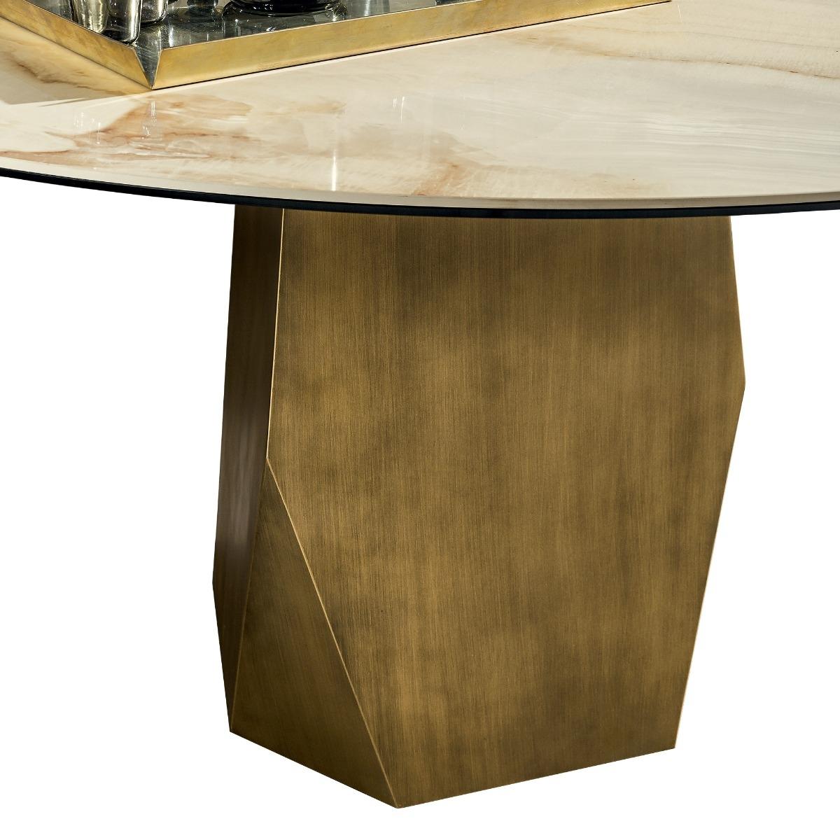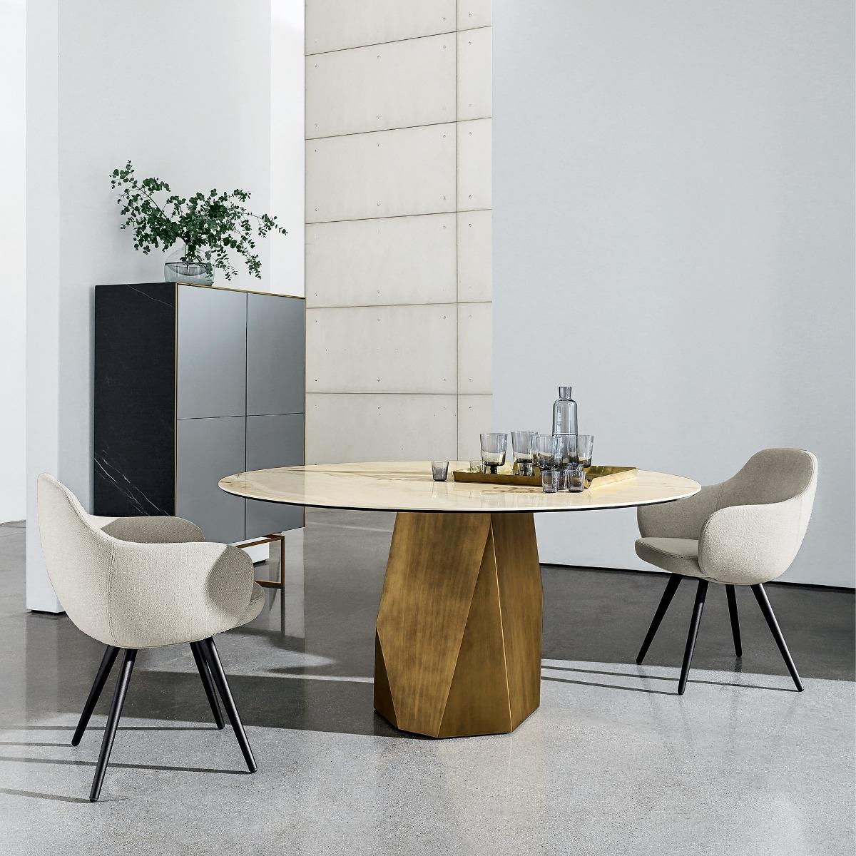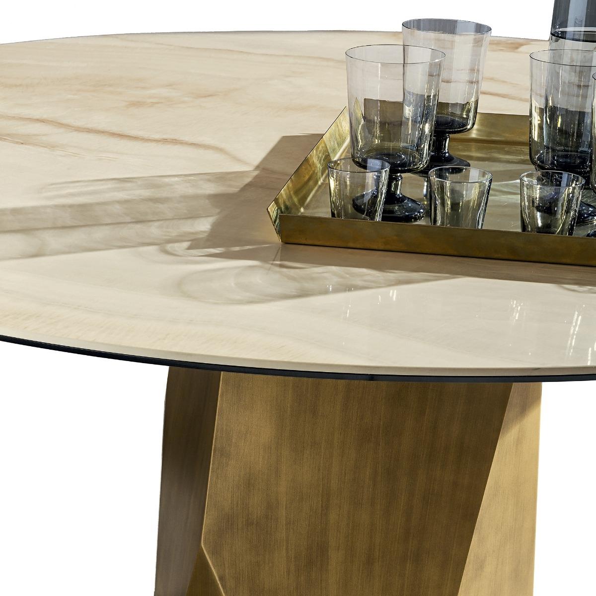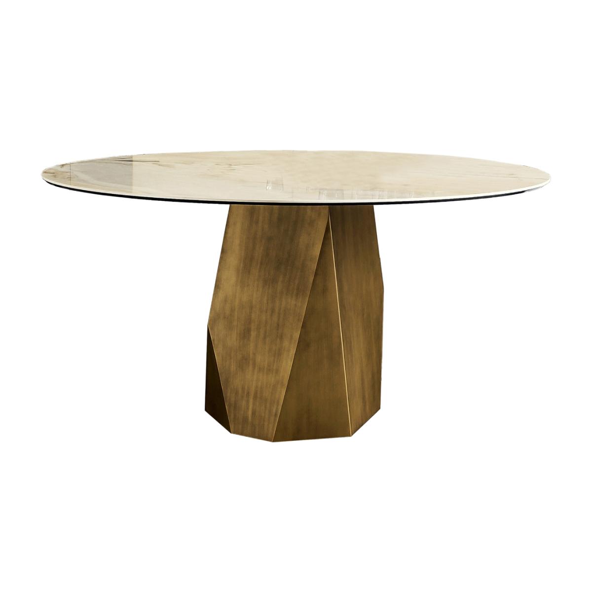 Design. Showcasing geometric flare, the Deod Dining Table offers a more sociable dining experience with its circular design and versatile size. The distinct aluminium base stands proudly in a sculptural shape resembling the Dolomite Mountains in Italy, accentuated by its brushed gold finish. The natural ceramic top furthers the organic theme, with a silky-smooth finish that adds to Deod’s extraordinary modern design. For more information and to discuss additional options complete our. Enquiry form. Or. Contact our specialist brand advisors.