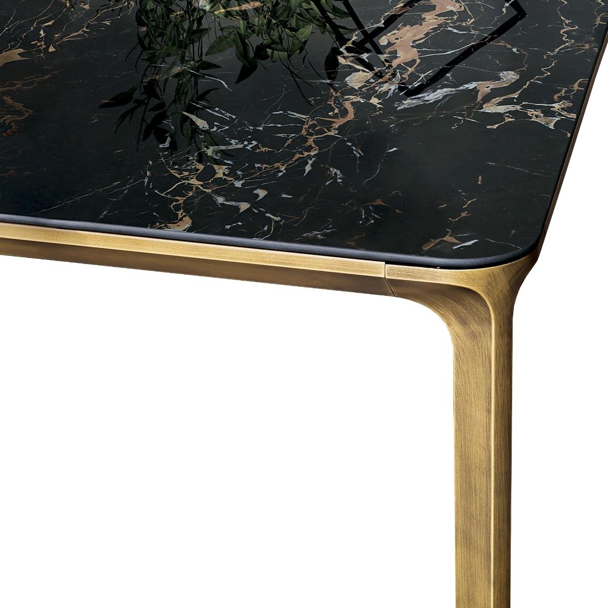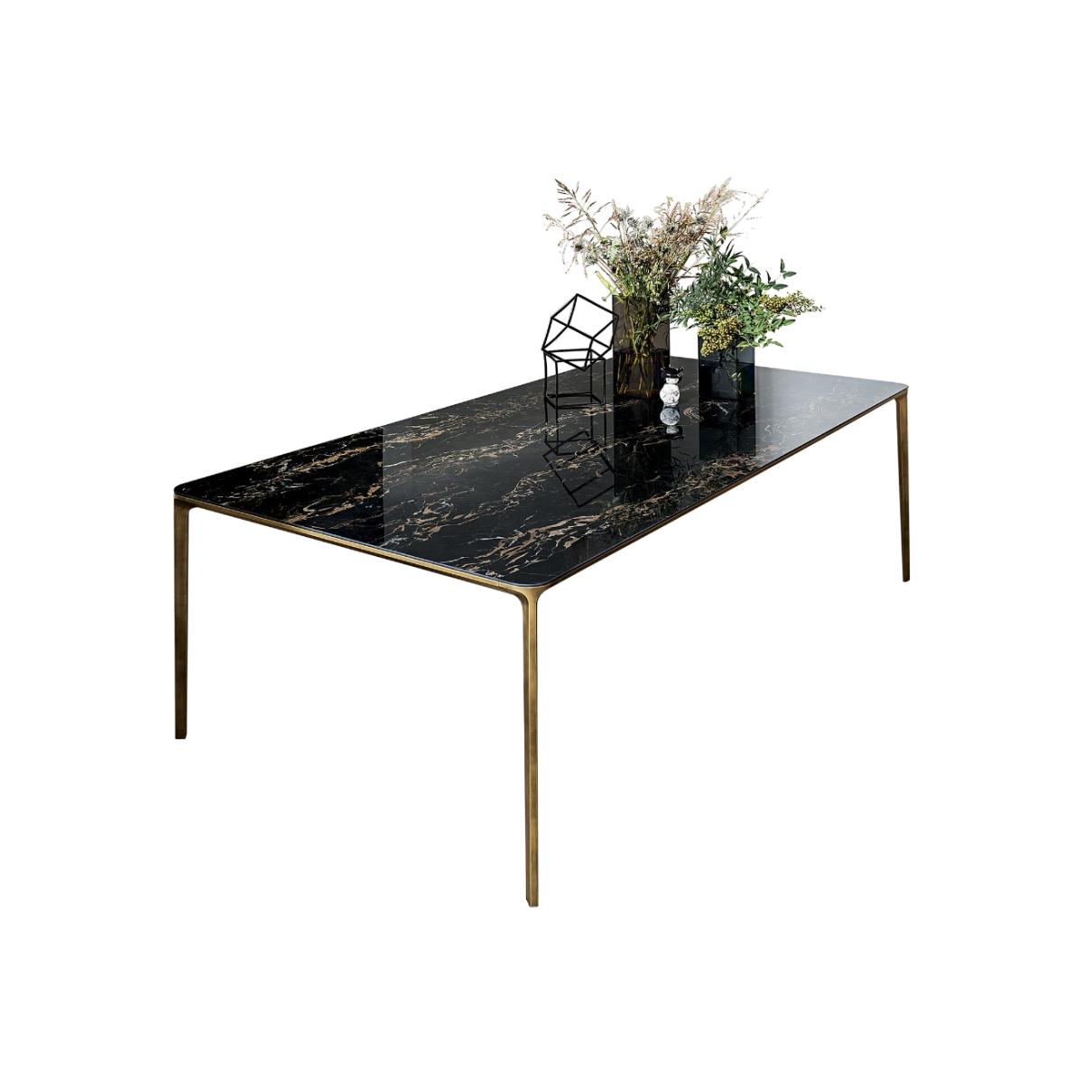 Design. The Slim Rectangular Dining Table is a remarkable work of art created by Sovet Italia. The glossy top is made from ceramic, featuring a detailed marble design which draws the eye and sits upon thin metallic legs with a brushed gold finish. The hints of colour are highlighted against the deep black base of the tabletop, matched with smooth curves and minimal design, Slim brings a luxurious and sophisticated style like no other. For more information and to discuss additional options complete our. Enquiry form. Or. Contact our specialist brand advisors.