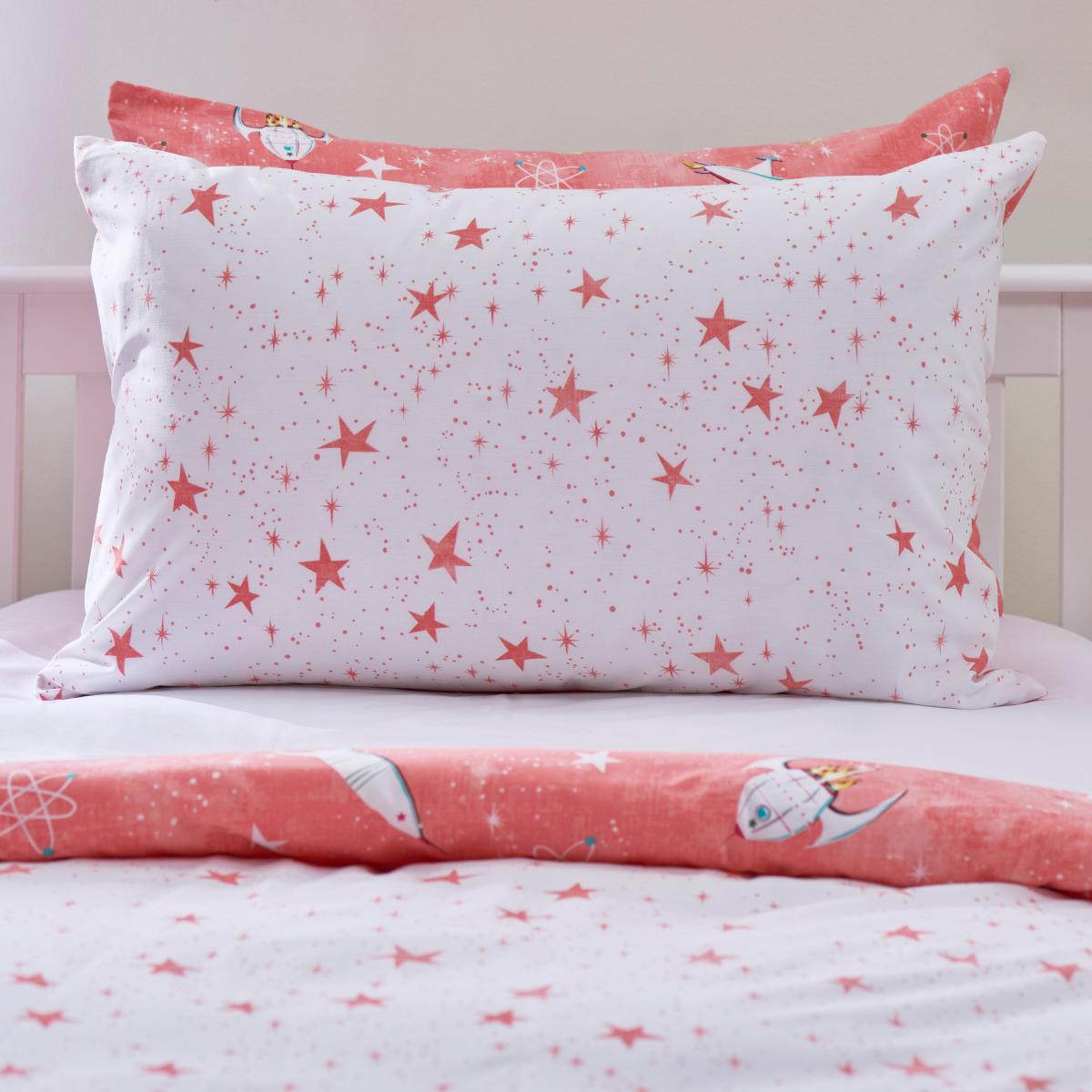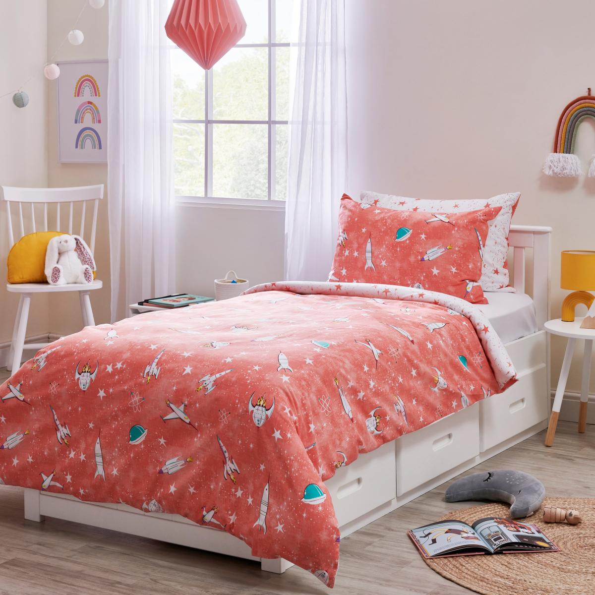 Bring energy and excitement to your child’s room with this vibrant full colour printed duvet set. With two sides of space theme print, this energetic print will add fun and cheer to any room. Enjoy the convenience of transforming and refreshing a room, with one side featuring deep coral tones, rockets and space figures and the other lighter and calmer with stars running throughout. This polycotton set is machine washable and available in a range of sizes.