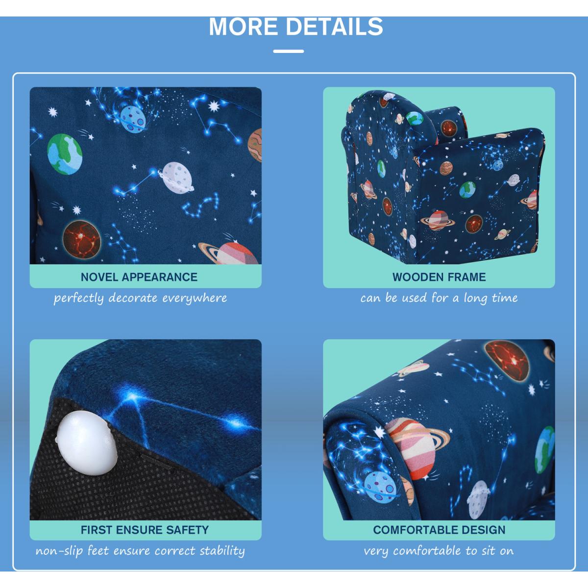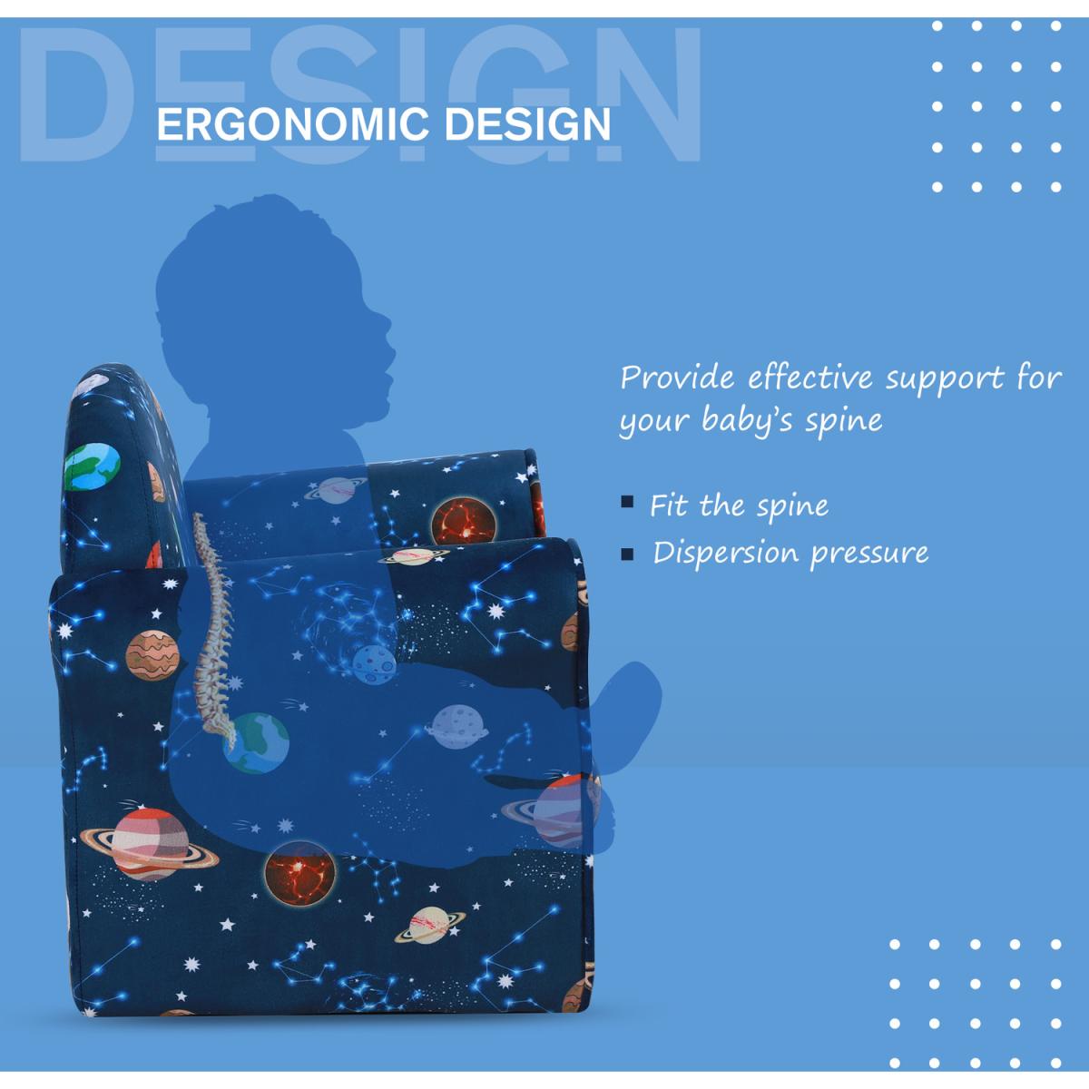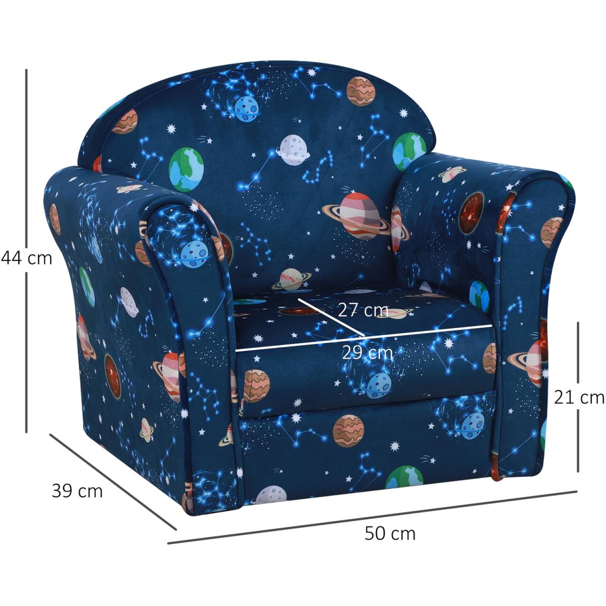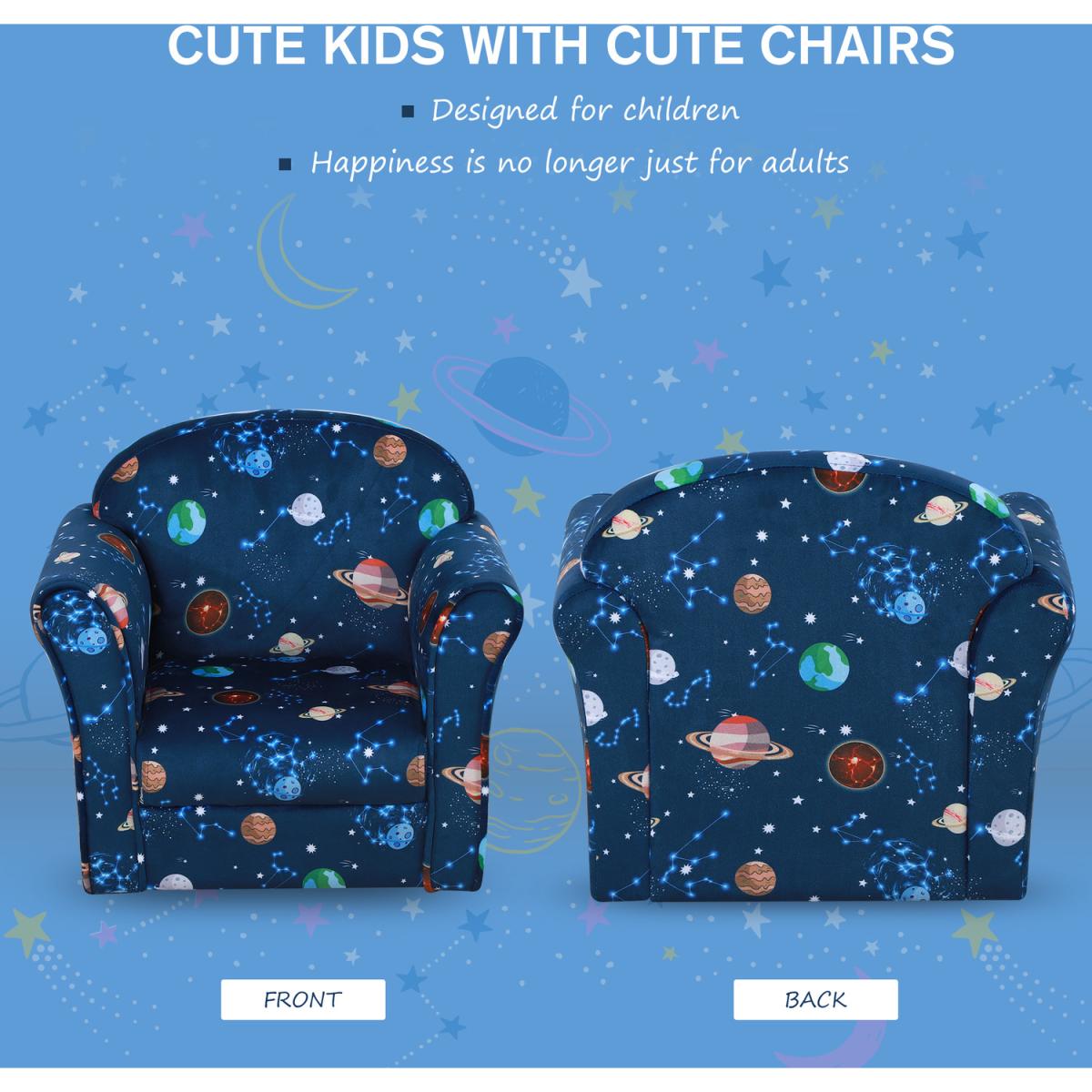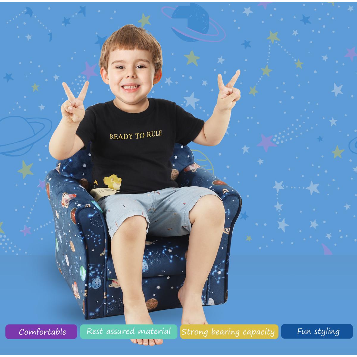 Bring the fun and adventure into their bedroom and playroom with this child armchair from HOMCOM. The wood frame ensures the structure is tough and reliable for a weight up to 45kg, and it is fitted with thick foam everywhere for comfort. The high back and arms provide support for the body, and it is covered in multicoloured space and planet-themed upholstery which they'll adore. Recommended age: 3-6 years.
