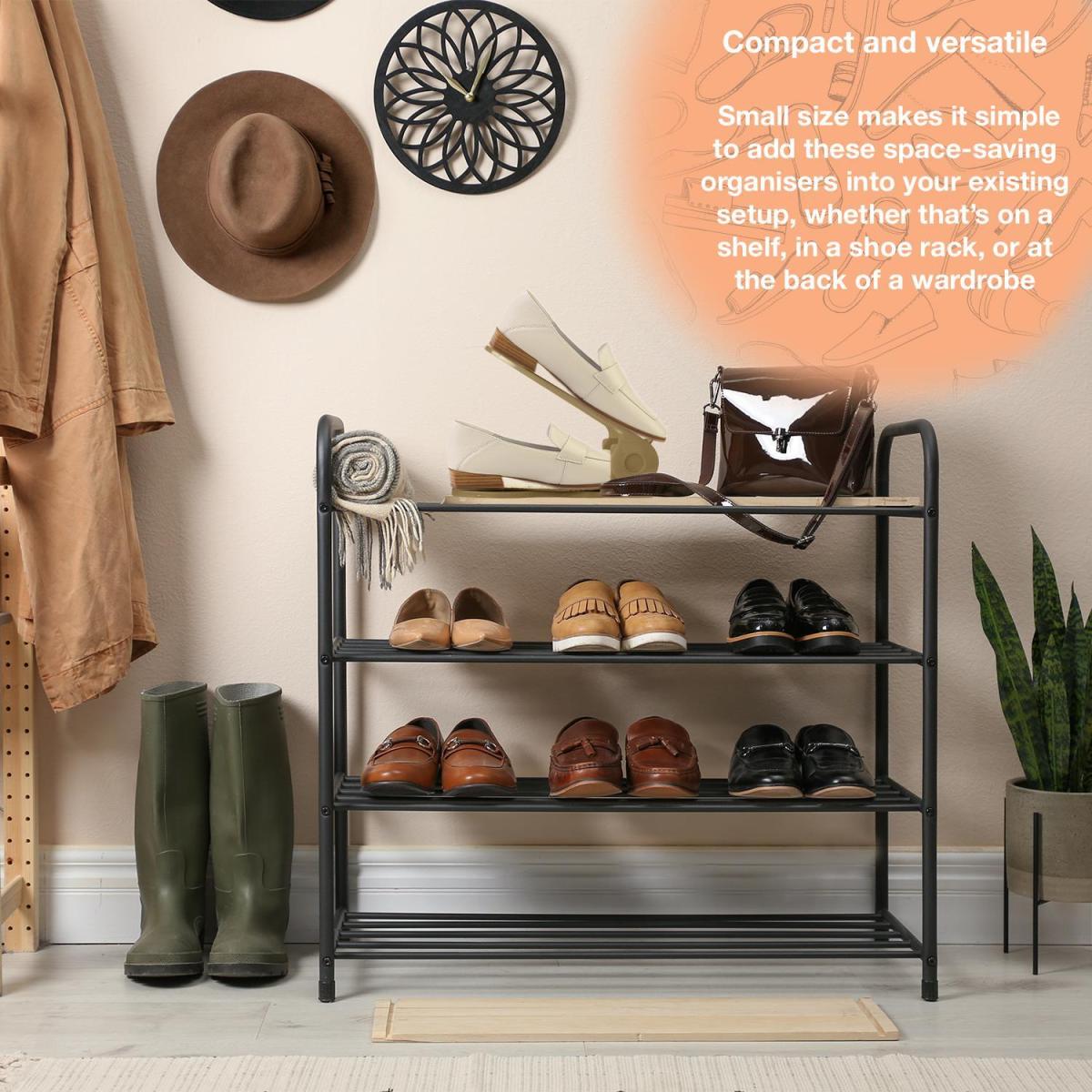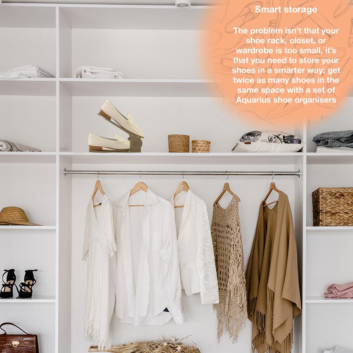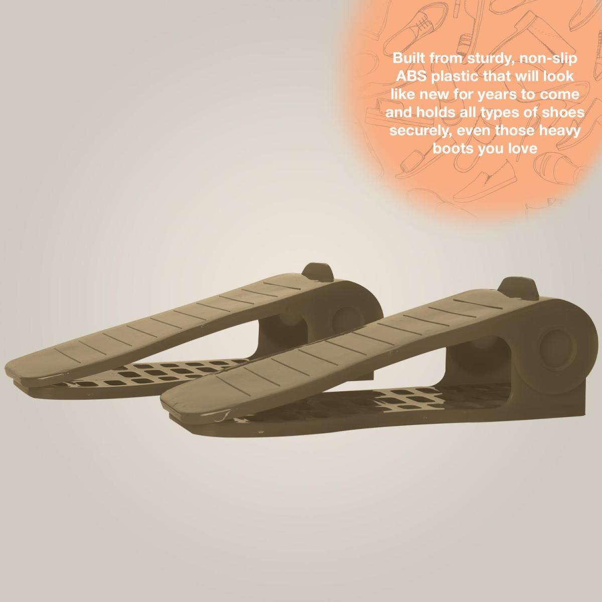 Haven Space Saver Standard Size Shoe Organizer These space-optimizing shoe Organizers will help you to double your shoe storage space in a snap. Safe and skip proof, uneasy to fall off, multi Colors, beautiful and durable. One size fits most standard shoe sizes. Ideal for small spaces dorm rooms, children closets, small closets. Anywhere you want to organize your shoes and still have plenty of space left over, multi Colors, are beautiful and durable. Snap joint on the bottom, the shoes would not fall off easily. Double your storage capacity with the best possible space-saving solution for your shoes in the bedroom, closet, and wardrobe. Stack all your shoes with this modern and fun design. With a simple yet smart design, a lot of organizers can bid farewell to a jumble of shoes in a snap and find the perfect pair instantly. Very easy to clean, just use water and soap. Sturdy and durable material, non-slip ABS plastic, strong enough to support the weight of your shoes. You can save space for all your shoe pairs on existing shelves, cabinets, decks, or on the floor. Can be a great gift for your family, parents, or friends who like to keep their living area tidy or like to collect shoes.
