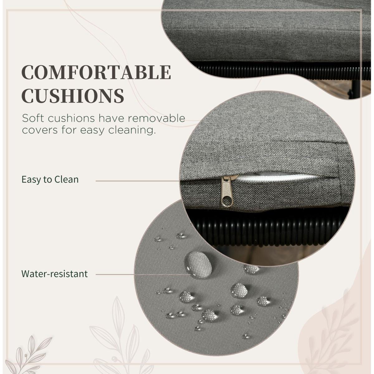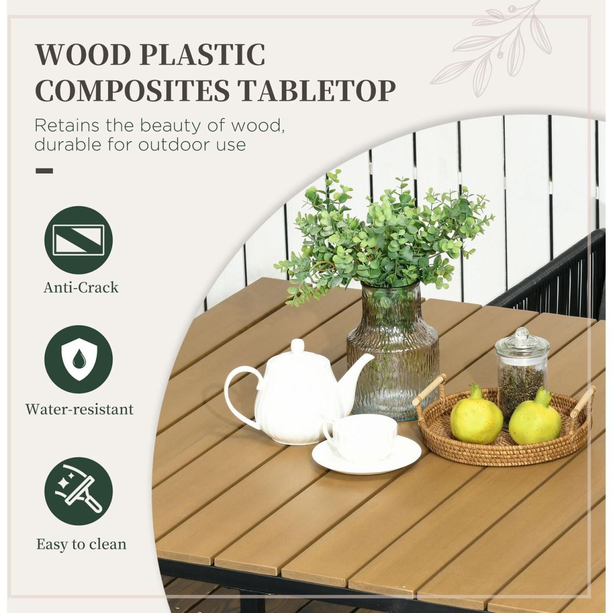 An inviting setting for all ideal for garden and other outdoor areas: this Outsunny five-piece garden set. It comes with four armchairs and a square dining table - room for you to sit down and gather round together. Solid metal for a strong frame, with plastic wicker for the chairs to offer double the durability, the fringed design creates a very cool look. The wood-effect plastic tabletop is tough and easy to clean. Both chairs and stools come with padded cushions for comfort.