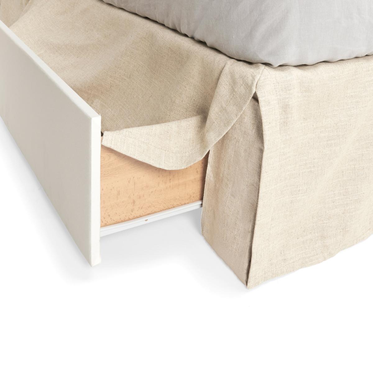 Our divan bed comes with storage drawers and is covered in a crisp, white fabric rather than that horrible swirly stuff you see covering other divans.
