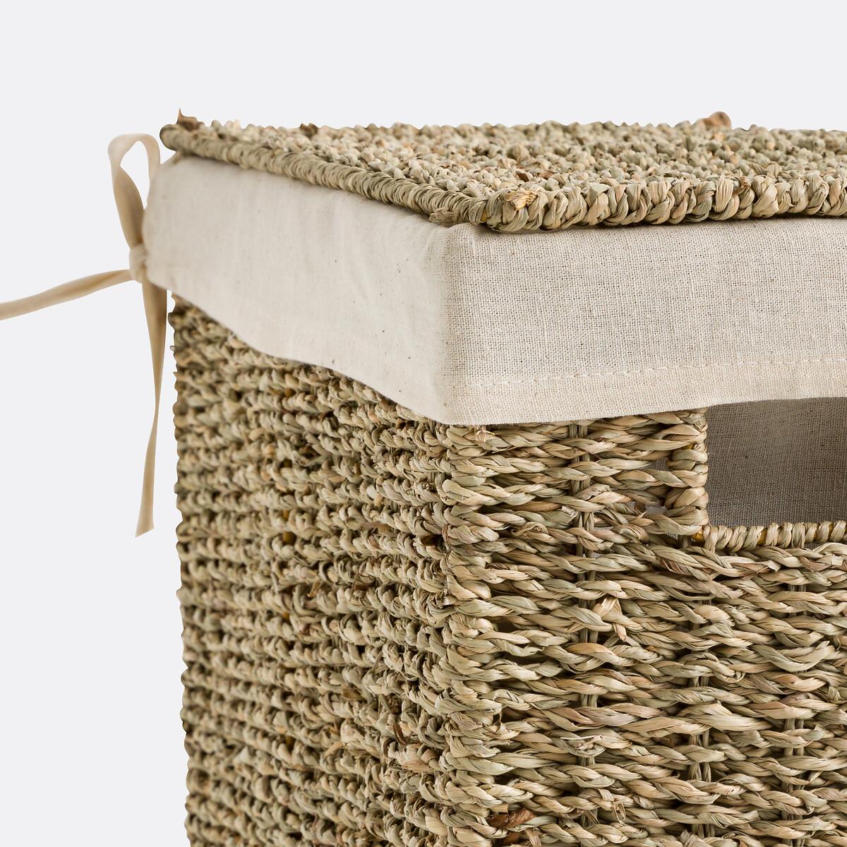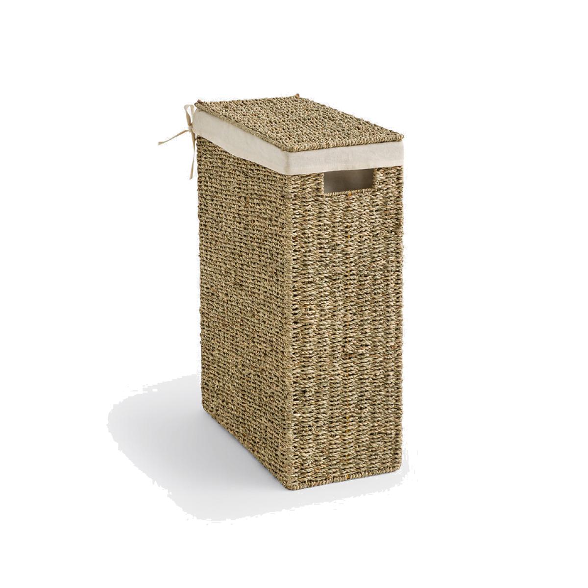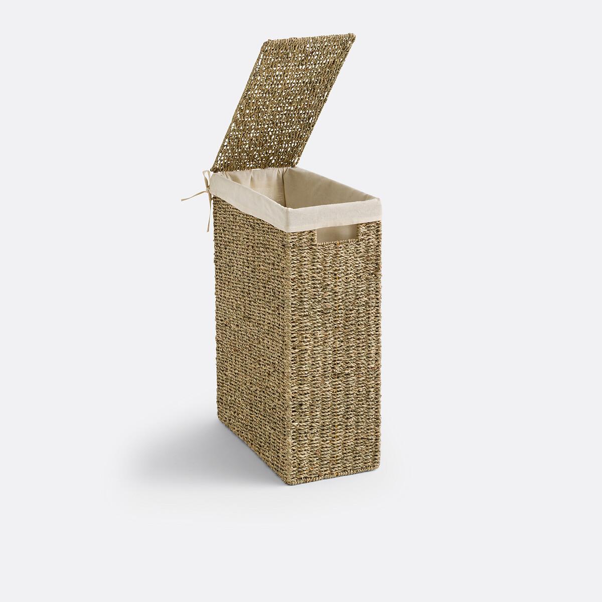 A special space saver, the Spacio laundry basket in woven straw cleverly maximises storage thanks to its shallow depth. Ideal for small spaces : can be placed between 2 pieces of furniture, behind a door or near the washing machine. Product Details • Woven grass • With lid • Removable inner fabric lining • The colour may vary slightly from one product to another (more or less green)Dimensions • Depth: 21cm • Height: 58cm • Width: 43cm