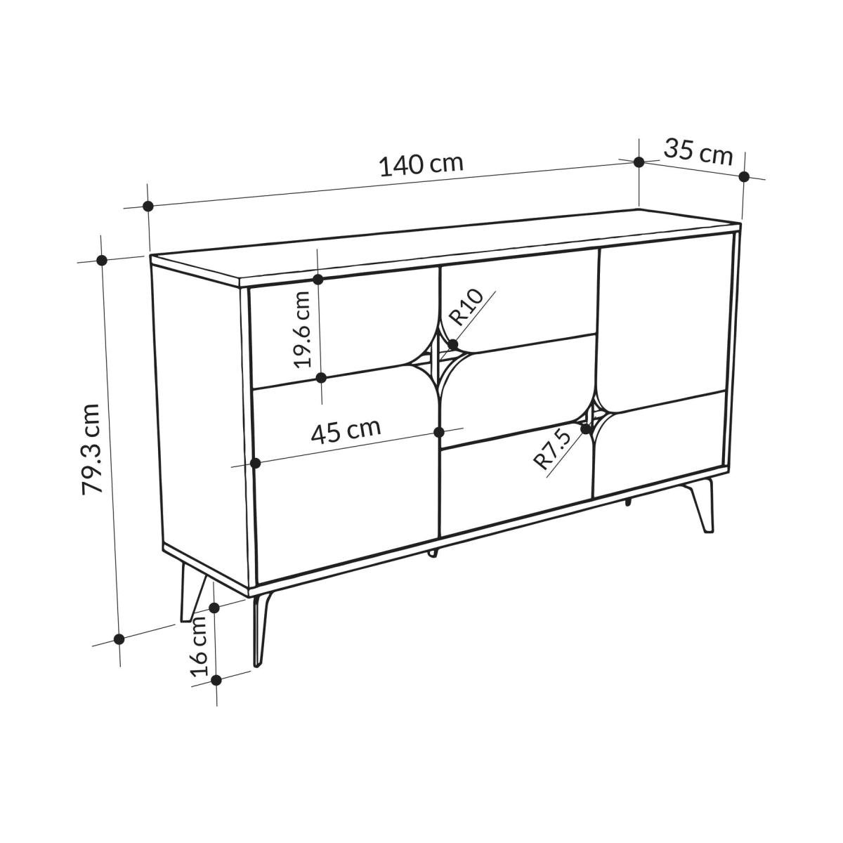 Upgrade your living room with our unique sideboard design. It offers ample storage with 3 cabinets and interior shelves for organization. Conveniently store essentials in the drawer. Choose from various colors to match your decor. Assembly required with included fittings and clear instructions. Crafted with high-quality engineered wood and protective melamine finish. Easy to maintain and clean with a damp cloth. Dimensions: 140 x 35 x 80 cm. Contact us for any inquiries. Secure packaging for delivery.