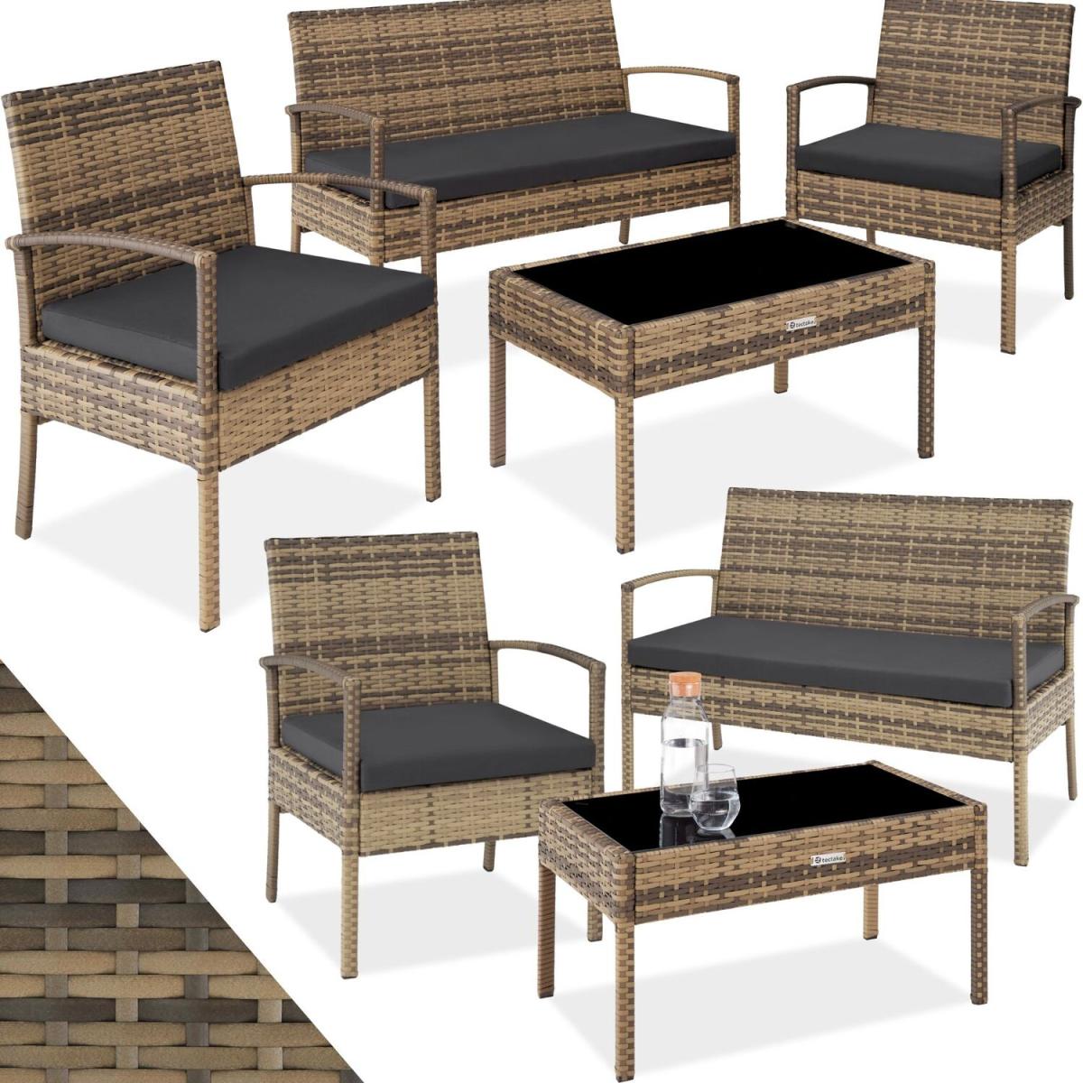 This smart rattan set by tectake is perfect for outdoor parties and socialising. The 4 seater outdoor furniture set features 2 chairs, 1 sofa and a small table with easy to clean glass top, perfect for outdoor dining and relaxing. The poly rattan material used has been specifically designed for garden furniture thanks to its high durability, weather resistance, sturdy frame and water-repellent cushion covers. Poly rattan is the overarching term for artificially produced weaved materials made of polyethylene which represent an industrially produced alternative to natural rattan. This artificial material is more durable and weather-resistant than its real counterpart and is also much lighter. The seat cushions are perfectly visually coordinated with the dark, elegant design of the furniture and guarantee great sitting comfort with a thickness of approximately 5.5 cm. They are made from water-repellent PU materials that can be cleaned with little effort. Add the Sparta rattan set by tectake to your garden, patio or balcony and ensure outdoor comfort for the summer months.