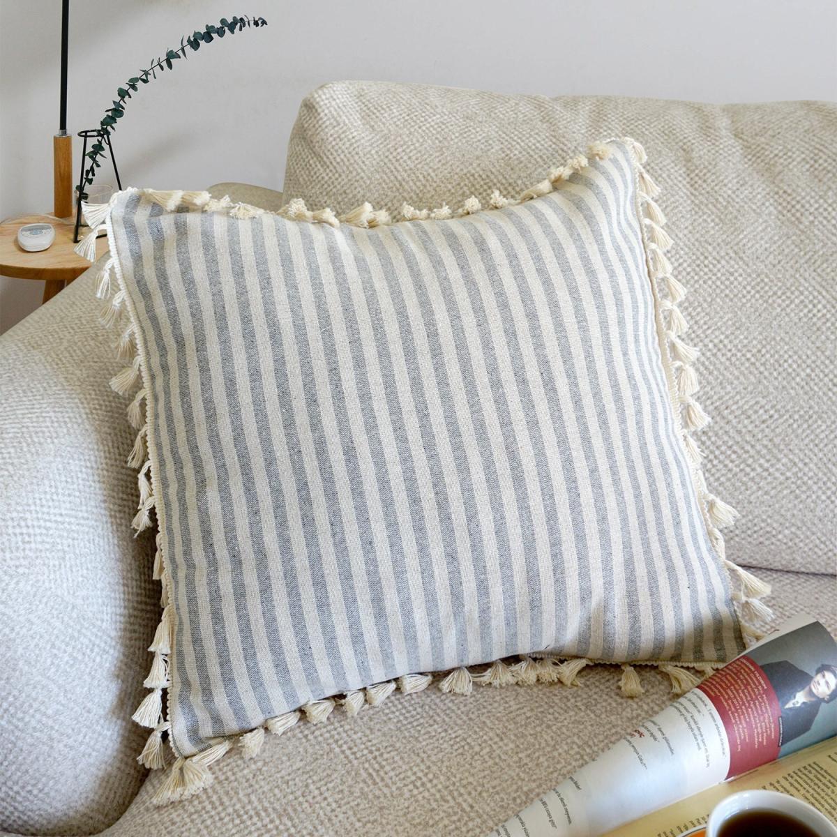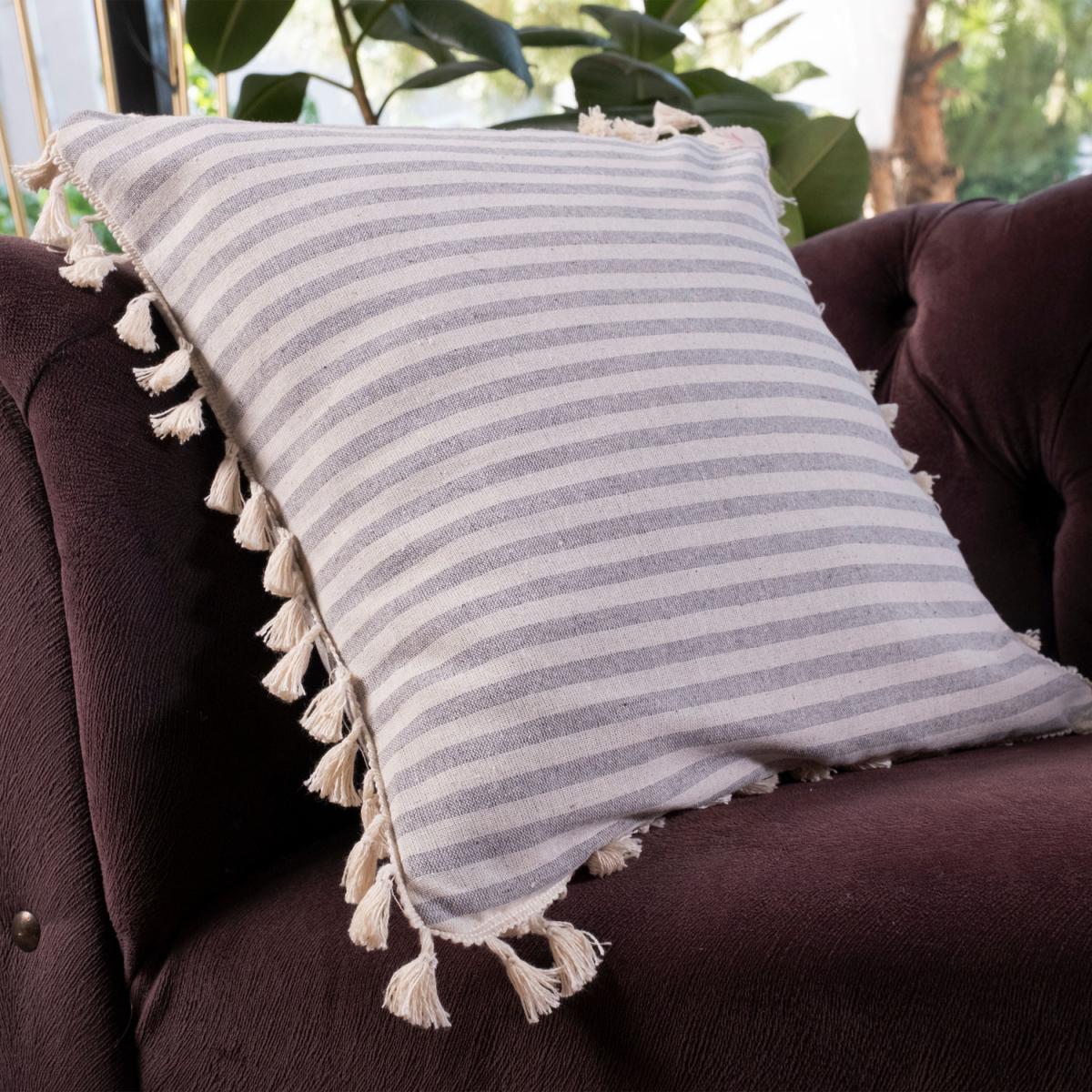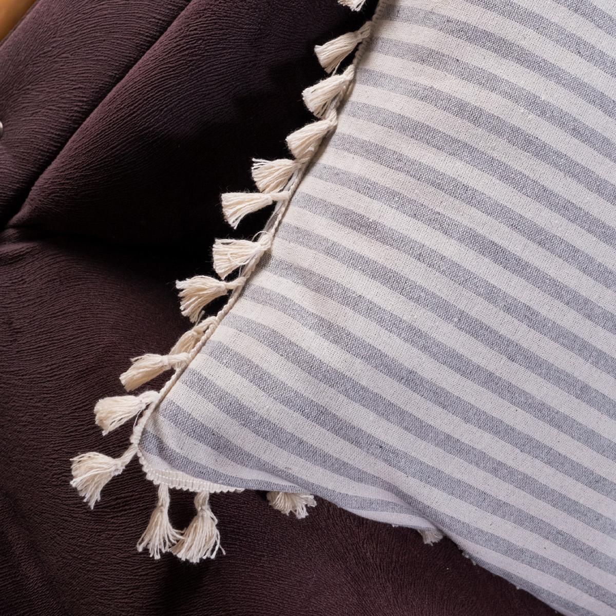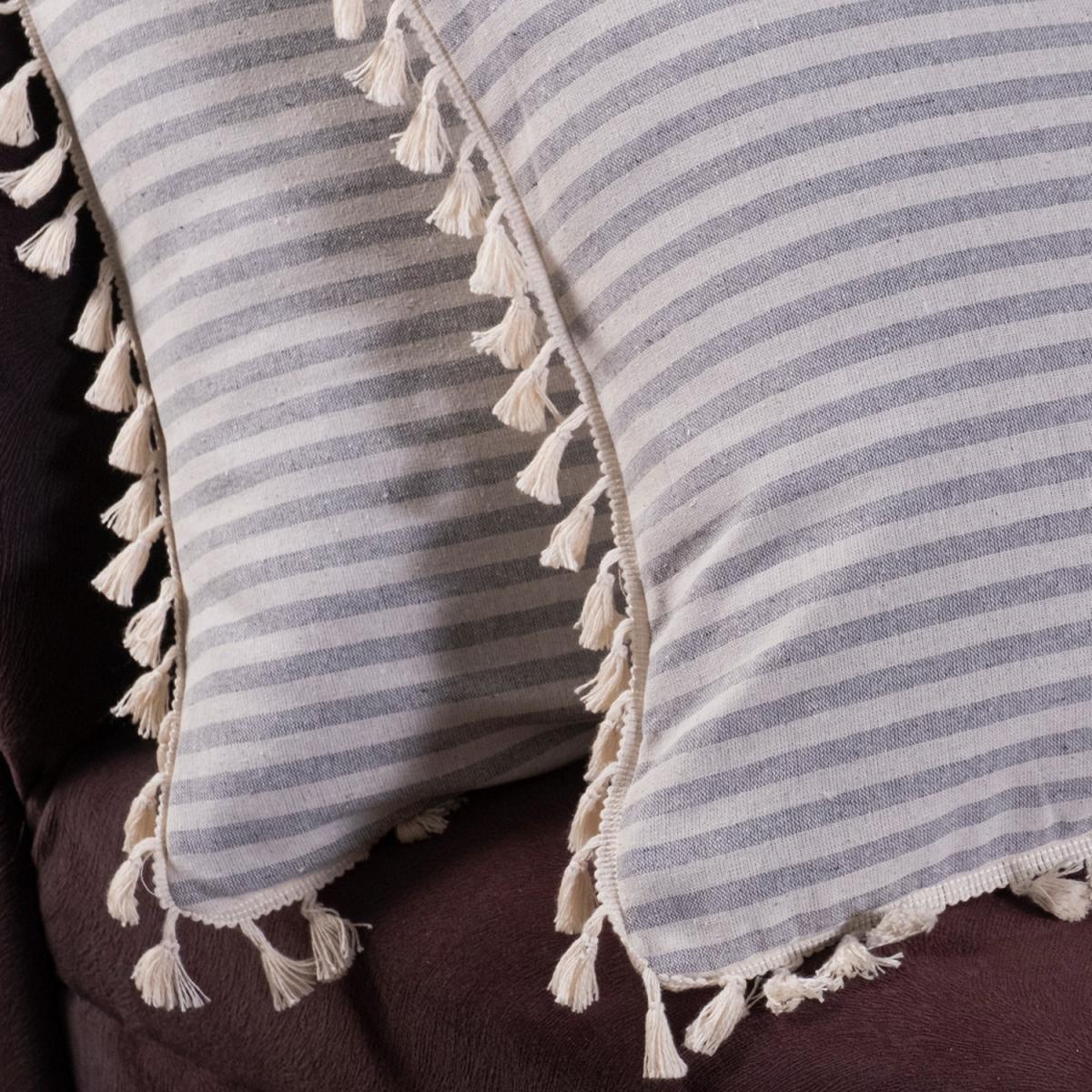 Special Designed Organic Linen Striped Pillow Shams with Pompom Edges - Light Grey