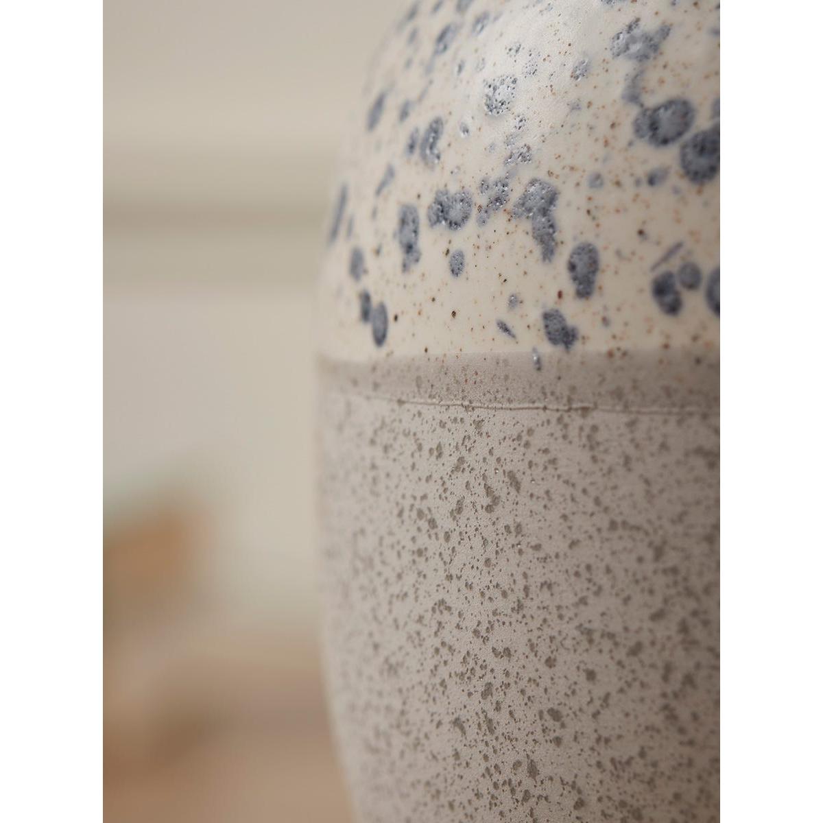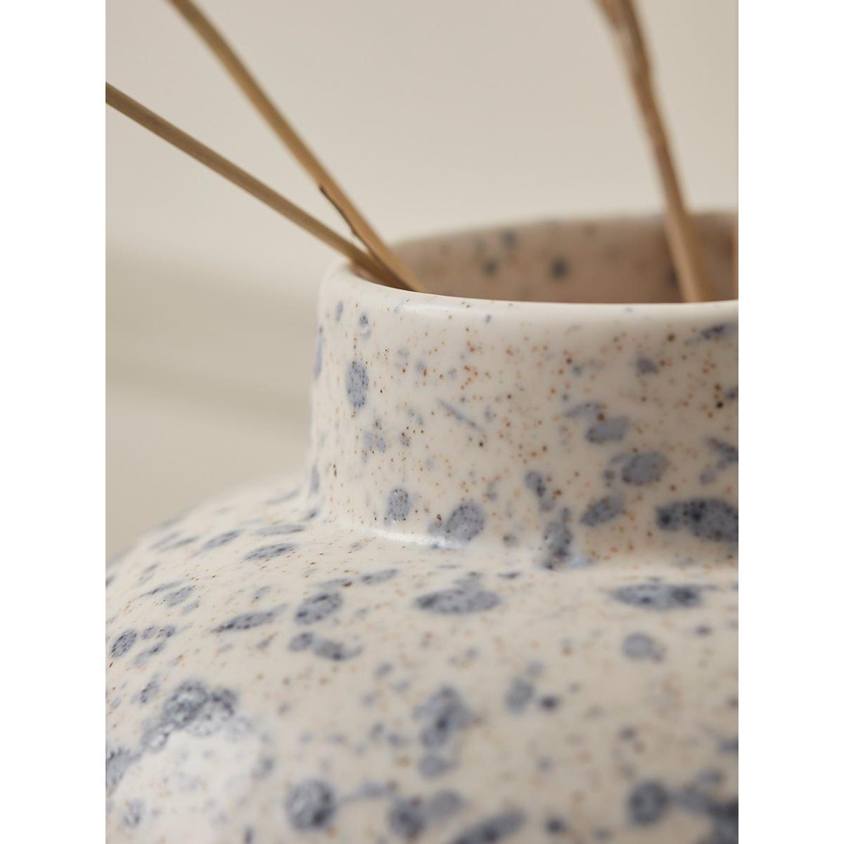 Confetti like speckles in the prettiest of cornflower blues adorn the glazed upper portion of this earthenware vase. The wide bowl shaped body is a dimpled cement colour and the mouth ends with a low collar.  A delightful ornament in itself, the vase also pairs well with dried flowers and grasses which complement the nature inspired palette.