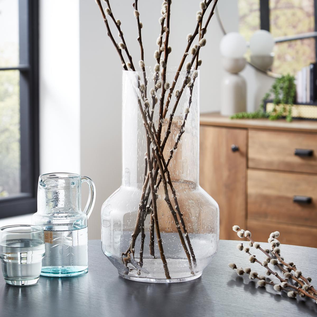 I love this tall glass vase for its versatility and simplicity. Its clear, speckled design adds subtle texture without overpowering other decor, making it perfect for both minimalist and eclectic interiors. It works especially well in modern or Scandinavian schemes where clean lines and natural elements are key. For styling, I recommend pairing it with natural stems or dried botanicals like reeds or pussy willow for an organic touch, and placing it on a dining table or sideboard to add height and visual interest. Its transparency allows it to blend seamlessly into various colour palettes, making it a reliable choice for elevating everyday arrangements or creating striking centrepieces.