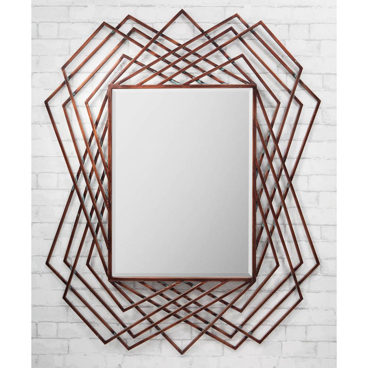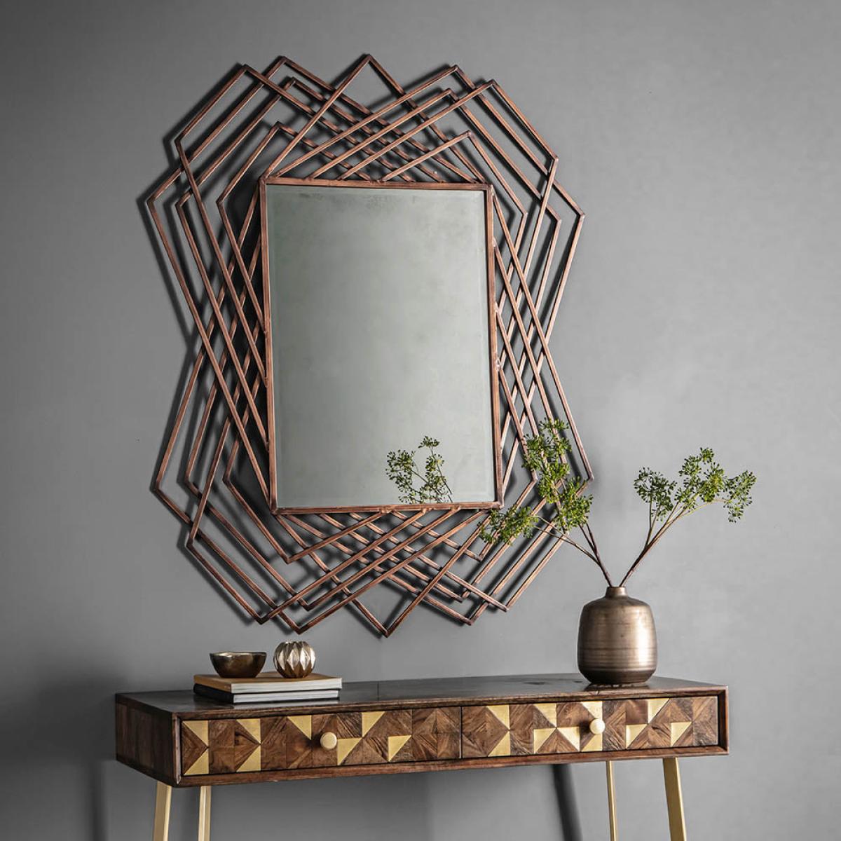 Striking feature mirror with a bold geometric frame in an burnished copper finish.