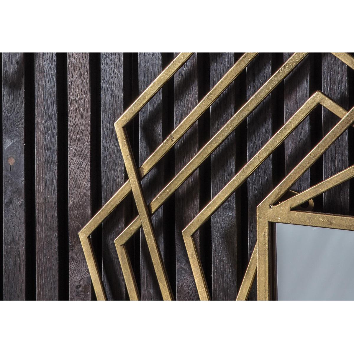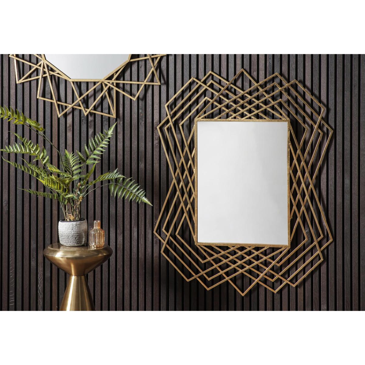 This stunning wall mirror showcases innovative design and is beautifully rendered in metal with a gold-toned finish. The bold and contemporary geometric frame has an elegant fluidity to it. Why you'll love it This stunning wall mirror is a real statement piece. Gold-toned geometric frame. This mirror’s depth and dimensionality add to the drama. Perfect for a feature wall. This rectangular mirror is part of the Furniture Village home accessories collection. What you need to know Iron frame. Hangs vertically or horizontally. For indoor use only. To clean, apply cleaner to a soft, lint-free cloth and then wipe surface. Use water-based cleaners. Do not spray cleaner directly onto the mirror. Be sure to thoroughly dry the edge where the mirror meets the frame. Dimensions Height: 110 cm (44 in). Width: 95 cm (38 in). Depth: 4 cm (2 in). Item code:SPECMIRRGOLD-001