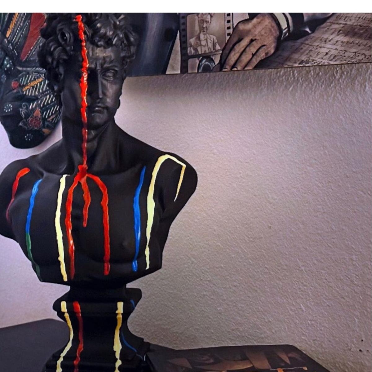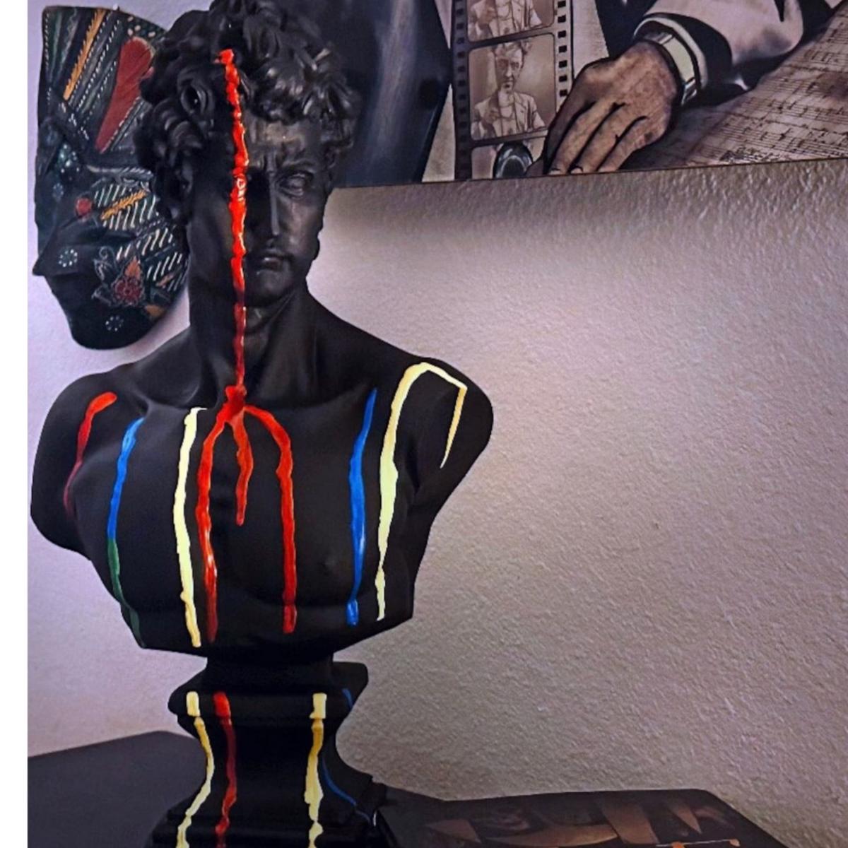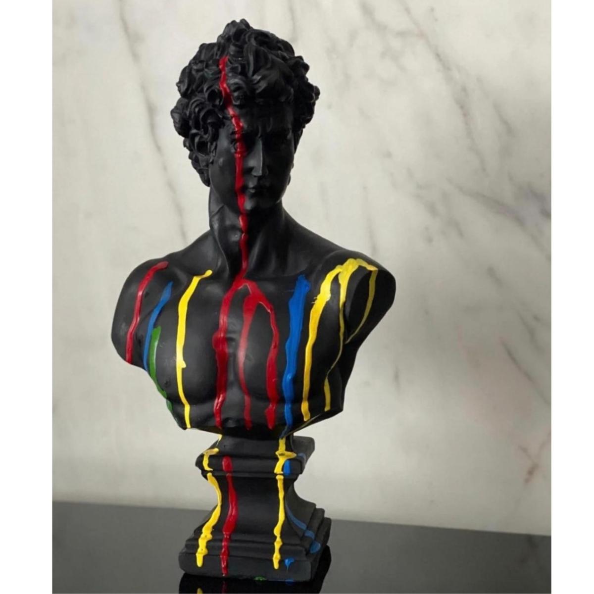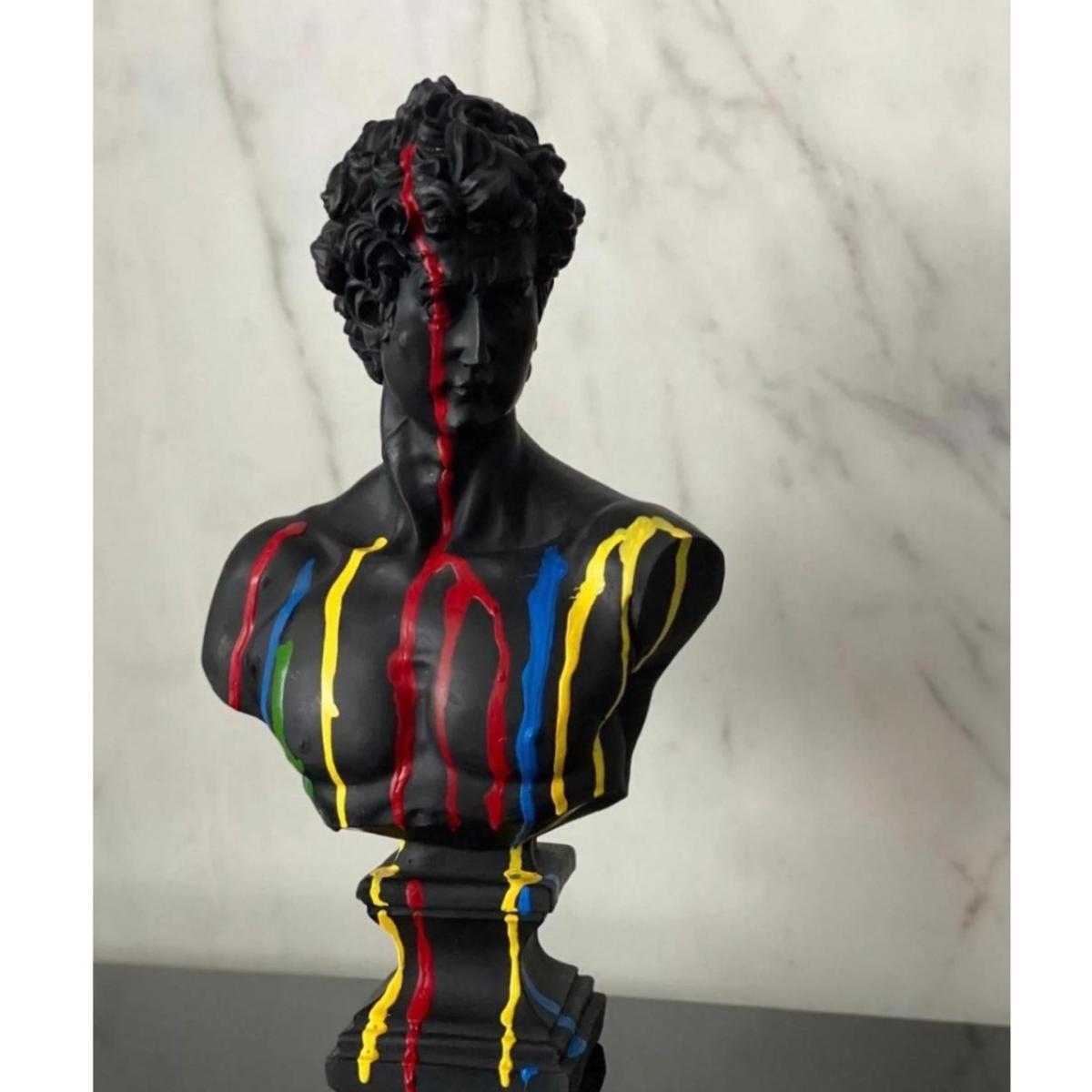 "Spectrum David" - A Bold Reinterpretation of Classical Art Introducing Spectrum David, a striking sculpture that reimagines Michelangelo’s classic masterpiece with a contemporary twist. This 43 x 24 x 24 cm sculpture features David in a sleek black finish, with vibrant colors splashed across his form, creating a powerful contrast that adds energy and modernity to a timeless figure. The vibrant hues dripping over the sculpture symbolize the fusion of classic art with contemporary creativity, making Spectrum David an eye-catching statement piece for any art lover’s collection. Gently dust your sculpture with a soft, dry cloth or a feather duster.