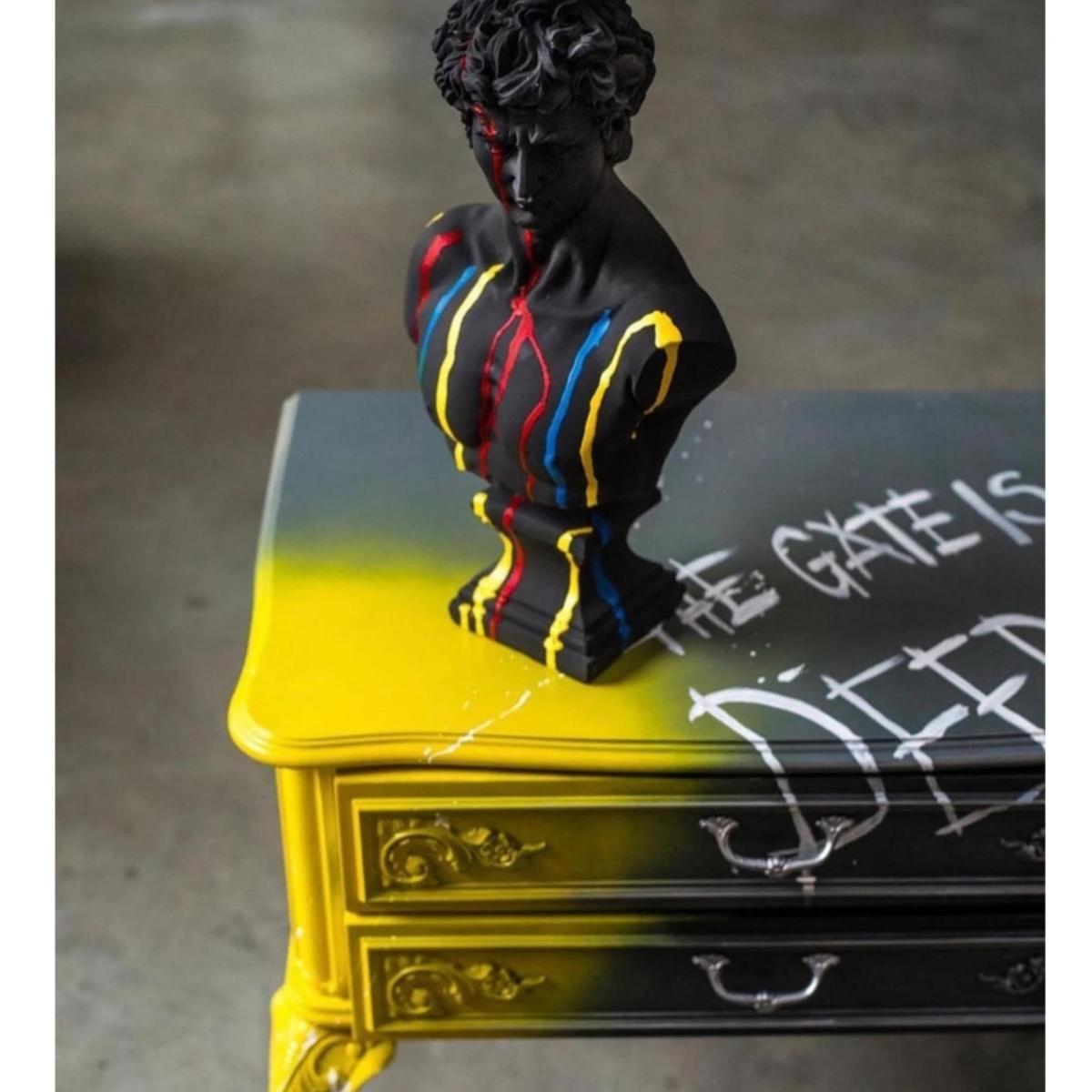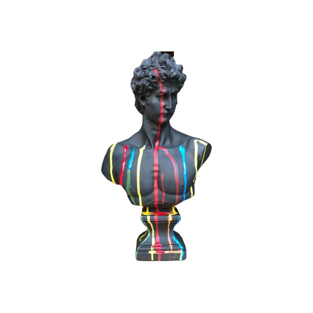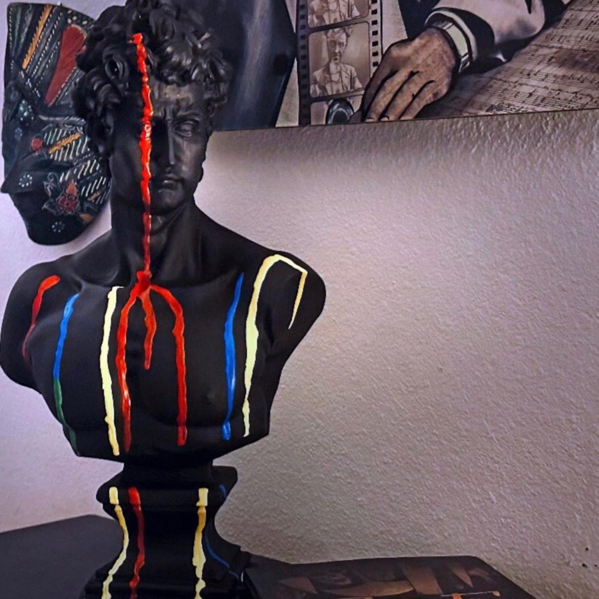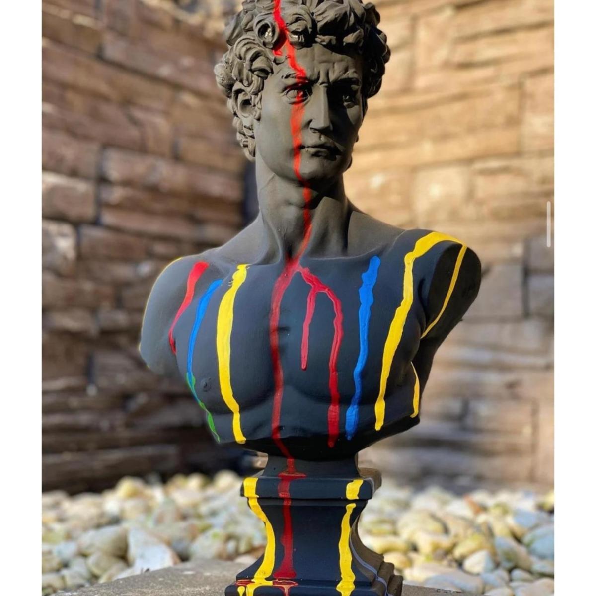"Spectrum David" - A Bold Reinterpretation of Classical Art Introducing Spectrum David, a striking sculpture that reimagines Michelangelo’s classic masterpiece with a contemporary twist. This 43 x 24 x 24 cm sculpture features David in a sleek black finish, with vibrant colors splashed across his form, creating a powerful contrast that adds energy and modernity to a timeless figure. The vibrant hues dripping over the sculpture symbolize the fusion of classic art with contemporary creativity, making Spectrum David an eye-catching statement piece for any art lover’s collection. Gently dust your sculpture with a soft, dry cloth or a feather duster.