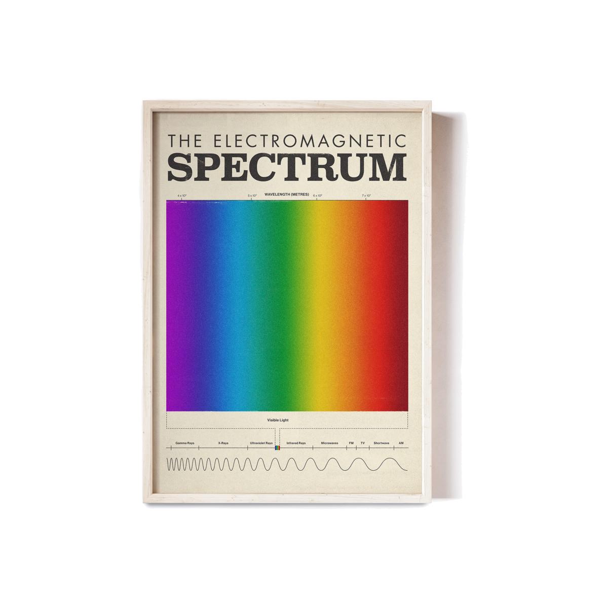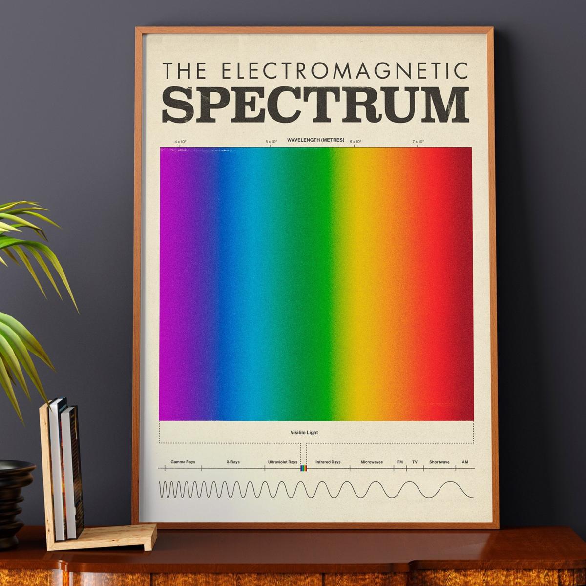 Back to school with a fresh mid-century inspired science print. Brush up on your physics with a big pop of colour to brighten your space. Original Art print of The Electromagnetic Spectrum. Made in England, Sold without a frame.