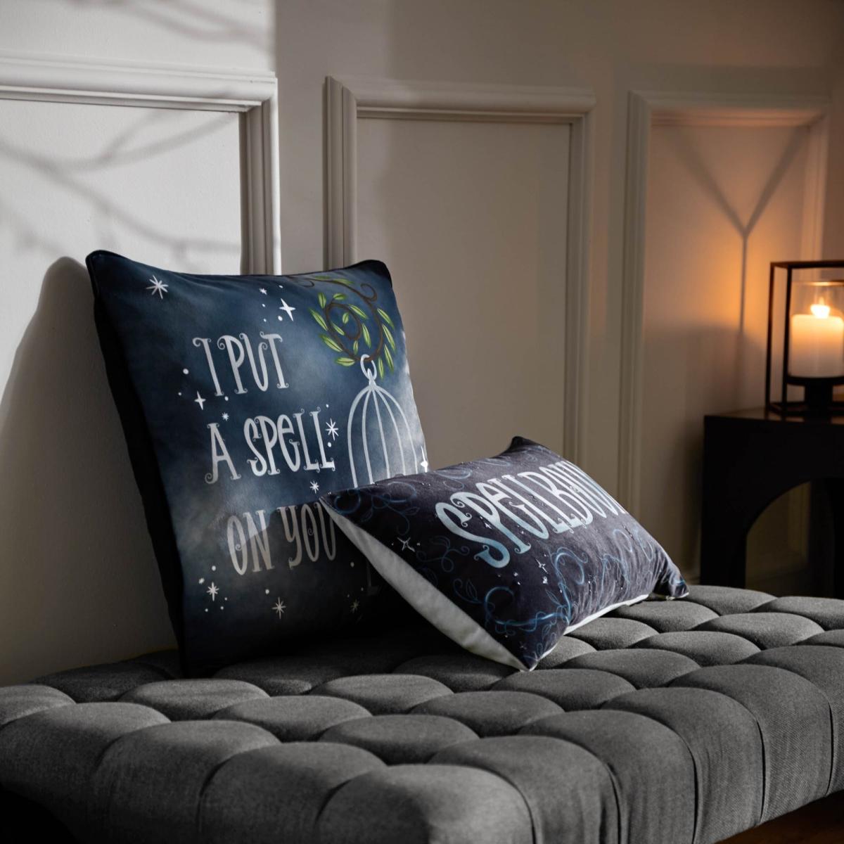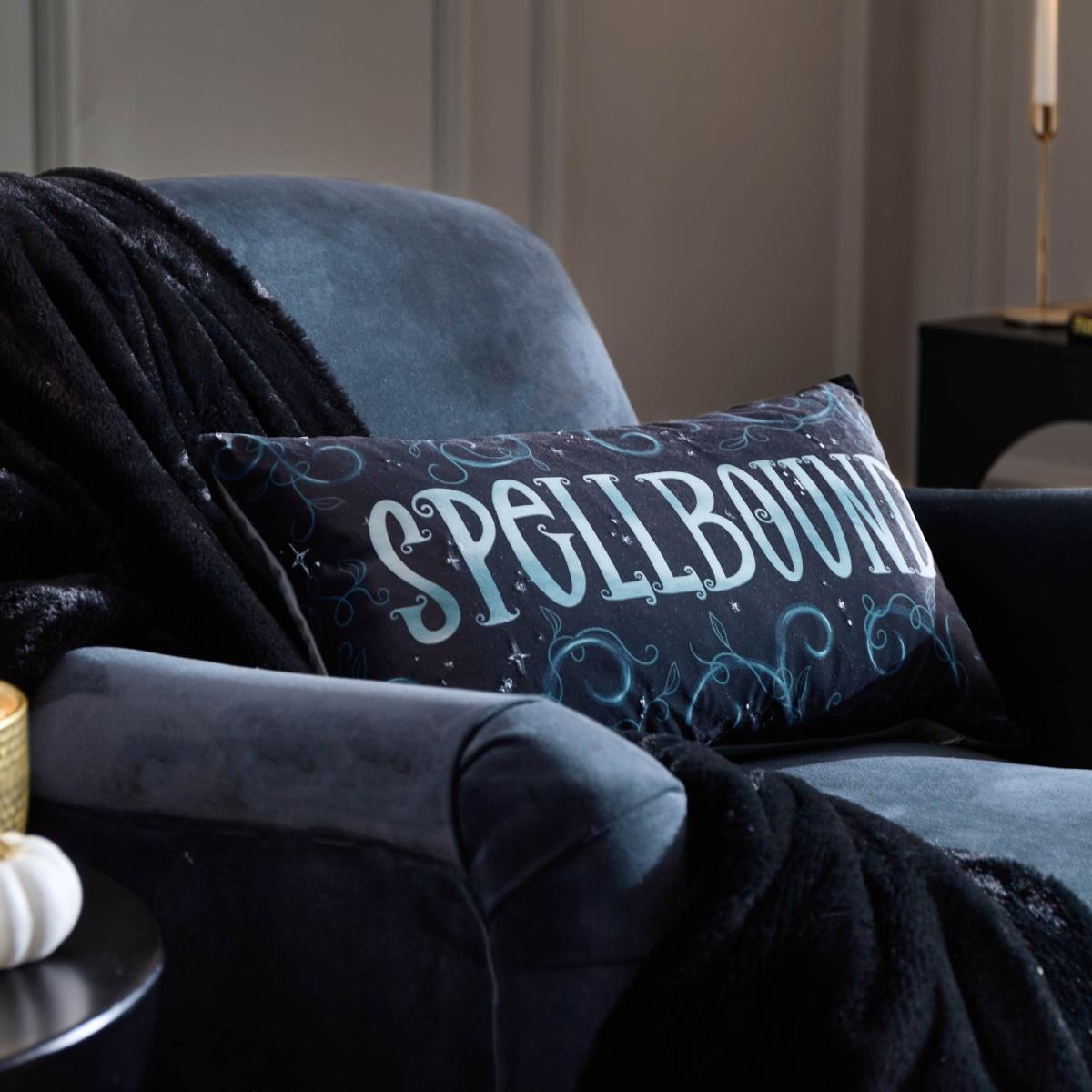 * Charming, Halloween design* Feather or polyester insert available* Rectangle shape* Dry clean only* Corresponding bedding available The Spellbound Cushion is the perfect Halloween accent for your space. Measuring 30cm x 50cm, this rectangular cushion showcases a spooky slogan design that captures the spirit of the season. With a plain velvet reverse for added softness, and available with either a feather or polyester insert, it's both stylish and comfortable. Pair it with the matching bedding to complete your Halloween-themed decor.