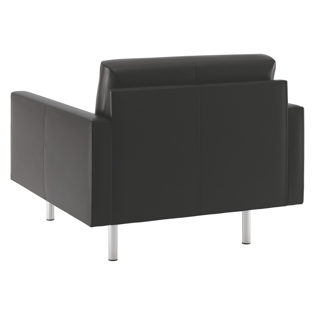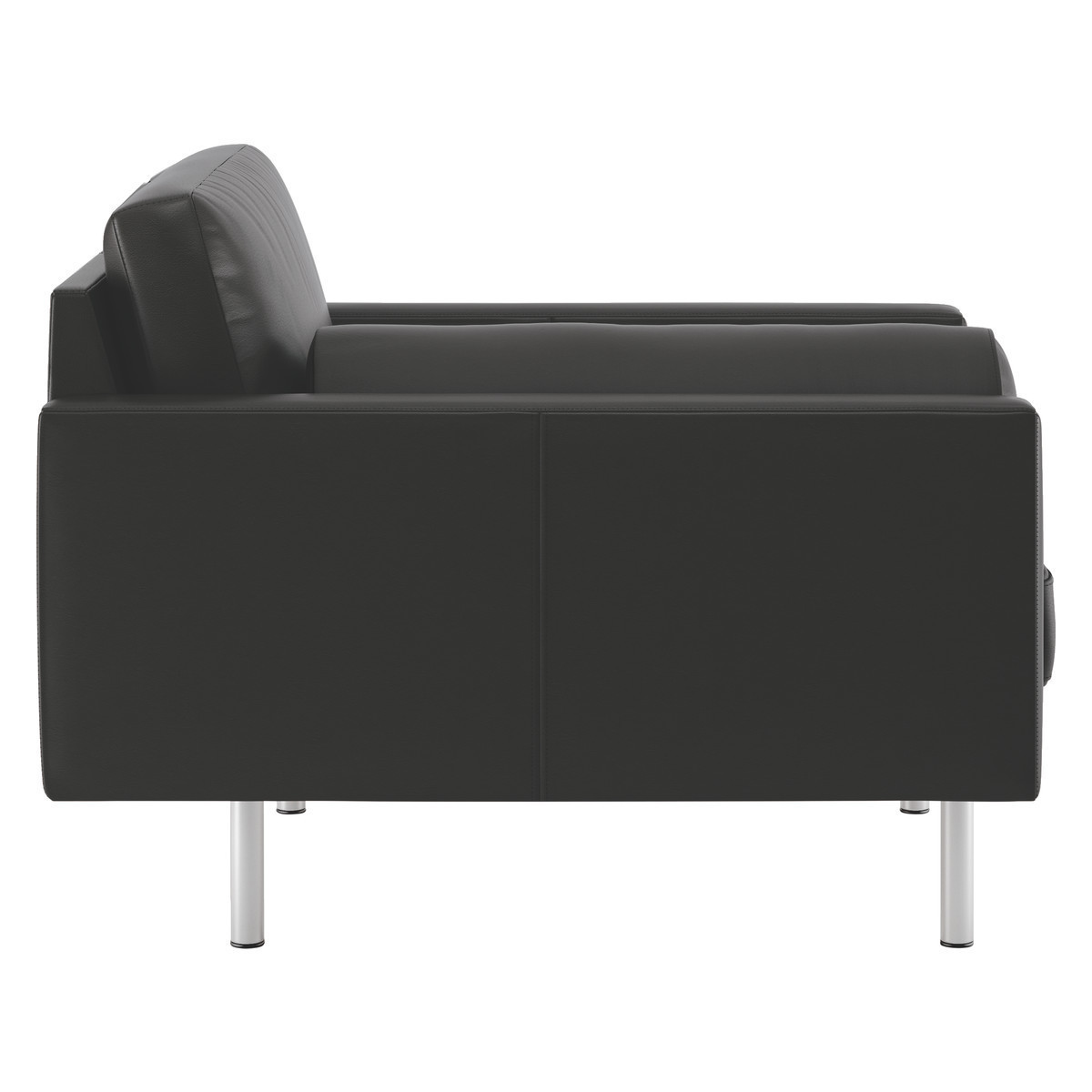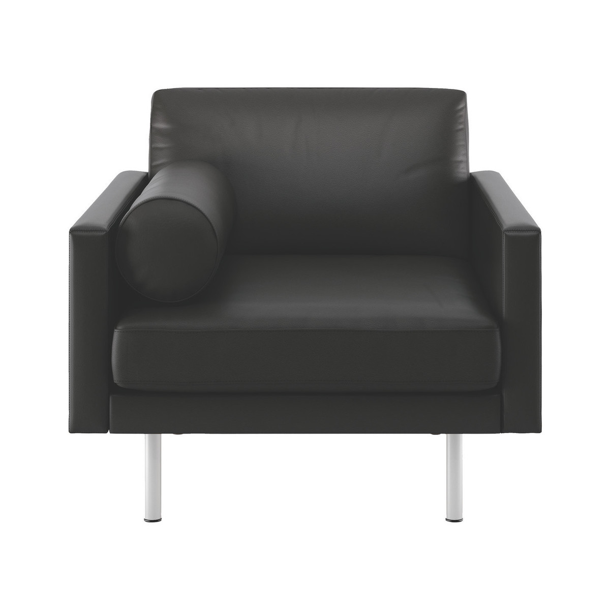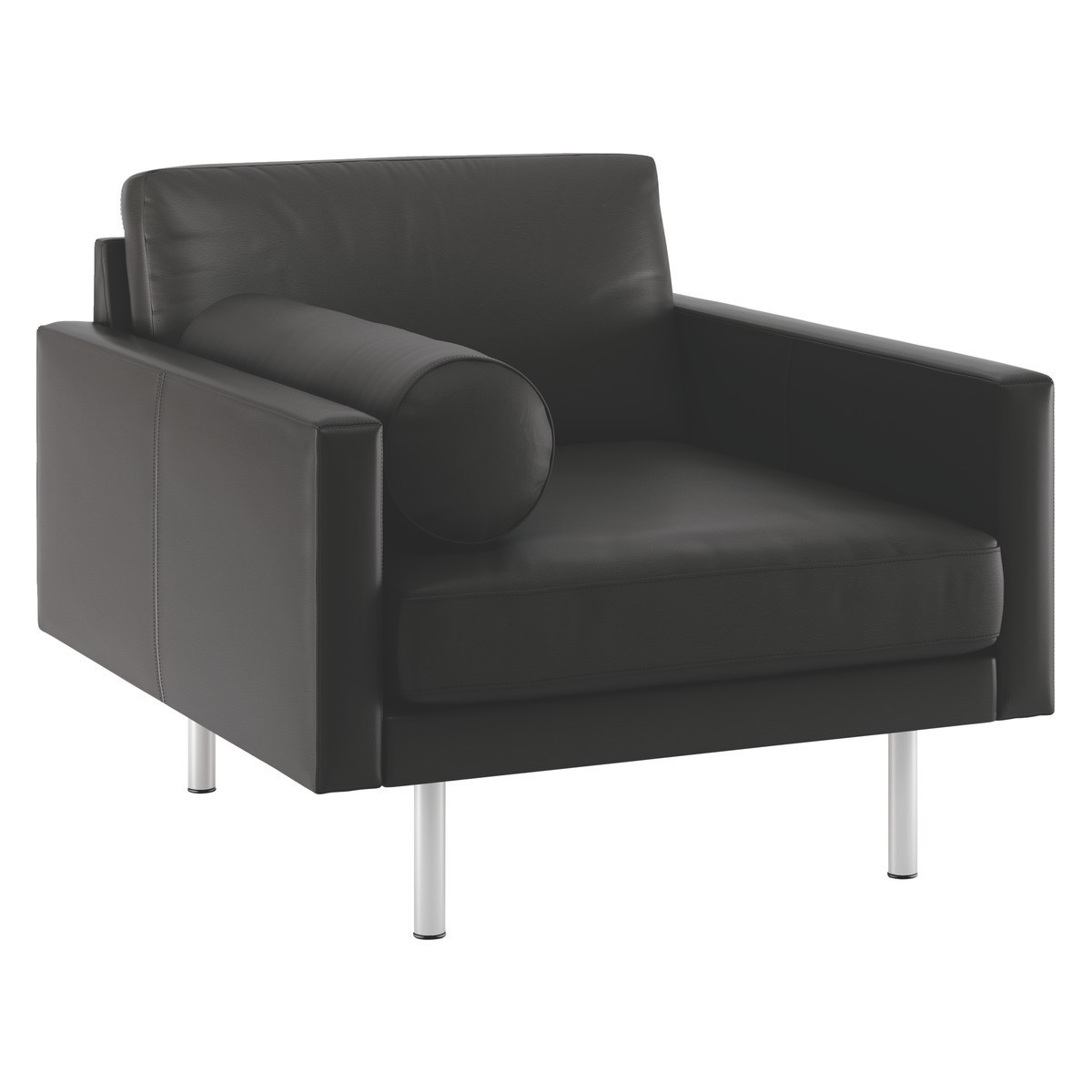 The luxurious Spencer black leather armchair sofa with metal legs is a sleek design that combines a slender, streamlined shape with soft cushions and 1 feather-filled bolster. Designed by and exclusive to Habitat, the Italian-made Spencer range comprises various sized sofas and an armchair in 3 types of leather, 3 types of fabric and in a choice of oak or metal legs.