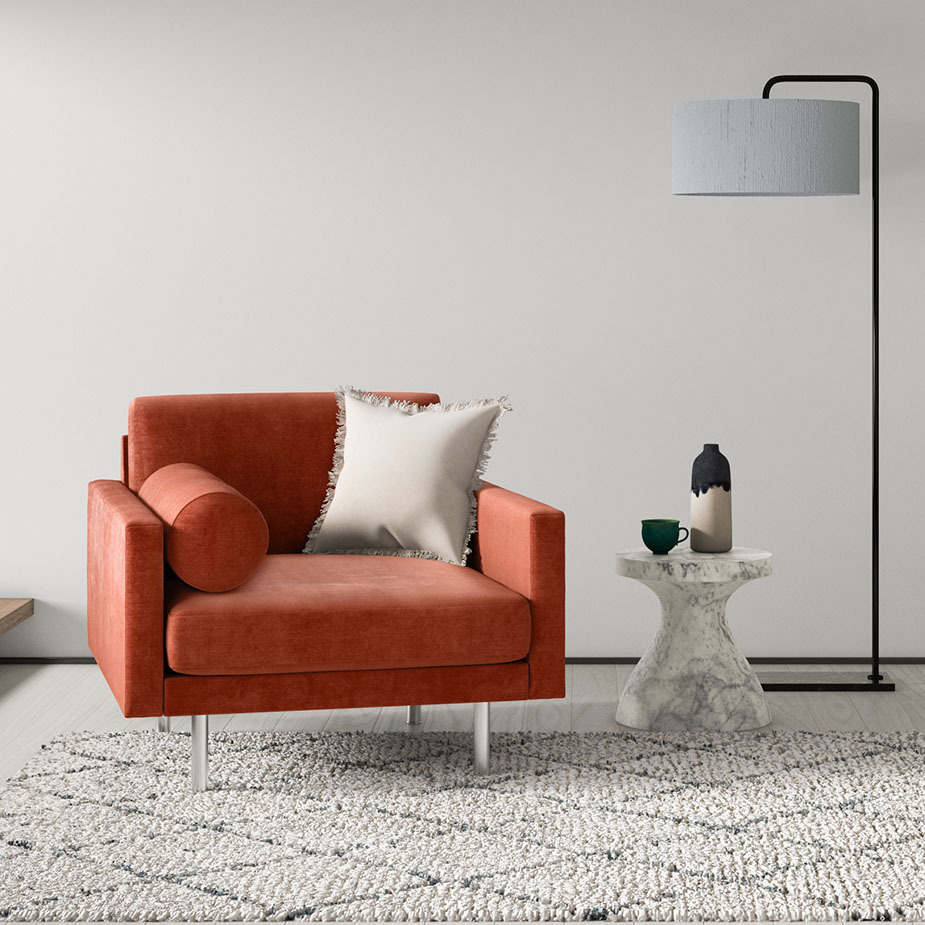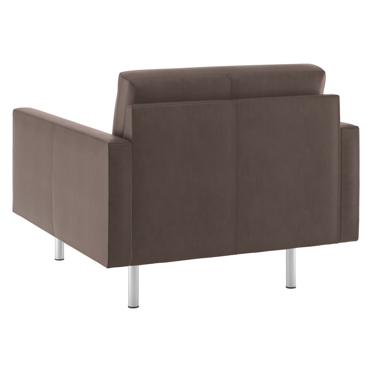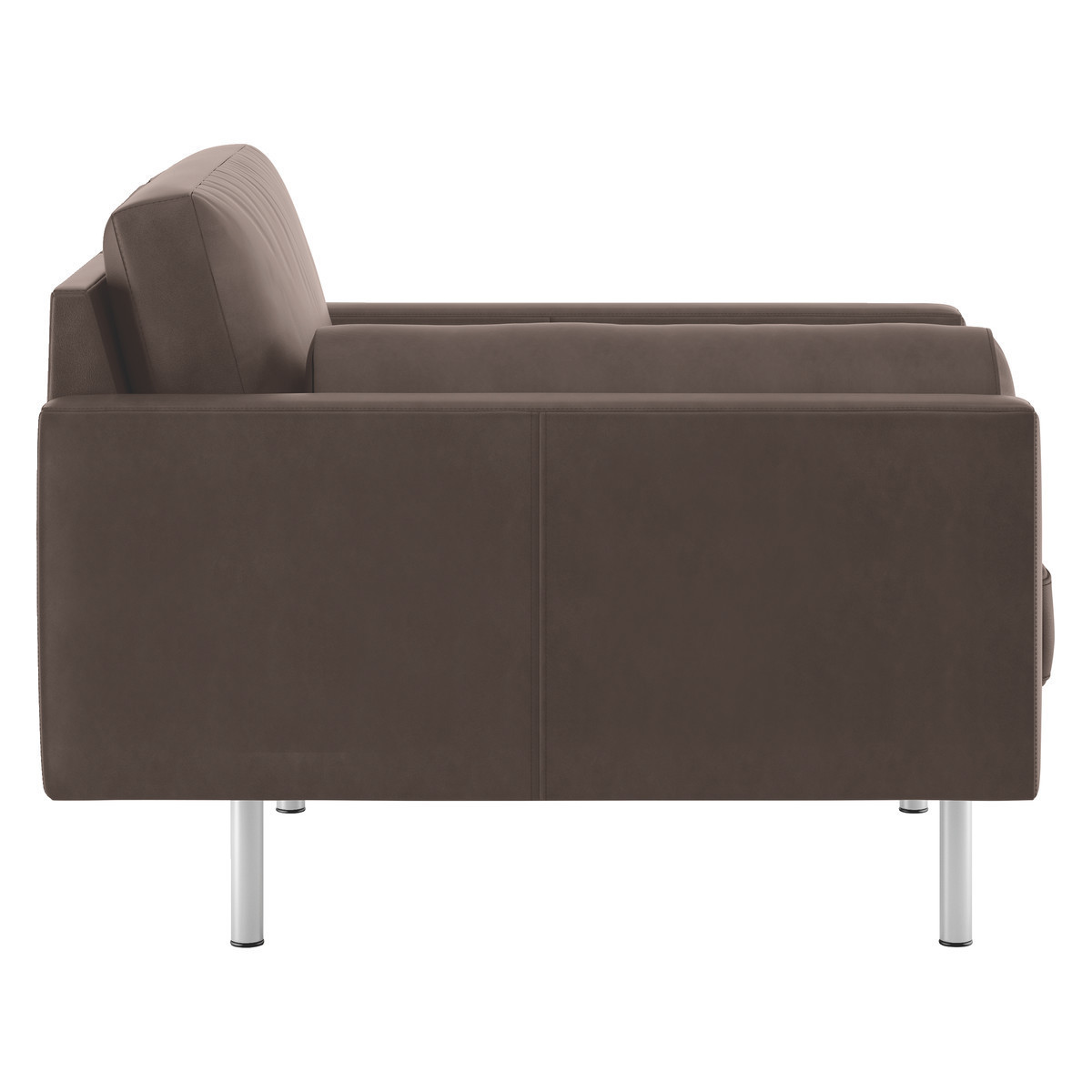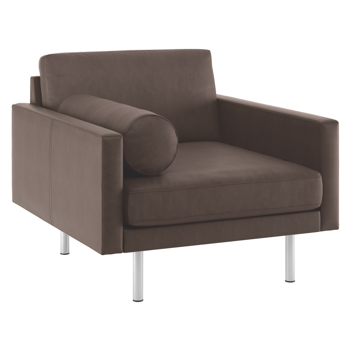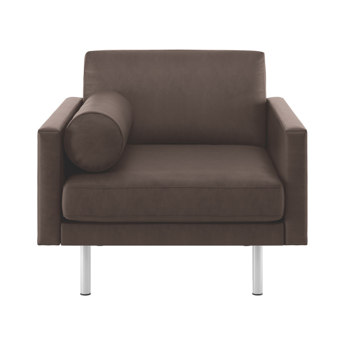 The luxurious Spencer dark brown luxury leather armchair sofa with metal legs is a sleek design that combines a slender, streamlined shape with soft cushions and 1 feather-filled bolster. Designed by and exclusive to Habitat, the Italian-made sofa is upholstered in aniline leather, which allows the natural characteristics of the hide to show through and it is the most premium natural looking leather available on the market. The Spencer range comprises various sized sofas and an armchair in 3 types of leather, 3 types of fabric and in a choice of oak or metal legs.