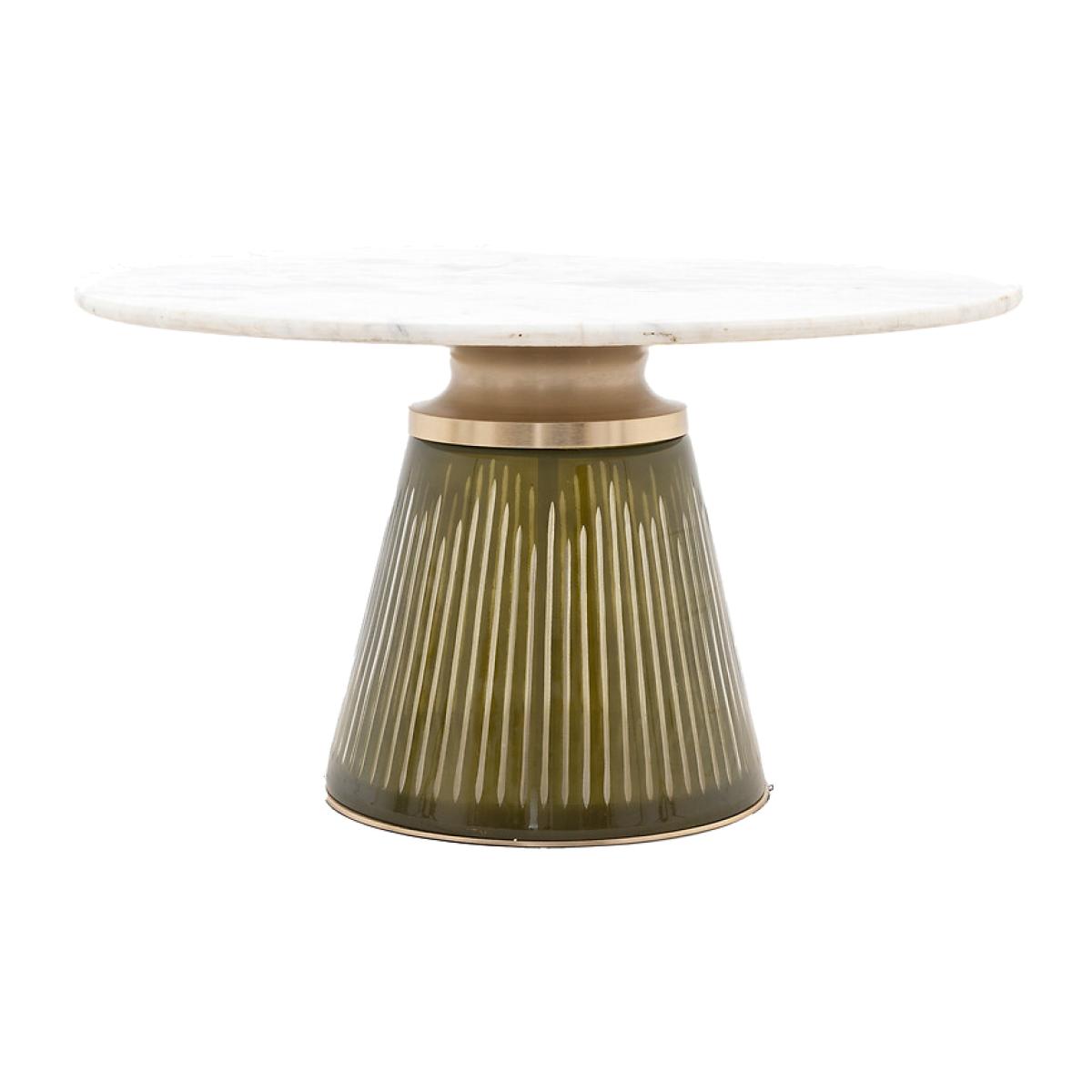 This coffee table is a stunning piece of furniture that combines luxury and elegance. The round marble tabletop provides a sleek and sophisticated surface, while the fluted glass base adds a touch of glamour and visual interest. The brass accents complete the opulent look, making this table a statement piece for any living room. Product Details• Marble top• Fluted glass base• Brass accents• Partial assembly required (top only)• Care advice - Wipe clean with a cloth• 12 months manufacturers warranty. Product Composition - Aluminimum / Glass / Marble Product Dimensions - 77 cm x 77 cm x 42 cm, Weight - 34.15 KG Clearnace to floor - 38 cm Package Dimensions - 59 cm x 49 cm x 49 cm, Weight KG This product will be dispatched by one of our trusted suppliers. You’ll be contacted by their selected courier about your delivery. Please note: this product cannot be delivered to all Offshore Islands, Northern Ireland or Republic of Ireland.