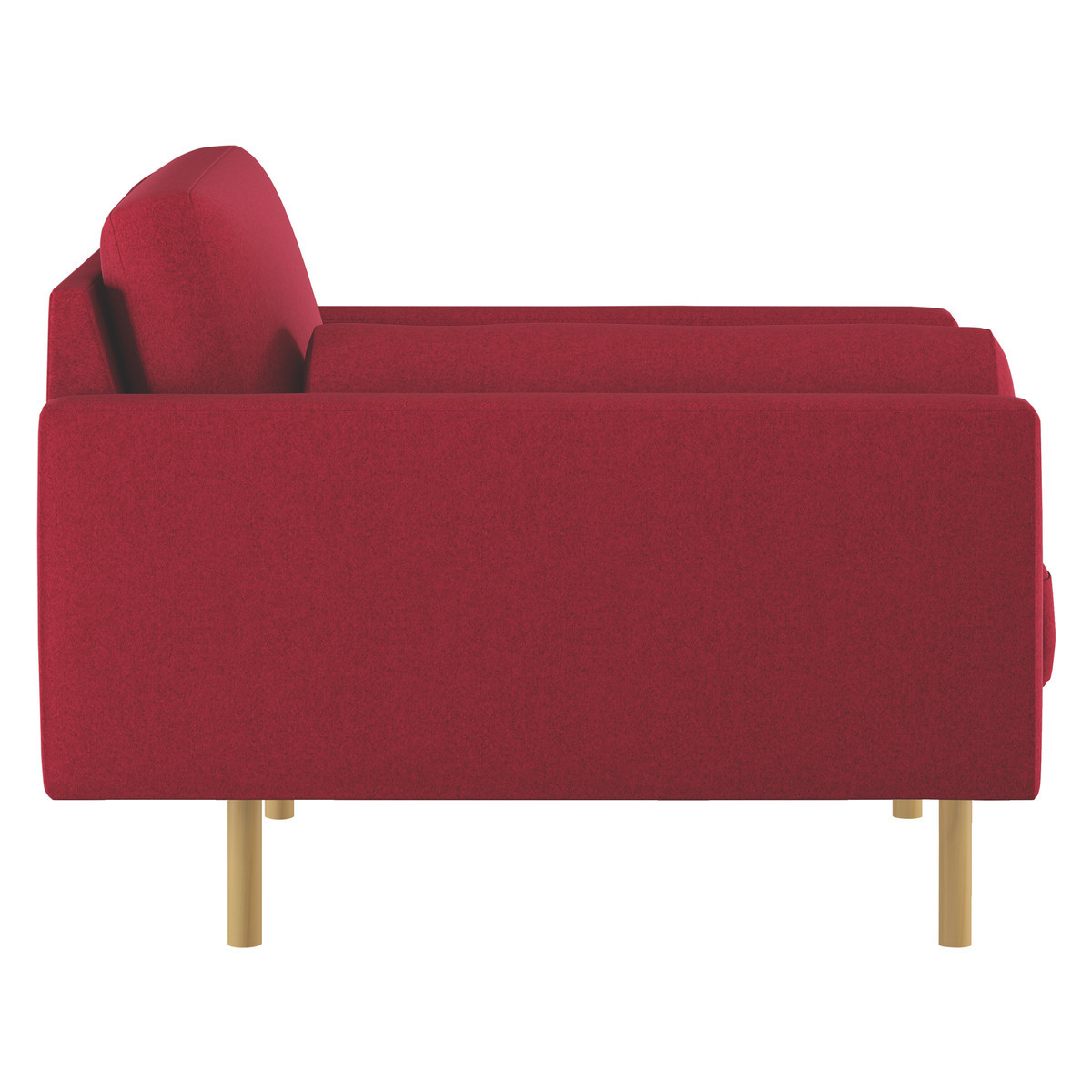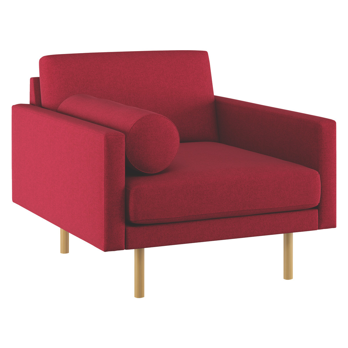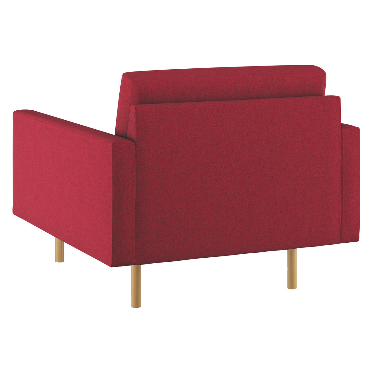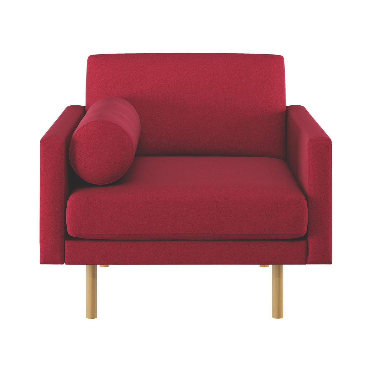 The luxurious Spencer red wool armchair sofa with oak legs is a sleek design that combines a slender, streamlined shape with soft cushions and 1 feather-filled bolster. Designed by and exclusive to Habitat, the Italian-made Spencer range comprises various sized sofas and an armchair in 3 types of leather, 3 types of fabric and in a choice of oak or metal legs.