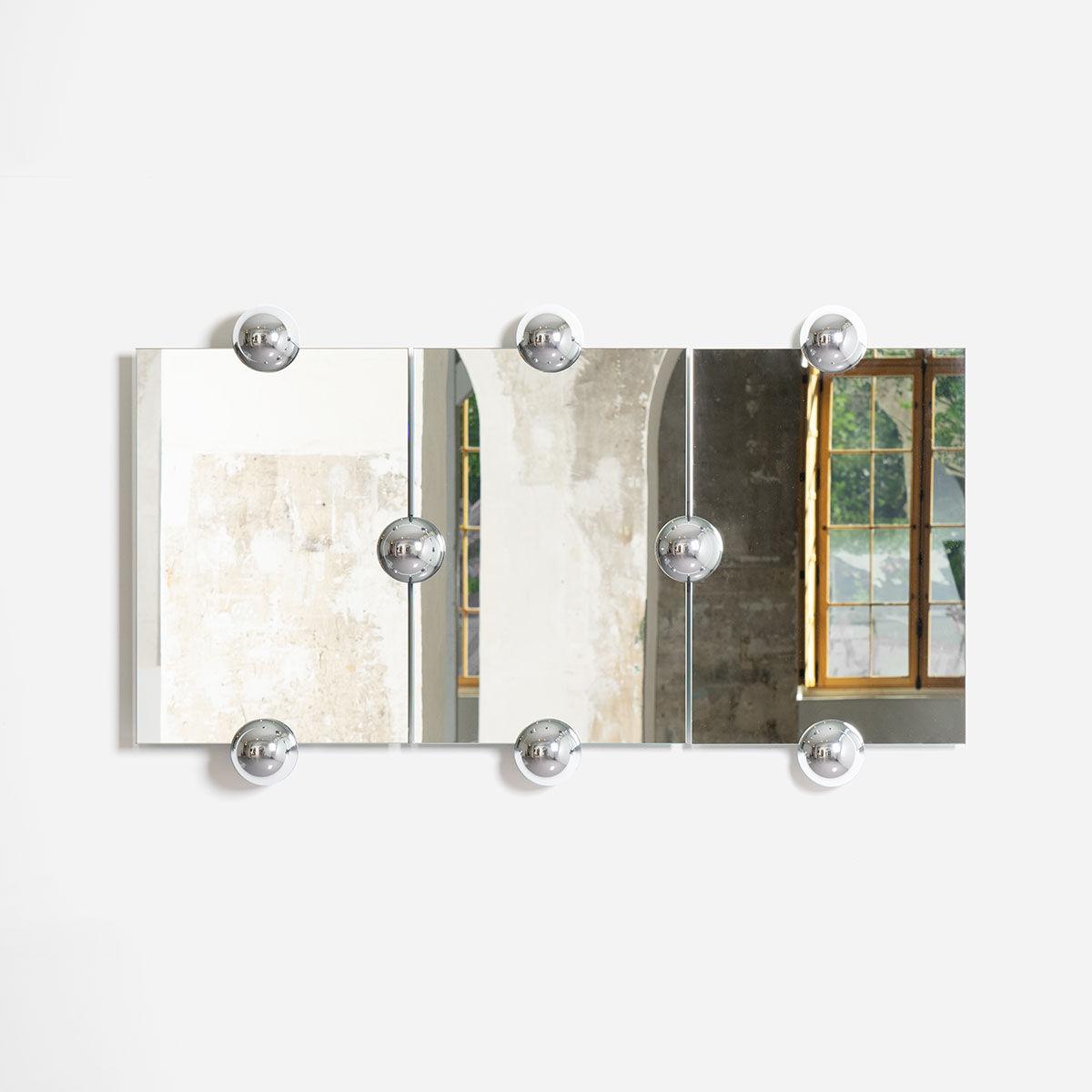 The Sphera mirror collection by Jean-Baptiste Fastrez is a contemporary interpretation of a technical device for creating mirrored walls. Very fashionable in the first half of the 20th century, the mirror clip has since been reduced to its sole function and today is no more than a fixture sold in the bathroom section of DIY stores. The Sphera mirror system sets out to reconnect with the decorative tradition of this invisible technical element by giving it an unexpected sculptural dimension and extraordinary flexibility. These chrome zamak spheres serve to attach the mirror to the wall while being a distinctive design element. A graduate of Ensci (National School for Industrial Creation), Jean-Baptiste Fastrez took his first steps under the direction of François Azambourg, then the Bouroullec brothers. Since then, he has ploughed his own furrow: hybrid and ultra-creative!