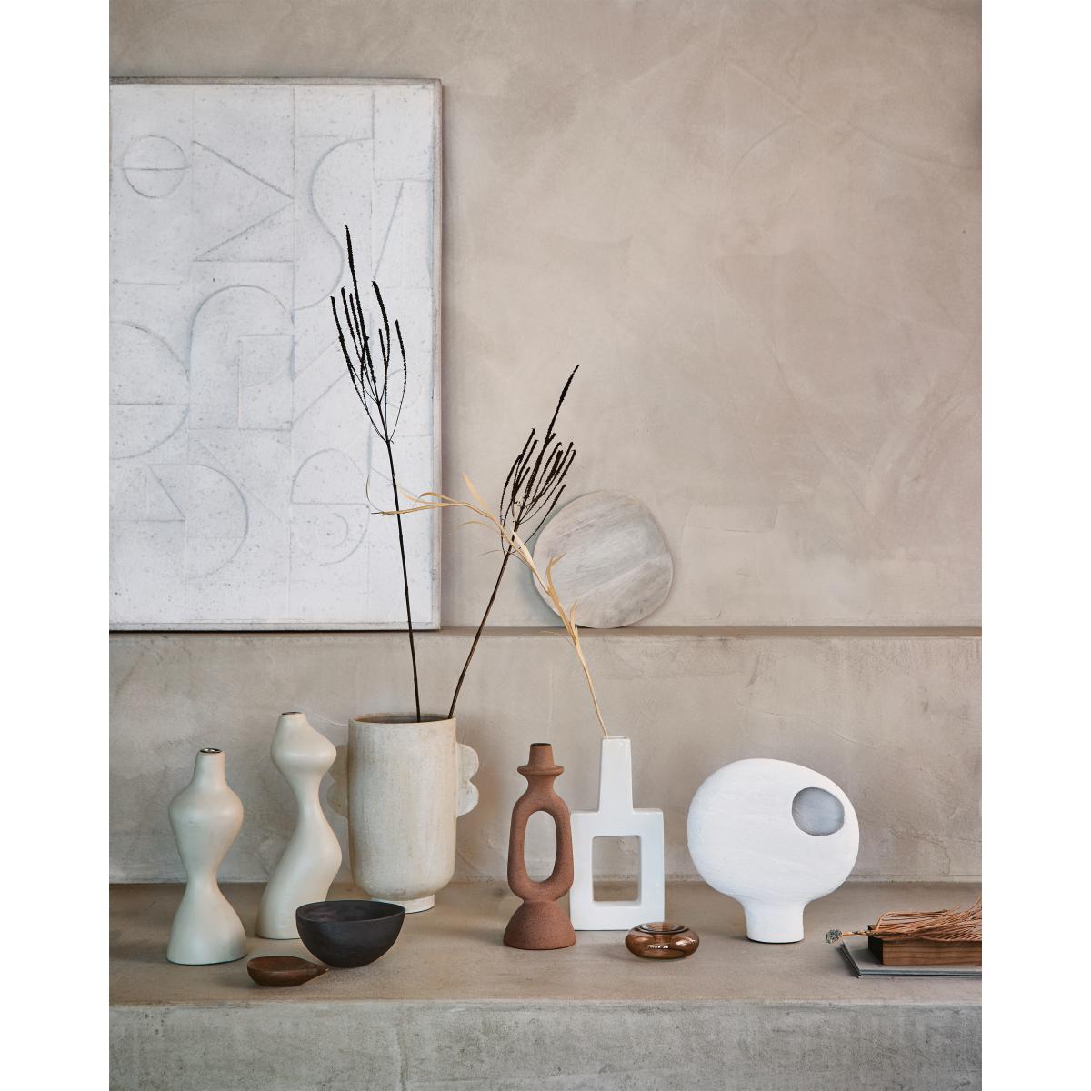 I love this small white sphere vase for its clean, minimalist aesthetic and sculptural shape, which makes it a versatile piece in many interiors. It works particularly well in contemporary, Scandinavian-inspired spaces, adding subtle interest without overpowering the decor. Practical styling tips include using it to hold a simple stem or dried foliage for a modern touch, or leaving it empty as a sculptural accent on a shelf or mantel. Its neutral tone and organic form make it easy to incorporate alongside other textures and colours, making it a subtle statement piece that can be styled in both casual and more refined settings.