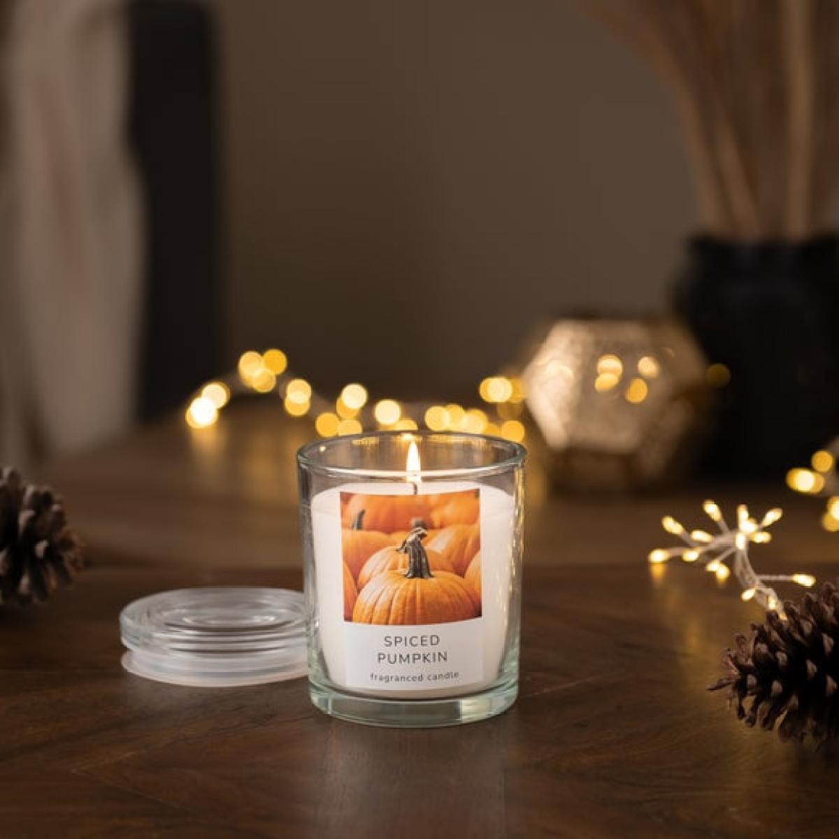 * Spiced pumpkin fragrance * Notes of nutmeg, cinnamon and vanilla * Burns for up to 40 hours A seasonal scent that’s warm and comforting. This glass candle blends sweet pumpkin with nutmeg, cinnamon and a soft touch of vanilla. It’s a cosy fragrance that’s perfect for autumn evenings. The clear jar makes it easy to style in any room, from kitchens to living spaces. With up to 40 hours of burn time, it’s made to last through the season. A great way to bring a little warmth indoors.