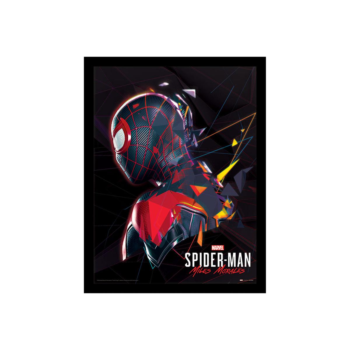 30x40cm Framed Print, in elegant black MDF frame with hanging fixings on the back for displaying this great Spider-Man Miles Morales print anywhere around your home.