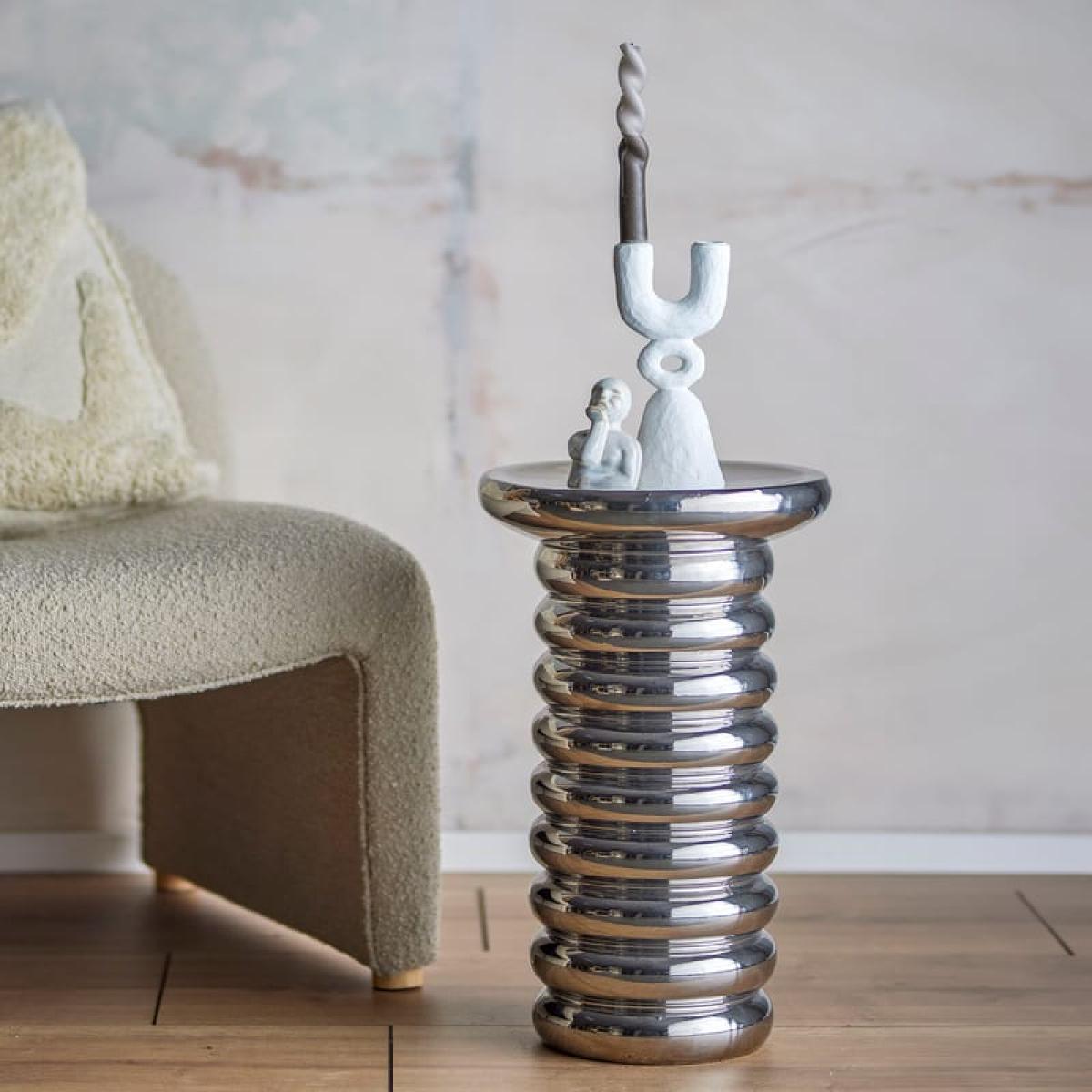 The brilliance of sculptural designPlay with light and enhance your interior with the Spike side table from Bloomingville. Its bold design, with its bouncy, sculptural forms, captures reflections and creates a striking effect. Its bright, sophisticated Silver-plated finish adds an ultra-contemporary touch to your Decoration. Ideal for modern, arty or minimalist interiors, this table becomes a real focal point, drawing the eye and energizing the space. Its graphic look and fluted lines add relief and character, while retaining a timeless elegance. Why choose the Spike End table? Unique Chromed shine: a captivating mirror effect that reflects light with intensity. Sculptural design: a bold, singular, swollen silhouette. Versatile: perfect as a sofa end, bedside table or decorative pedestal. Let your interior shine with this End table, the perfect blend of modernity and elegance. In detail: Variation : Chromed Brand : Bloomingville Type : End table Colour : Chromed Material : Enamelled sandstone, Chromed finish Dimensions : Ø 30 x H 50 cm Weight : 14.498 lb Characteristics :For indoor use only - Max. 20 kg Show less