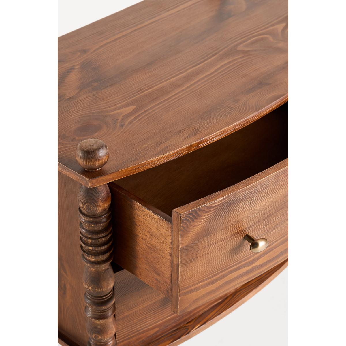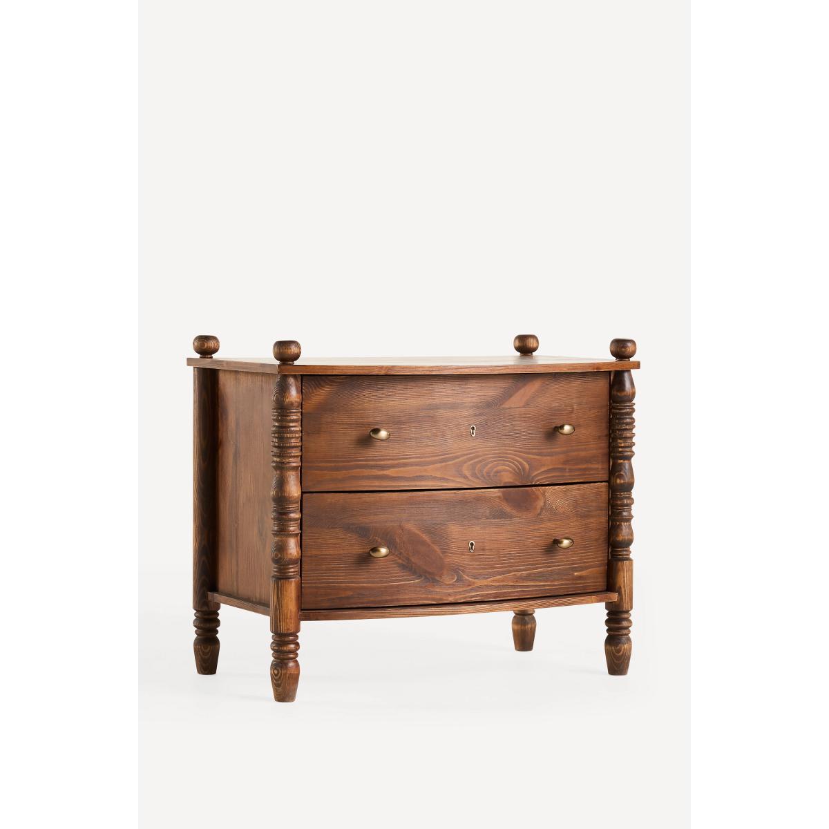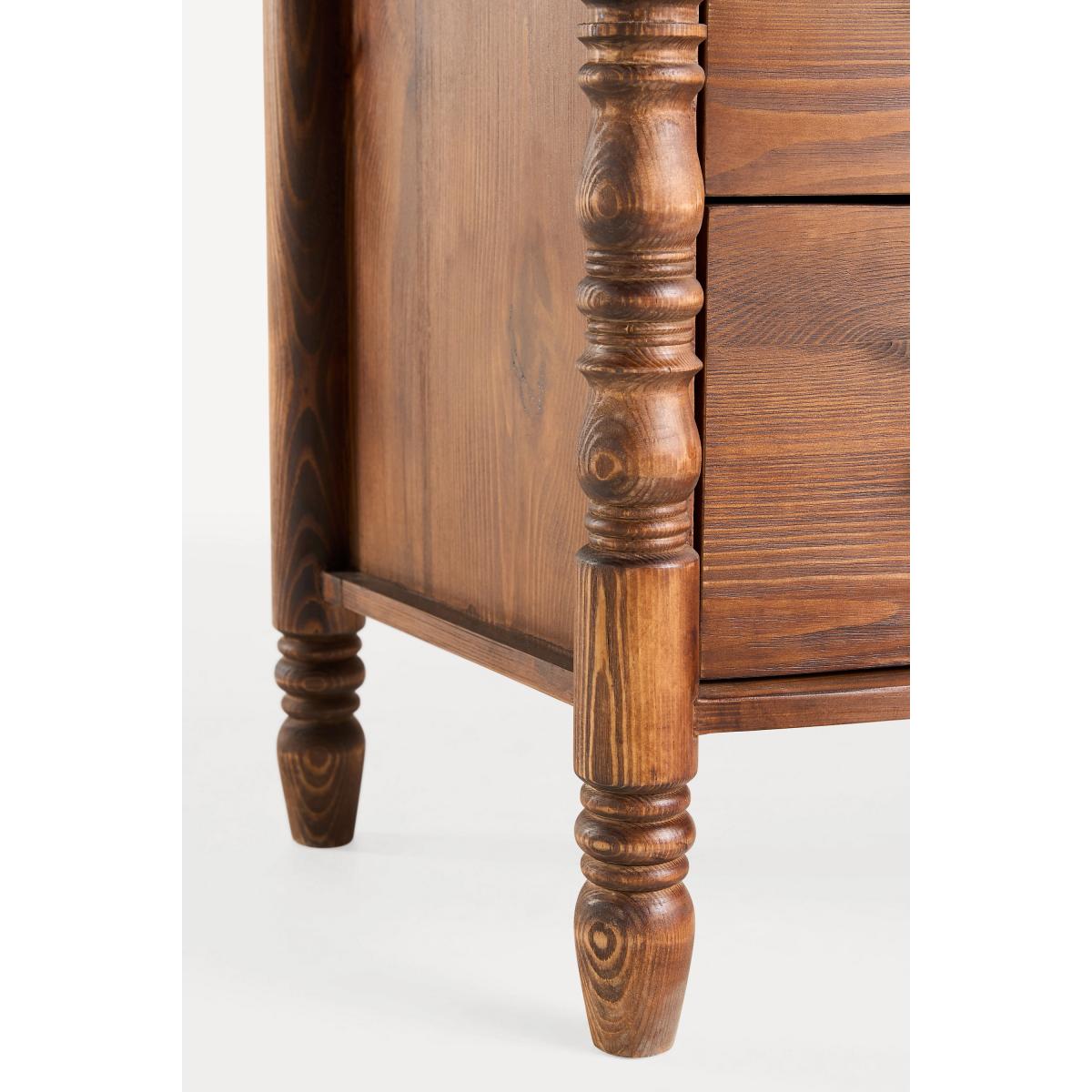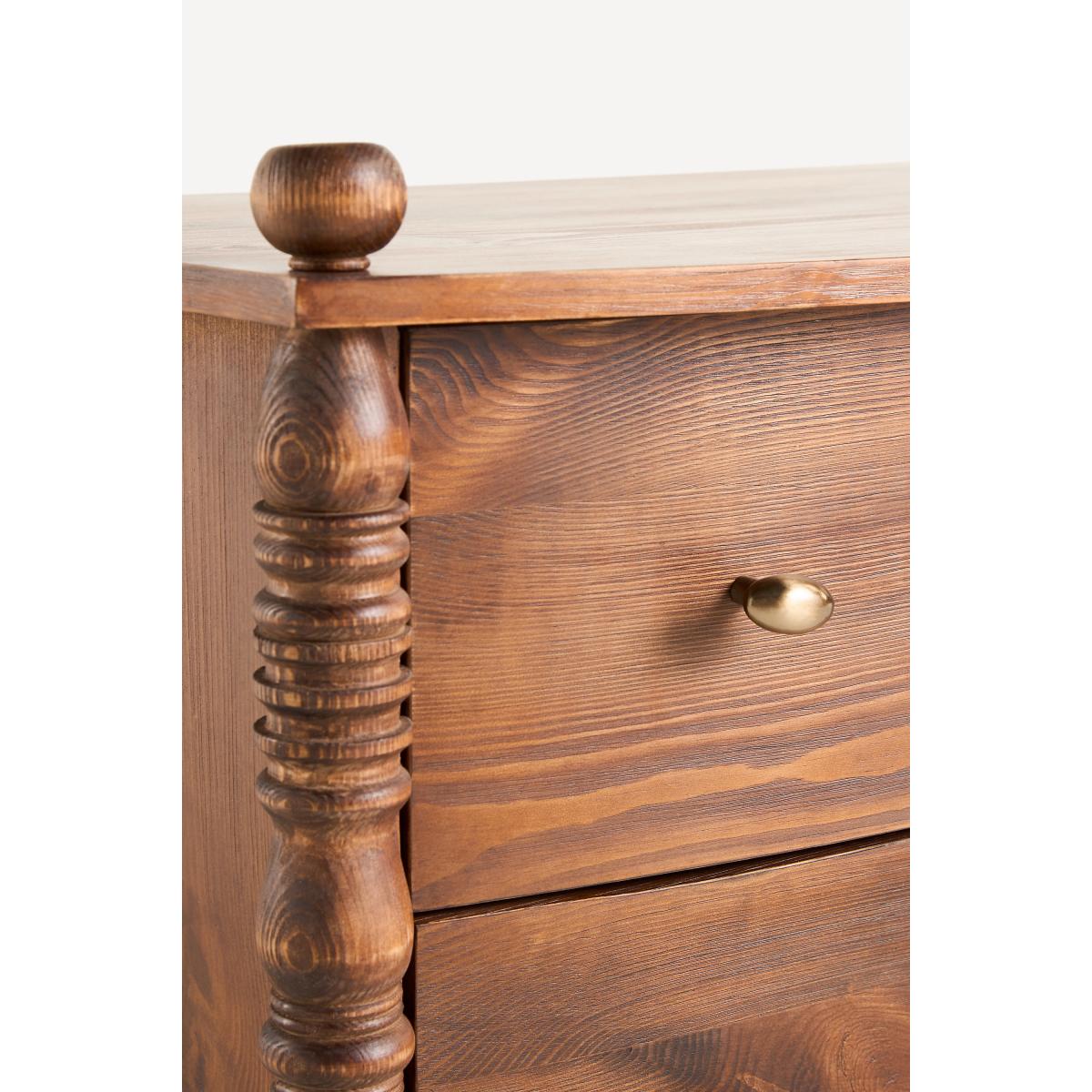 I love this bedside table for its vintage-inspired charm and warm wood tone, which adds character to both traditional and eclectic interiors. Its substantial build and detailed turned legs make it a versatile piece that works well alongside upholstered beds or in rooms with a mix of rustic and modern influences. Practical styling tips include pairing it with brass or matte black accents for contrast, and keeping the top surface clutter-free with a sleek lamp, a small plant, or a favourite book. Its generous drawers also provide ample storage, making it as functional as it is stylish - perfect for stacking your bedside essentials within easy reach.