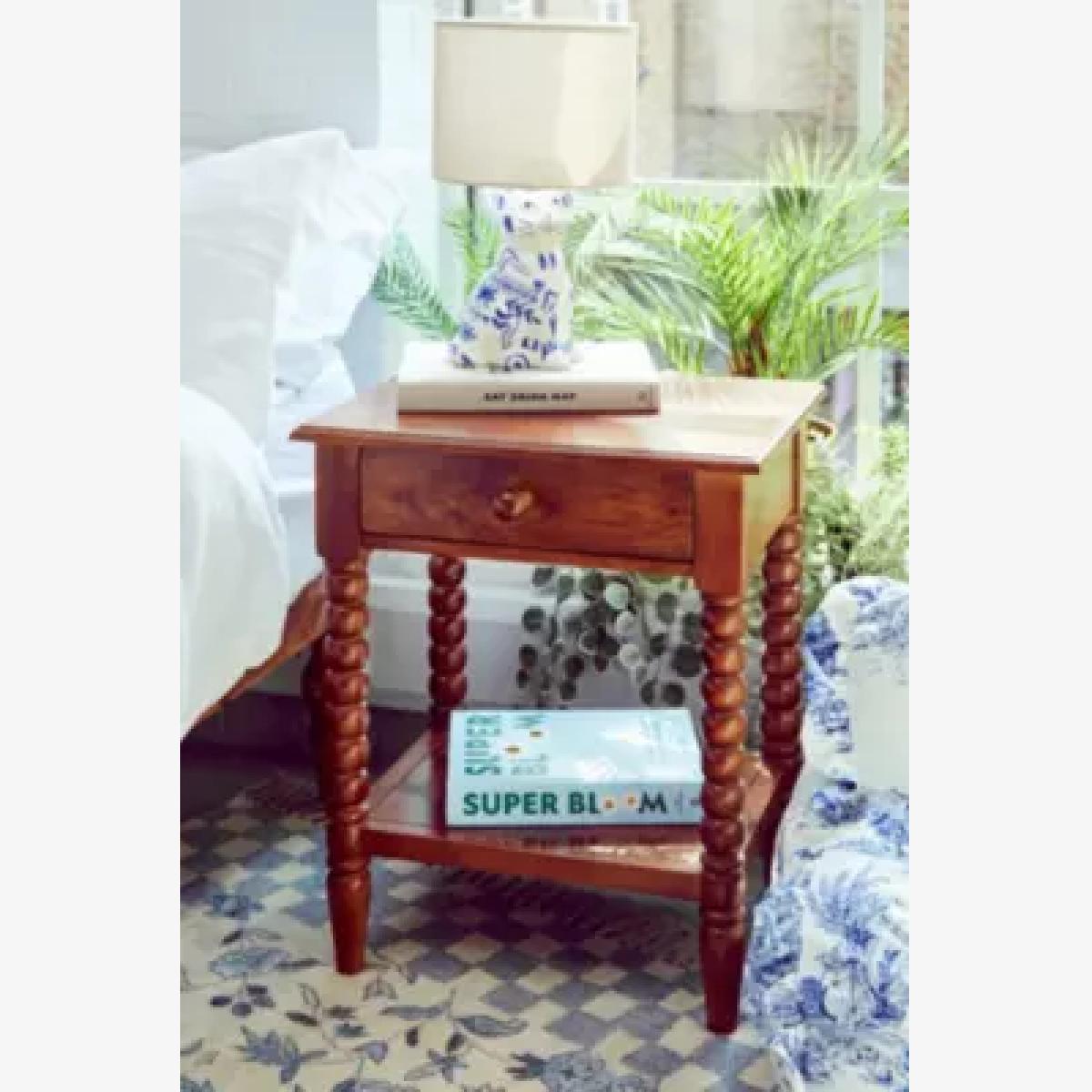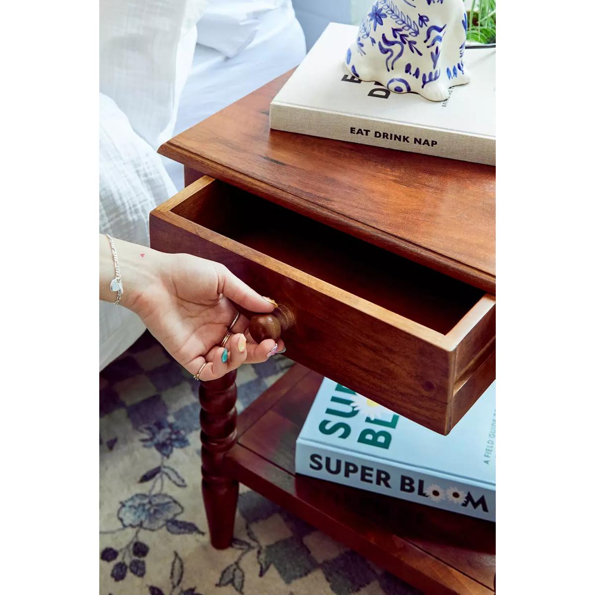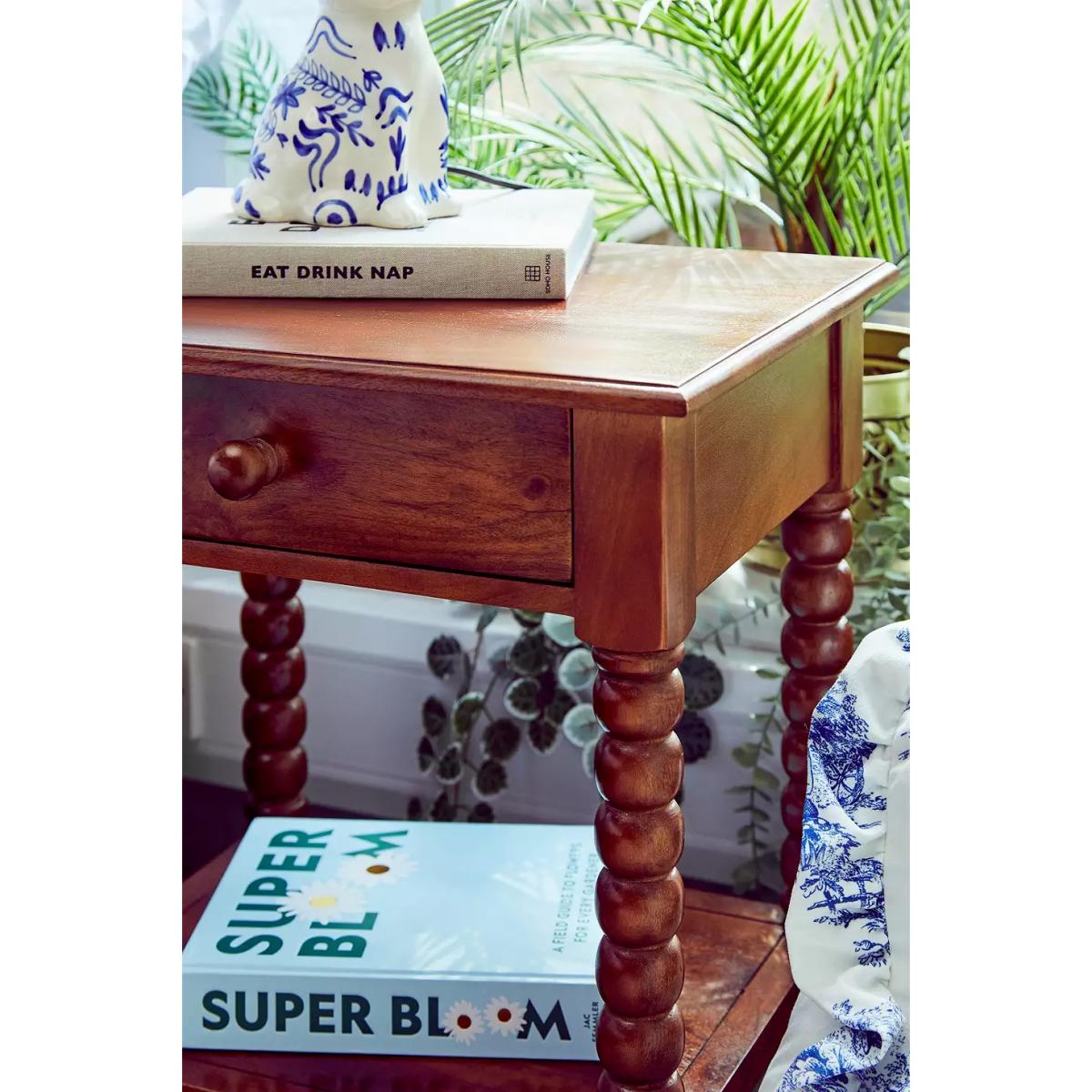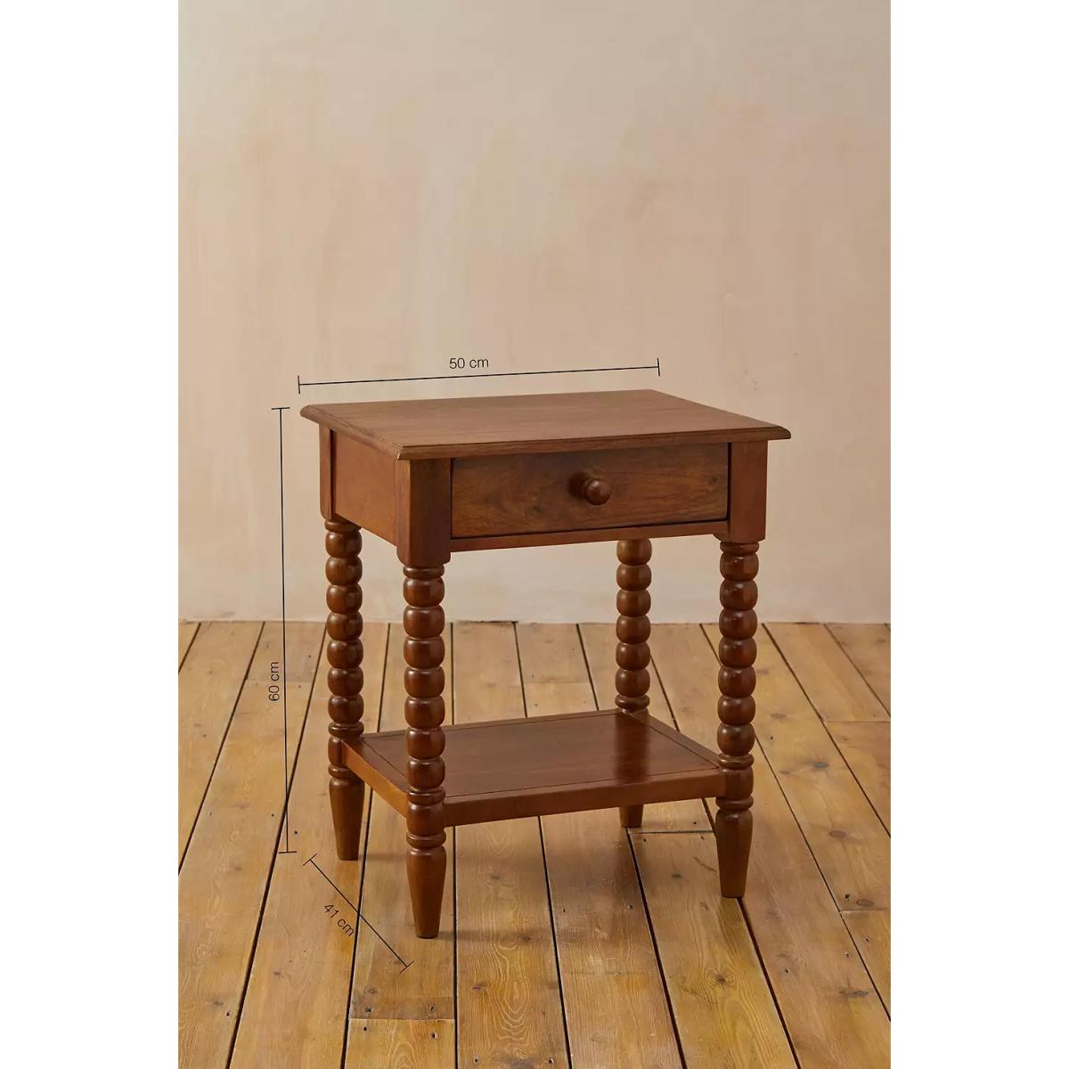 Classic folk-inspired nightstand in a wooden construction. Features a squared tabletop with small lower shelf underneath. Finished with four bobbin legs. **Content + Care** \- 90% Mango Wood, 10% MDF \- Wipe clean **Size** \- 50cm x 41cm x 60cm