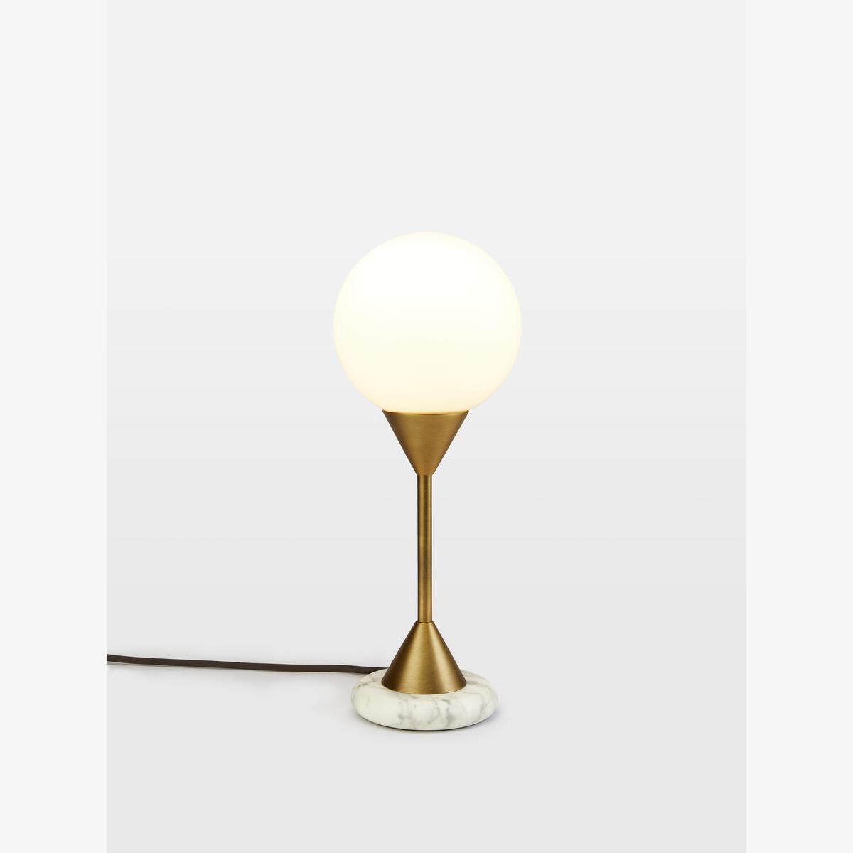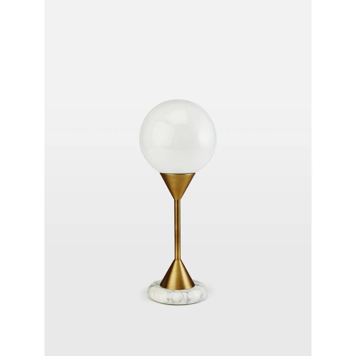 The large Spindle table lamp is a structural piece, made from white marble and plated antique brass with a white glass orb. Place it on a desk or side table to recreate the ambient glow in the club spaces at White City House. Sculpted white marble Plated antique brass Gloss white glass globe Each piece is entirely unique due to natural variations in the stone Dimmable Small version available Inspired by White City House