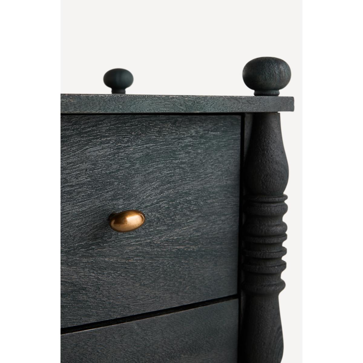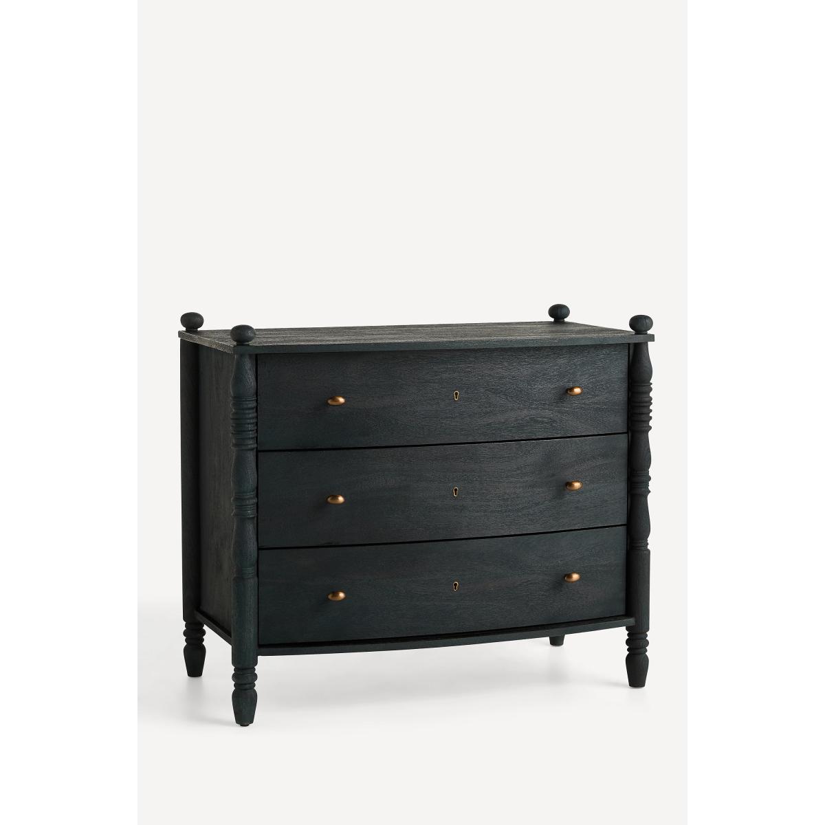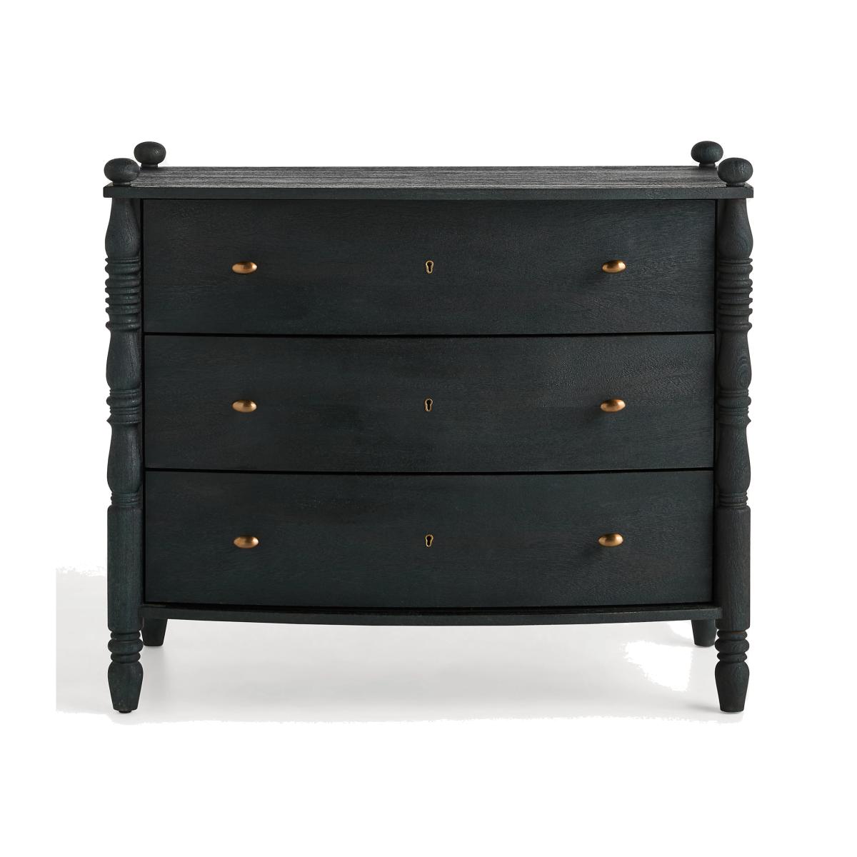 I love this little chest because of its timeless, classic design combined with a modern touch due to its dark finish. It works particularly well in bedrooms or living spaces that aim for a traditional, vintage, or eclectic vibe. The three drawers offer practical storage for clothing or small accessories, while its rounded silhouette and turned legs add subtle character. For styling, try pairing it with brushed brass or antique gold accents to emphasise its refined look. Conversely, it can also be quite striking when paired with soft, muted colour palettes in a cosy, cottage-inspired interior. Use it as a standalone statement piece or combine with other vintage finds for a layered, curated feel.