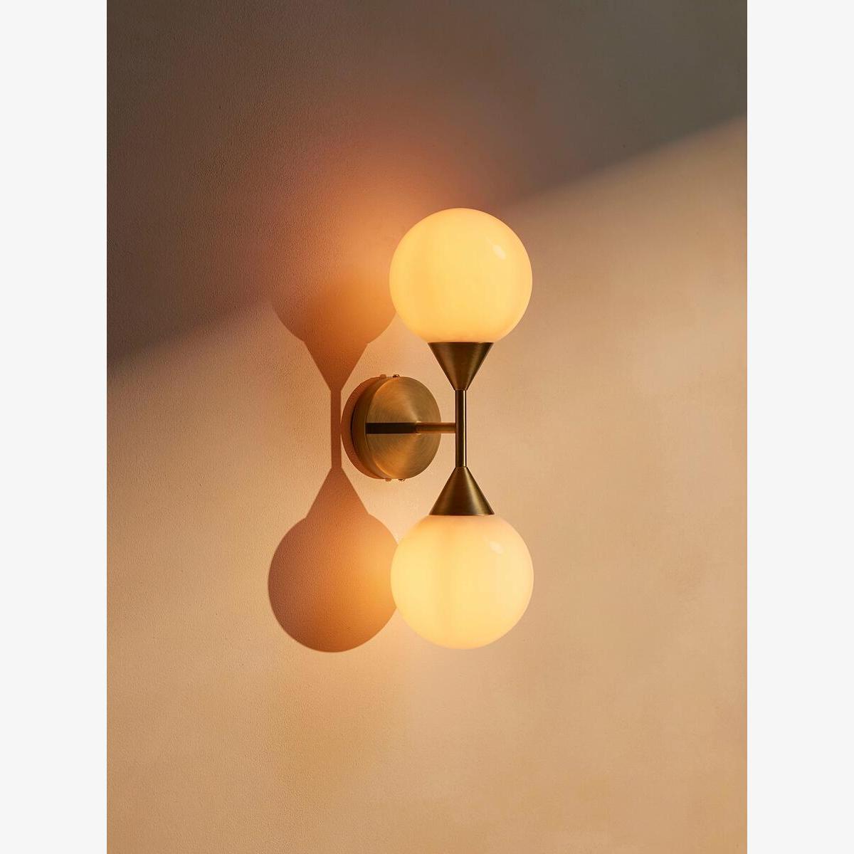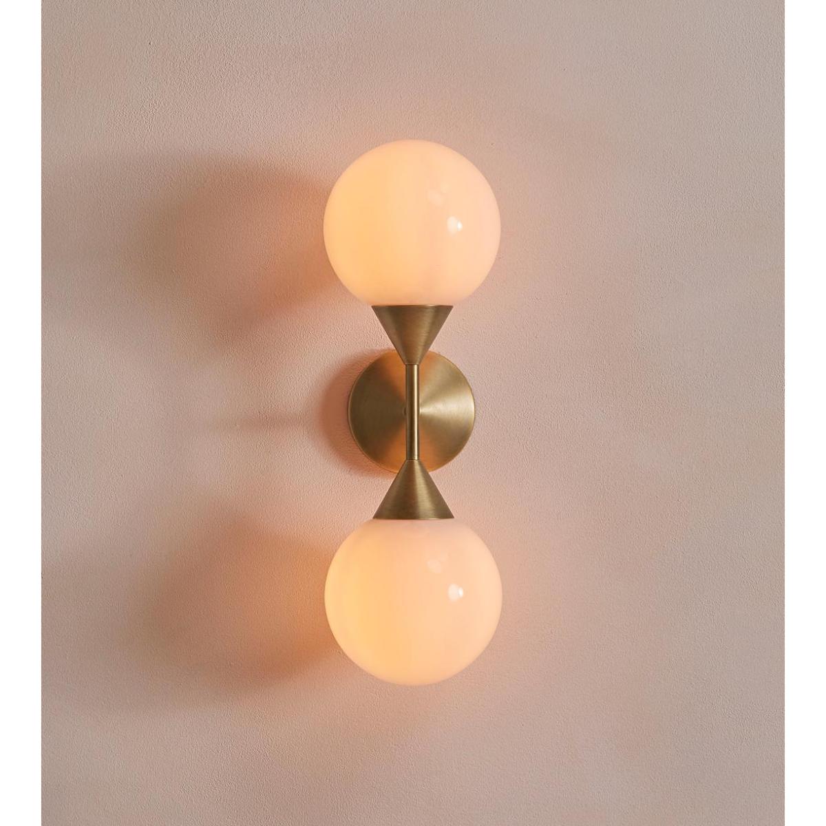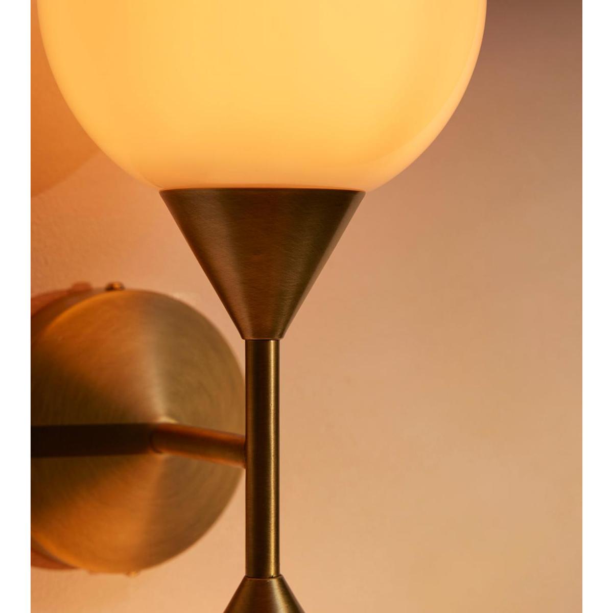 The Spindle wall light is a structural piece that's bathroom safe, crafted plated antique brass with a white glass orb. Place it either side of a bathroom mirror or next to a sofa to recreate the ambient glow of the club spaces at White City House. Plated antique brass Gloss white glass globe Bathroom safe Recommended bulb:Tala 3W Pluto LED We recommend wiring our wall lights with a dimmer control to tailor the light level Inspired by White City House