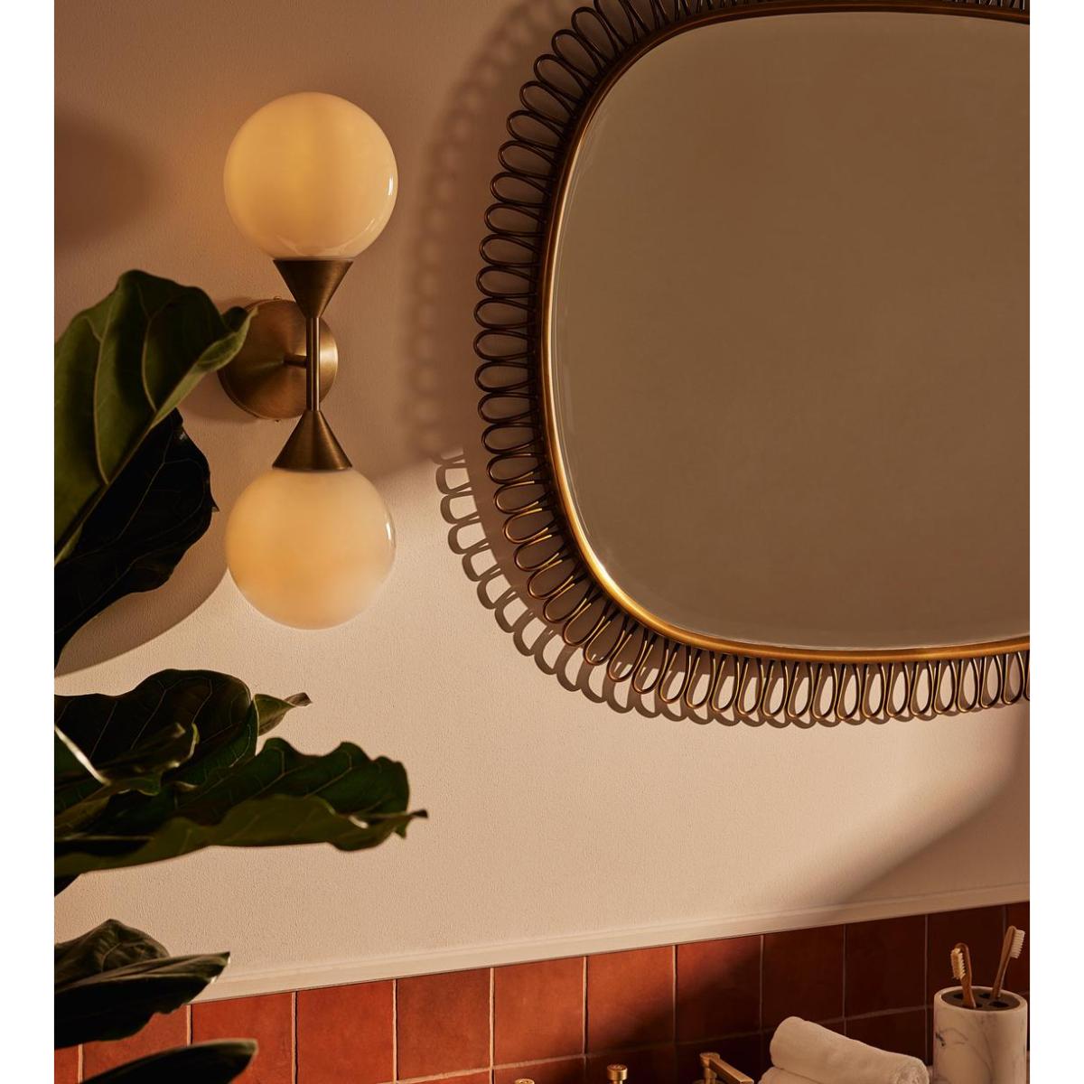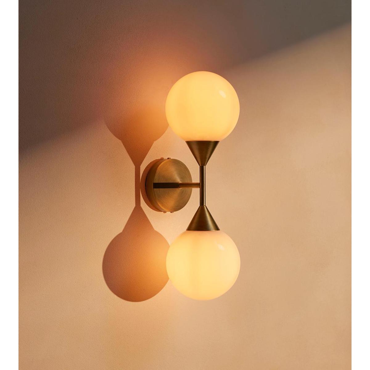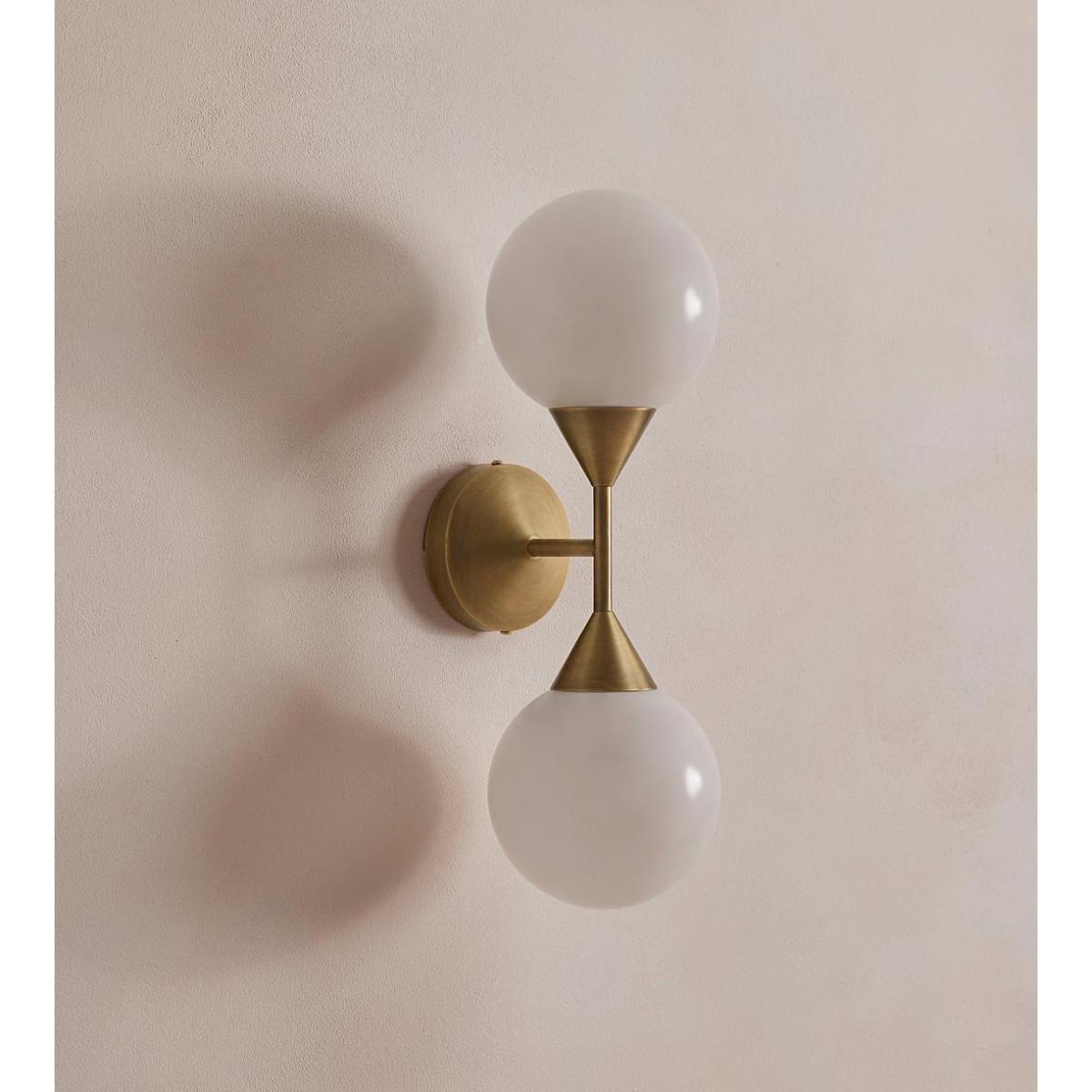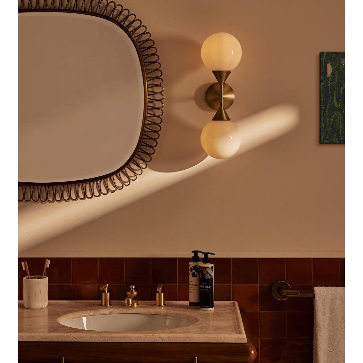 The Spindle wall light is a structural piece that's bathroom safe, crafted plated antique brass with a white glass orb. Place it either side of a bathroom mirror or next to a sofa to recreate the ambient glow of the club spaces at White City House. Plated antique brass Gloss white glass globe Bathroom safe Recommended bulb:Tala 3W Pluto LED We recommend wiring our wall lights with a dimmer control to tailor the light level Inspired by White City House