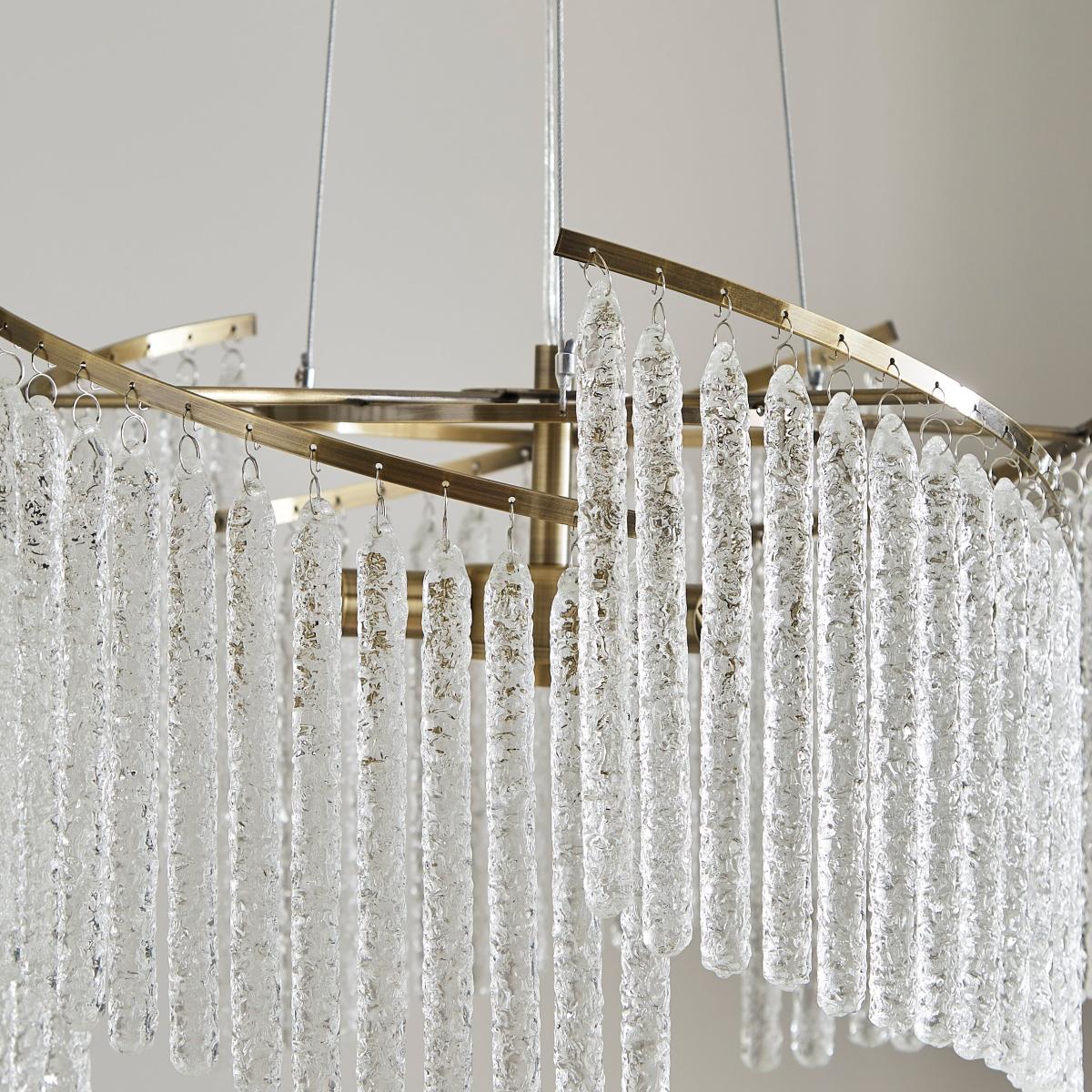 * Breathtaking Design - Statement Piece* Twisted, Gold Frame* 3 Light - Bright, Sufficient Light Output* Requires: G9 Cap Type & Capsule Bulbs Striking in design, the Spiralia Glass Ceiling Light features crackled, clear rods that are showcased on a twisted, gold spiral frame.