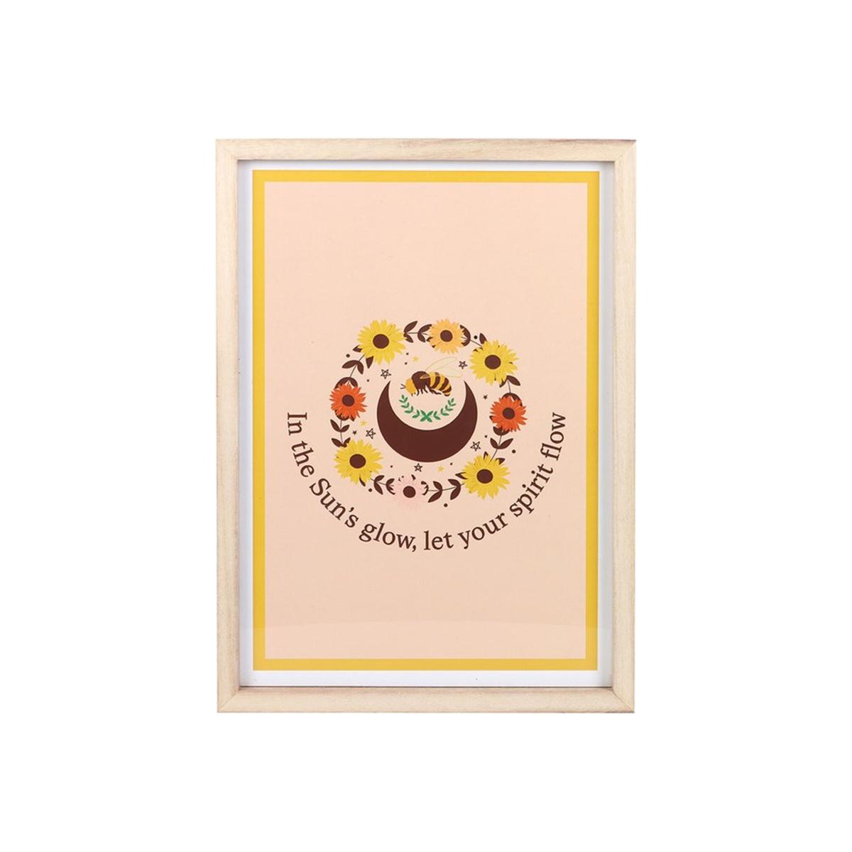 This framed print features a Summer Solstice-inspired design of a bee, sunflowers, and crescent moon, and an inspirational text "In the Sun's glow, let your spirit flow.". The wooden frame adds a rustic touch, perfect for displaying in a bedroom, living room or office space as a gentle reminder to embrace the season's vibrant energy. Sawtooth hangers on reverse.