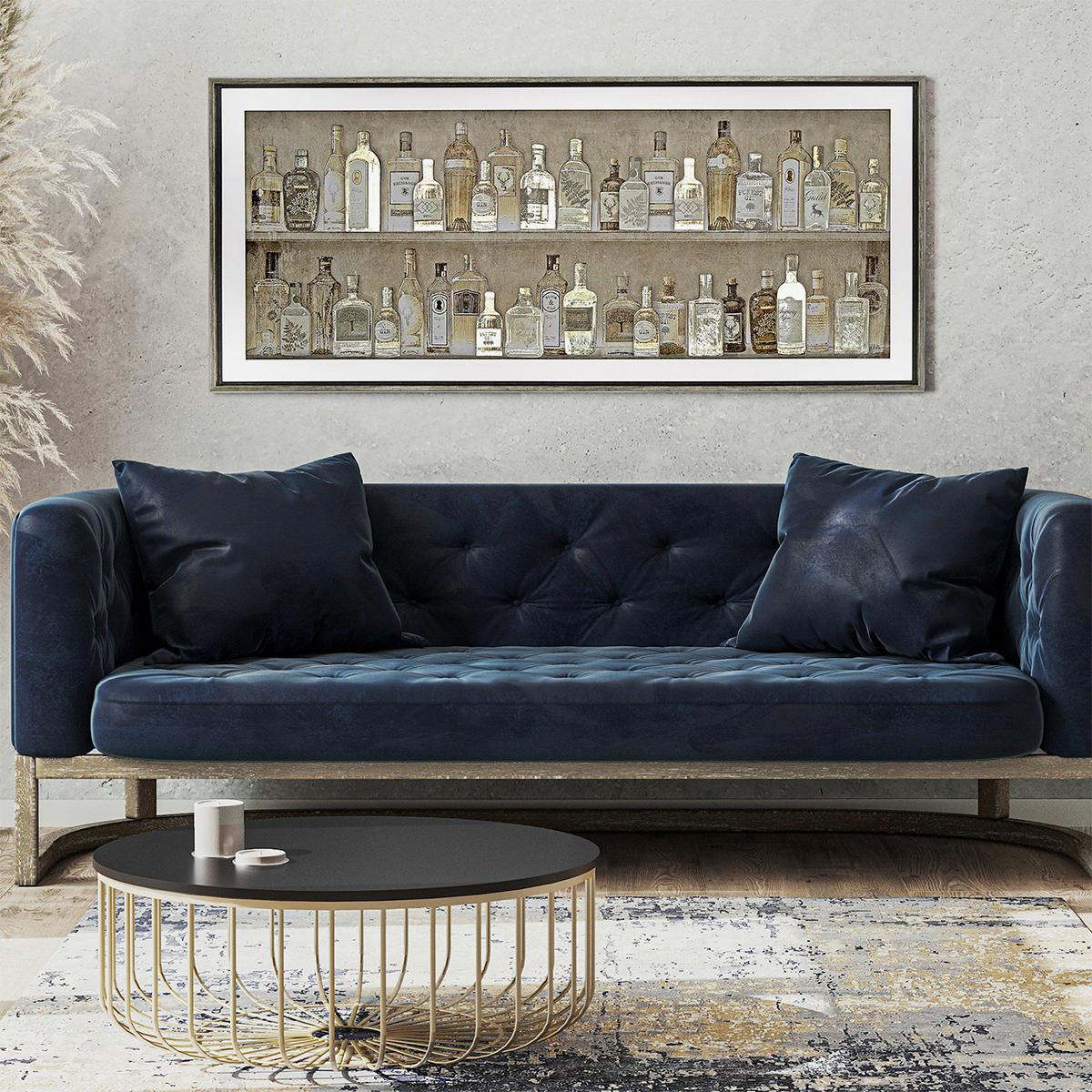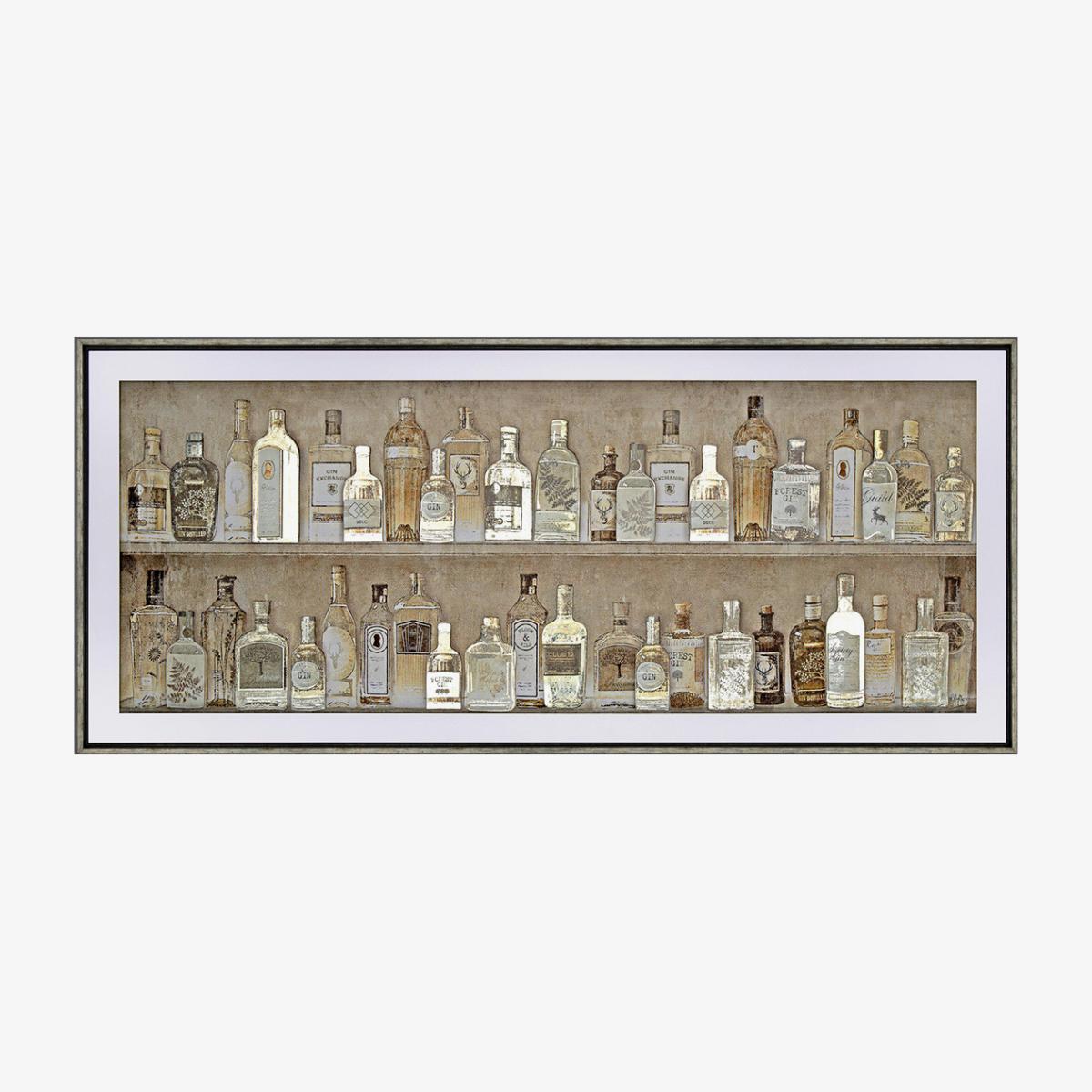 Get in the spirit with this retro-inspired artwork featuring a collection of shelves adorned with an array of beautifully illustrated gin bottles, each boasting its unique shape, size and label design. Set against a backdrop of rich warm hues.