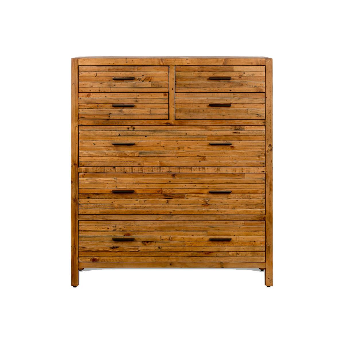 The beauty of real wood meets stylish industrial design in our on-trend Spitalfields bedroom furniture range. Made entirely from Forestry Stewardship Council-certified reclaimed wood, the look is authentic and characterful, and the rustic narrow-plank finish means that every piece in the collection is one-of-a-kind. And with both wide and narrow chests of drawers and three sizes of bed frame, it’s easy to bring home this distinctive look whatever the size or shape of your bedroom. The handcrafted Spitalfields collection is a Furniture Village online exclusive. With both smaller and larger drawers, this seven-drawer chest makes organising clothes and accessories so easy. And you’ll love the rustic reclaimed wood finish. Why you'll love it Industrial style handmade from reclaimed timber. Characterful and rustic. Narrow-plank finish showcases the beautiful natural variations of real wood. An ethical choice – it’s made from only FSC-certified wood. Sturdily crafted with dovetail drawer joints and tongue and groove back. Delivered to you fully assembled. Only available online. This 7-drawer chest is part of the Spitalfields range. What you need to know Made from FSC-certified reclaimed pine. Colour variations, knots, markings, chips and cracks are to be expected. Avoid placing in direct sunlight or close to a heat source. We recommend using placemats and coasters at all times. WARNING!