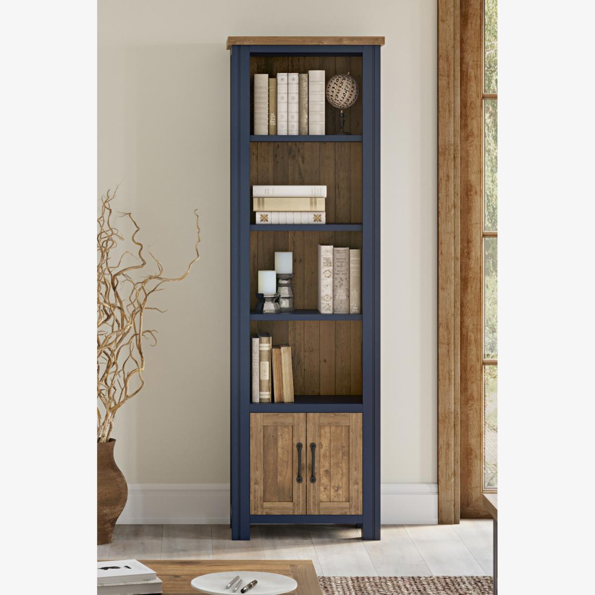 The Splash of Blue Narrow Bookcase is tailor-made for those awkward corners and alcoves, offering ample storage for books with its four deep shelves and convenient double cupboard at the base. Crafted with precision and style, the Splash of Blue range boasts clean lines and a trendy paint finish, all meticulously handcrafted from reclaimed weathered wood with a striking colour scheme. Each piece exudes a sense of individuality, perfect for enhancing any room with a relaxed yet stylish ambiance. Produced by skilled craftsmen, the collection embraces the rustic charm of reclaimed wood, celebrating its grain markings, knots, and subtle colour variations, ensuring that no two pieces are alike. The painted sections undergo multiple hand-spraying processes to achieve a flawless, contrasting finish against the natural wood, resulting in a collection that's truly a work of art. To maintain the allure of the reclaimed timber, a clear, hard-wearing lacquer is applied, enhancing the unique wood grain of each piece. The addition of blue accents and steel handles adds a touch of character, elevating your home decor with timeless elegance, where each furniture piece narrates its own distinctive story. Available in white or grey as well, the Splash of Blue collection offers enduring elegance with its timeless aesthetic. The narrow bookcase arrives fully assembled and is backed by a five-year manufacturer's guarantee. Dimensions. Overall size H180cm W56cm D30cm. Crafted from environmentally friendly reclaimed wood with a natural finish and contrasting blue accents. Features a narrow bookcase with four shelves and a double cupboard finished with steel handles. Shelf dimensions H33cm W46cm D27cm Cupboard dimensions H40cm W46cm D25cm. Handcrafted with care using reclaimed timbers, each item in the Splash of Blue range showcases the unique history of the wood, enhanced by a clear protective lacquer that highlights its imperfections. Delivered fully assembled within five to seven working days by skilled furniture logistics partners, this collection promises both charm and durability, making it a standout addition to any home.