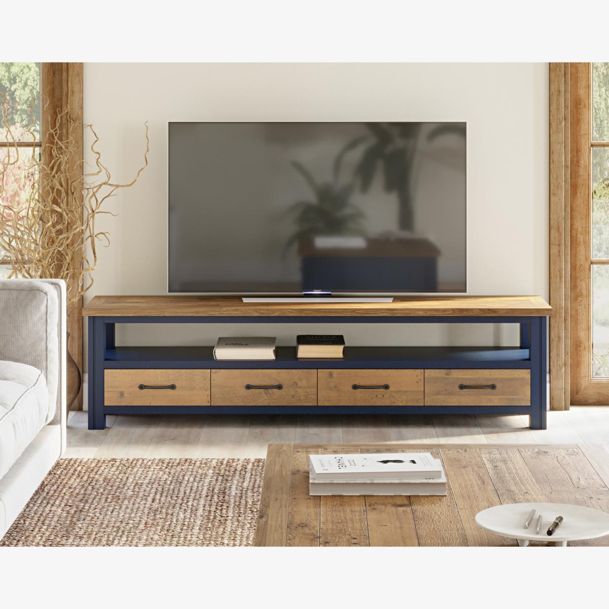 For those seeking the ultimate entertainment setup, the Splash of Blue Supersized Widescreen TV Cabinet is tailored for TVs up to 80 inches wide. It features four drawers with steel handles and a spacious open shelf for media devices and consoles. Crafted with precision and adorned with an on-trend paint finish, the Splash of Blue range is expertly handcrafted from reclaimed weathered wood, imbuing each piece with a distinct character that enhances any space. Handcrafted by skilled artisans, the collection embraces the rustic charm of reclaimed wood, showcasing its natural grain, knots, and subtle colour variations. The painted sections undergo meticulous hand spraying to achieve a flawless, contrasting finish against the wood's organic texture, resulting in pieces that are true works of art. To safeguard the beauty of the reclaimed timber, a clear, hard-wearing lacquer is applied, accentuating the wood grain while preserving its unique imperfections. The addition of a blue colourway and steel handles adds a touch of character, elevating your home decor with timeless elegance. The Splash of Blue collection offers an array of elegant pieces, available in white or grey options. The Supersized Widescreen TV Cabinet is delivered fully assembled and backed by a five-year manufacturer's guarantee. Dimensions. Overall size H47cm W180cm D40cm. Drawer dimensions H20cm W40cm D36cm. Each item in the Splash of Blue range is meticulously crafted by skilled artisans using reclaimed timbers, ensuring that every piece showcases the wood's unique history. Delivered fully assembled within five to seven working days by our proficient furniture logistics partner, this collection promises both charm and durability, making it a standout choice for your home decor.