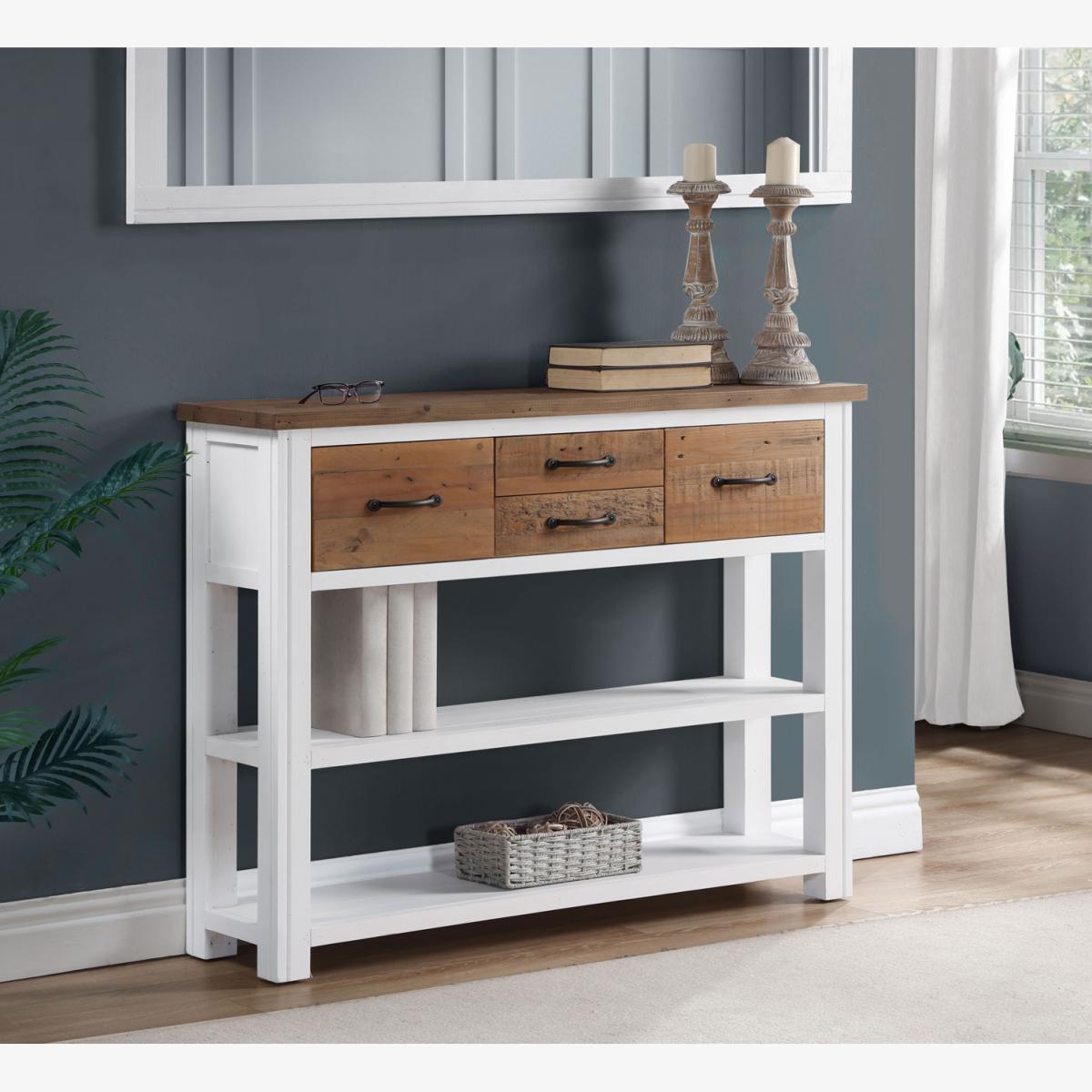 The Splash of White Low Bookcase Hall Table embodies sleekness and efficiency, ideal for bringing contemporary flair and practicality to smaller spaces. Versatile enough for both living rooms and hallways, it features two large and two small drawers at the top, along with two shelves at the base. Crafted with finesse and modernity, the Splash of White range showcases clean lines and an on-trend paint finish, all expertly handcrafted from reclaimed weathered wood with a striking colour scheme, ensuring each piece adds a touch of uniqueness to any room. Handcrafted by skilled artisans, the collection embraces the rustic allure of reclaimed wood, honouring its natural characteristics like grain markings, knots, and subtle colour variations, ensuring no two pieces are identical. The painted sections undergo meticulous hand spraying to achieve a flawless, contrasting finish against the natural wood, resulting in a collection that's truly a masterpiece. To safeguard the beauty of the reclaimed timber, a clear, durable lacquer is applied, accentuating the distinctive wood grain of each piece. The addition of white accents and steel handles adds character, elevating your home decor with timeless elegance, where each furniture piece tells its own compelling story. Available in blue or grey options, the Splash of White collection offers enduring elegance, with the Low Bookcase Hall Table arriving fully assembled and backed by a five-year manufacturer's guarantee. Dimensions. Overall size H90cm W120cm D30cm. Crafted from environmentally friendly reclaimed wood with a natural finish and contrasting white accents. Features two shelves and two large and two small drawers finished with steel handles. Shelf dimensions H30cm W108cm D28cm. Large drawer dimensions H20cm W34cm D26cm. Small drawer dimensions H10cm W34cm D26cm. Handcrafted with care using reclaimed timbers, each item in the Splash of White range showcases the unique history of the wood, enhanced by a clear protective lacquer that highlights its imperfections. Delivered fully assembled within five to seven working days by skilled furniture logistics partners, this collection promises both charm and durability, making it a standout addition to any home decor.
