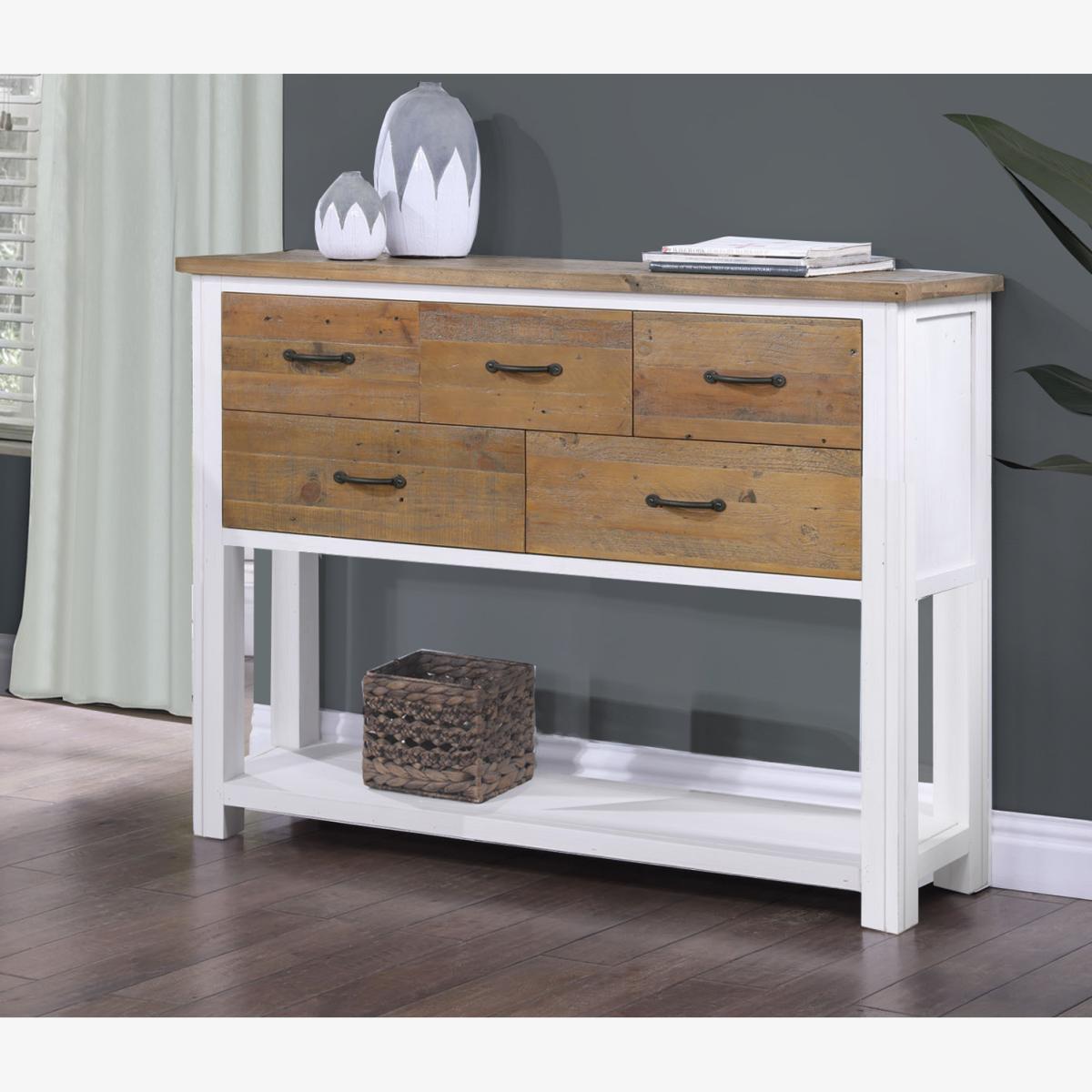 The Splash of White Sideboard Console Table offers versatile storage and stylish appeal, suitable for any room in your home. Boasting two large and three smaller drawers, along with a handy shelf at the base, it provides ample space for your belongings while serving as an ideal surface for decor like lamps or vases. Crafted with precision and adorned with an on-trend paint finish, the Splash of White range is meticulously handcrafted from reclaimed weathered wood, ensuring each piece exudes a sense of uniqueness, enhancing the ambiance of any space. Produced by skilled craftsmen, the collection embraces the rustic allure of reclaimed wood, carefully selecting materials to highlight the natural grain, knots, and subtle colour variations, resulting in pieces that are truly one-of-a-kind. The painted sections undergo meticulous hand spraying to achieve a flawless, contrasting finish against the natural wood, elevating the collection to works of art. To protect and enhance the beauty of the reclaimed timber, each piece is coated with a clear, durable lacquer, accentuating the wood grain and preserving its distinctive character. The rustic whitewash colourway and steel accent handles add a touch of charm, enhancing your home decor with timeless elegance and individuality. Available in blue or grey options, the Splash of White collection offers enduring sophistication, with the Sideboard Console Table delivered fully assembled and backed by a five-year manufacturer's guarantee. Dimensions. Overall size H98cm W134cm D36cm. Crafted from environmentally friendly reclaimed wood. Two large drawers H30cm W60cm D34cm. Three small drawers H30cm W40cm D34cm Shelf dimensions H30cm W122cm D36cm. Each piece in the Splash of White range is crafted by skilled artisans using reclaimed timbers, showcasing the unique history of the wood and delivering a truly exceptional addition to your home decor. Delivered fully assembled within five to seven working days by our skilled furniture logistics partner, it promises both charm and durability.