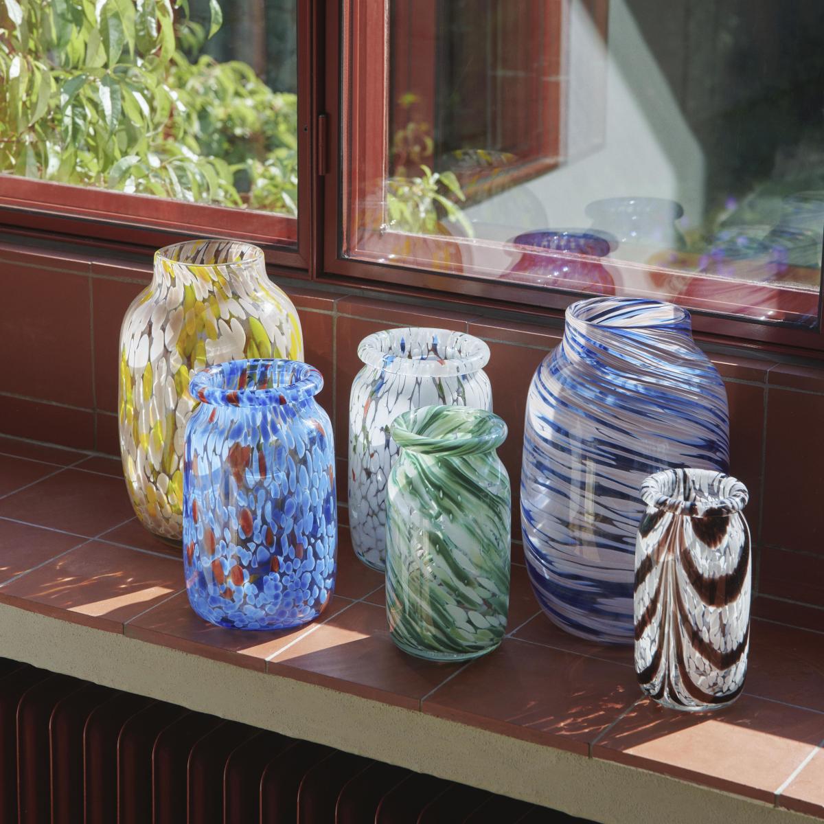 Splash vases are handcrafted using a special glass-blowing technique involving several layers of colored glass dots. These Vases feature unique swirling patterns in superb, contemporary color combinations. Swirling stripes, polka dots and opaque pastilles float on the surface of the delicately shaded glass.