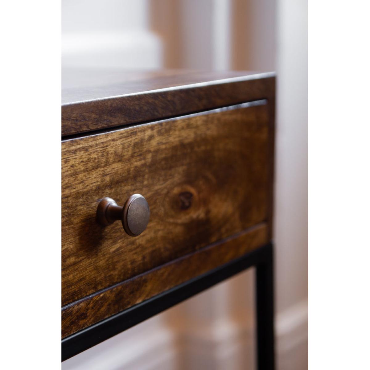 About The Split Level 2-Drawer Mango Wood Bedside Table This Mango Wood Bedside Table with a gorgeous iron frame features two drawers at the top and bottom, the perfect home accessory for keeping your household knick knacks with delight. Providing plenty of opportunity for storage and display, this Wooden Side Table is a must-have traditional style piece of bedroom furniture encapsulating a chic apothecary feel that can be paired with any scheme beautifully. The Bedside Table measures 60cm in Height, 40cm in Width & 35cm in Depth. Why We Think You’ll Love The Small Side Table This Slim Bedside Table made from luxurious mango wood is a brilliant space saving storage solution, allowing you to display your treasures on its surface whilst hiding away your household clutter. Mixing functionality with dazzling design, this Side Table With Storage is not only practical but also an effortlessly stylish addition to any decor that will radiate a unique glamour wherever it is placed, so what’s not to love?! Where To Style The Wooden Bedside Table The perfect Bedroom Side Table that will not disappoint, a charming pair of these bedside tables will bring instant character to your sleeping space, exuding a timeless elegance amongst any interior. This glorious Dark Wood Side Table With Drawers would also come in handy in a study room or living area, to keep work, books and more whilst showcasing some chic ornamental treasures on its stunning surface.