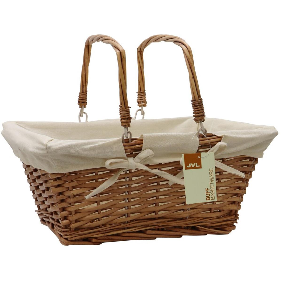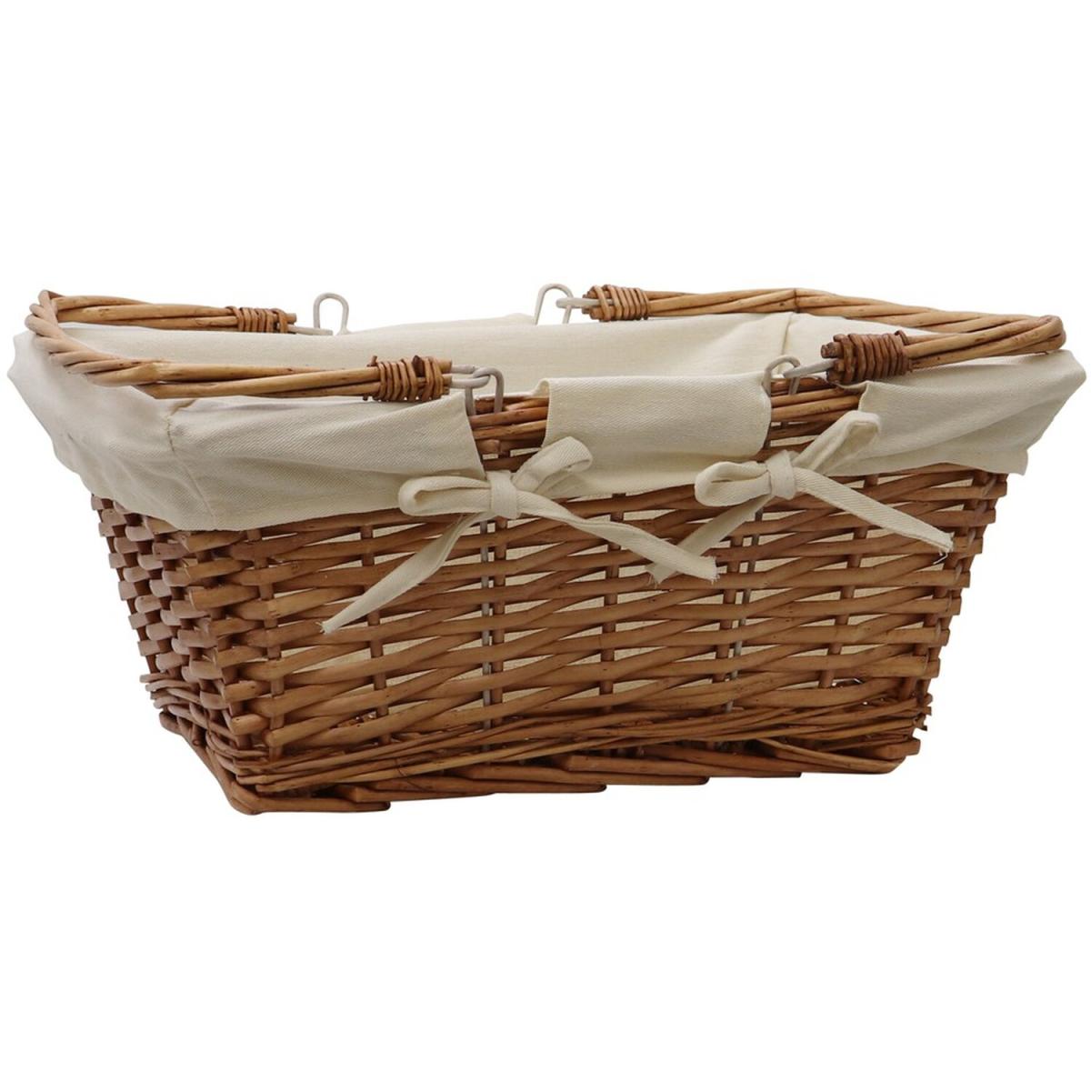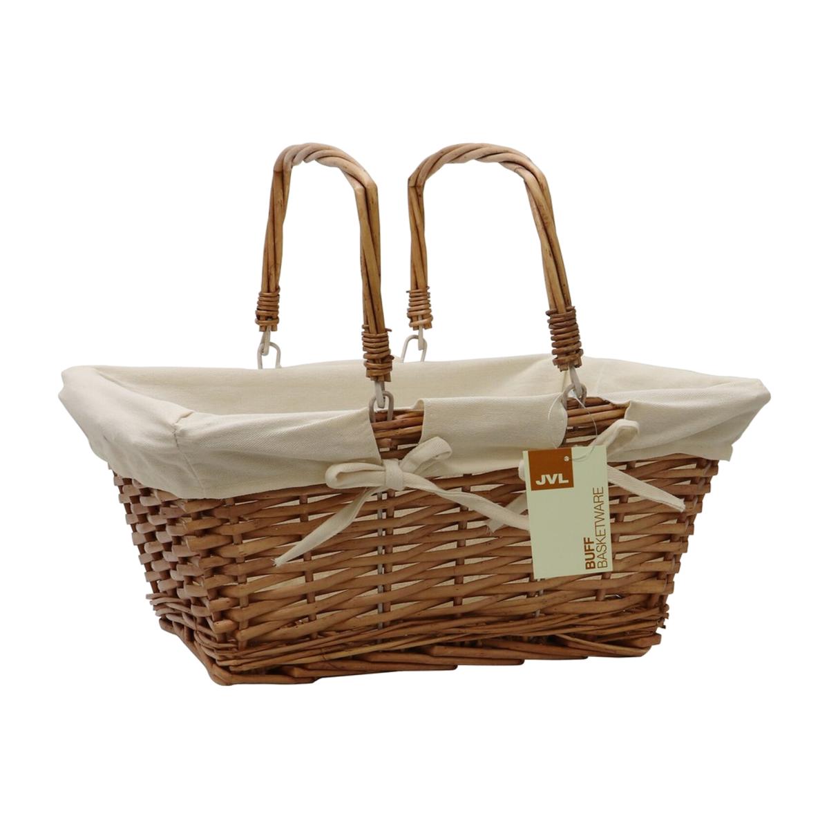 All purpose tapered basket, that can be used for carrying fruit, bread or other shopping items. The elegant buff finish on split willow provides a country finish. Two collapsible carrying handles allow the basket to be moved and stored easily. The cream lining is machine washable at 30 degrees Celsius which allows the basket to stay looking nice. cm.
