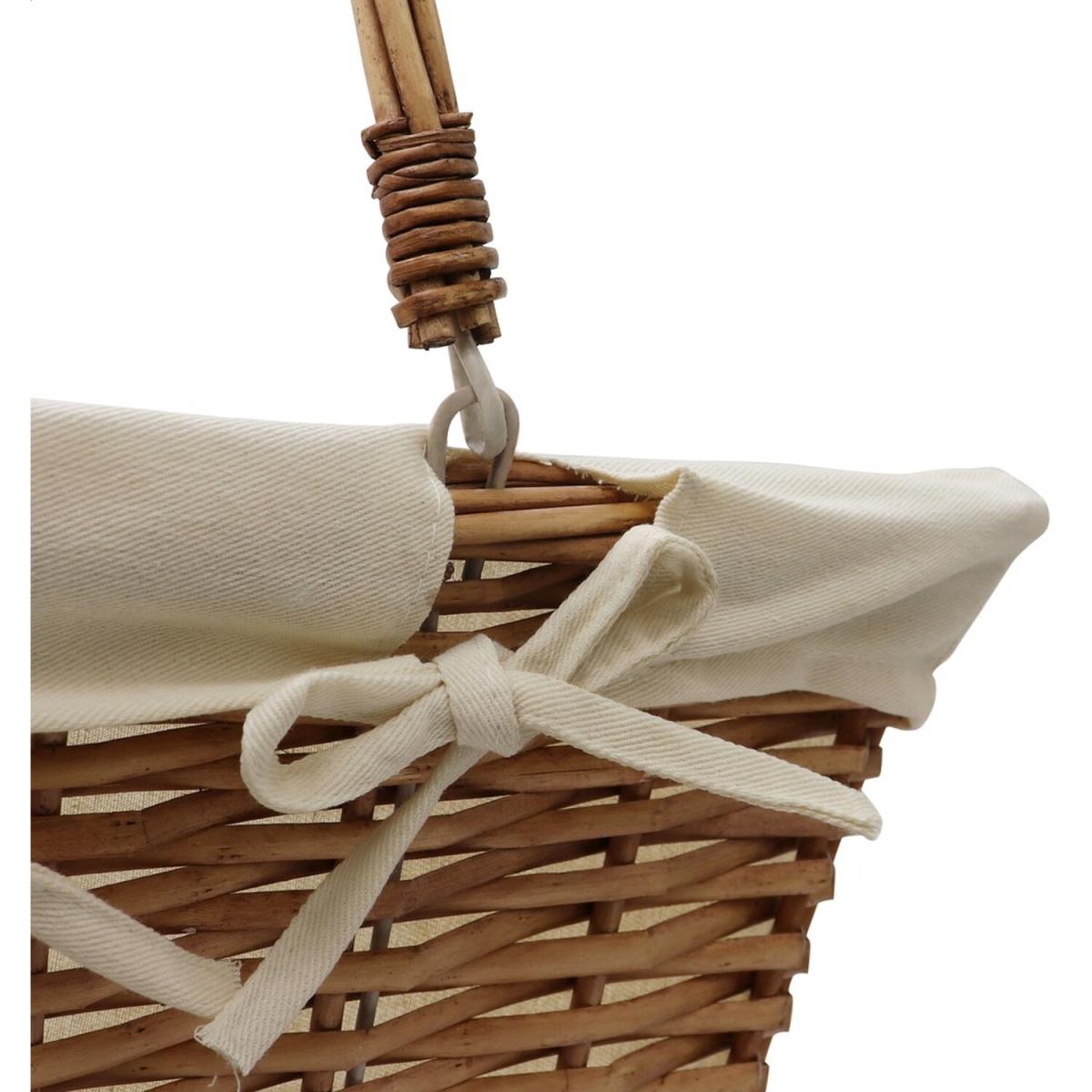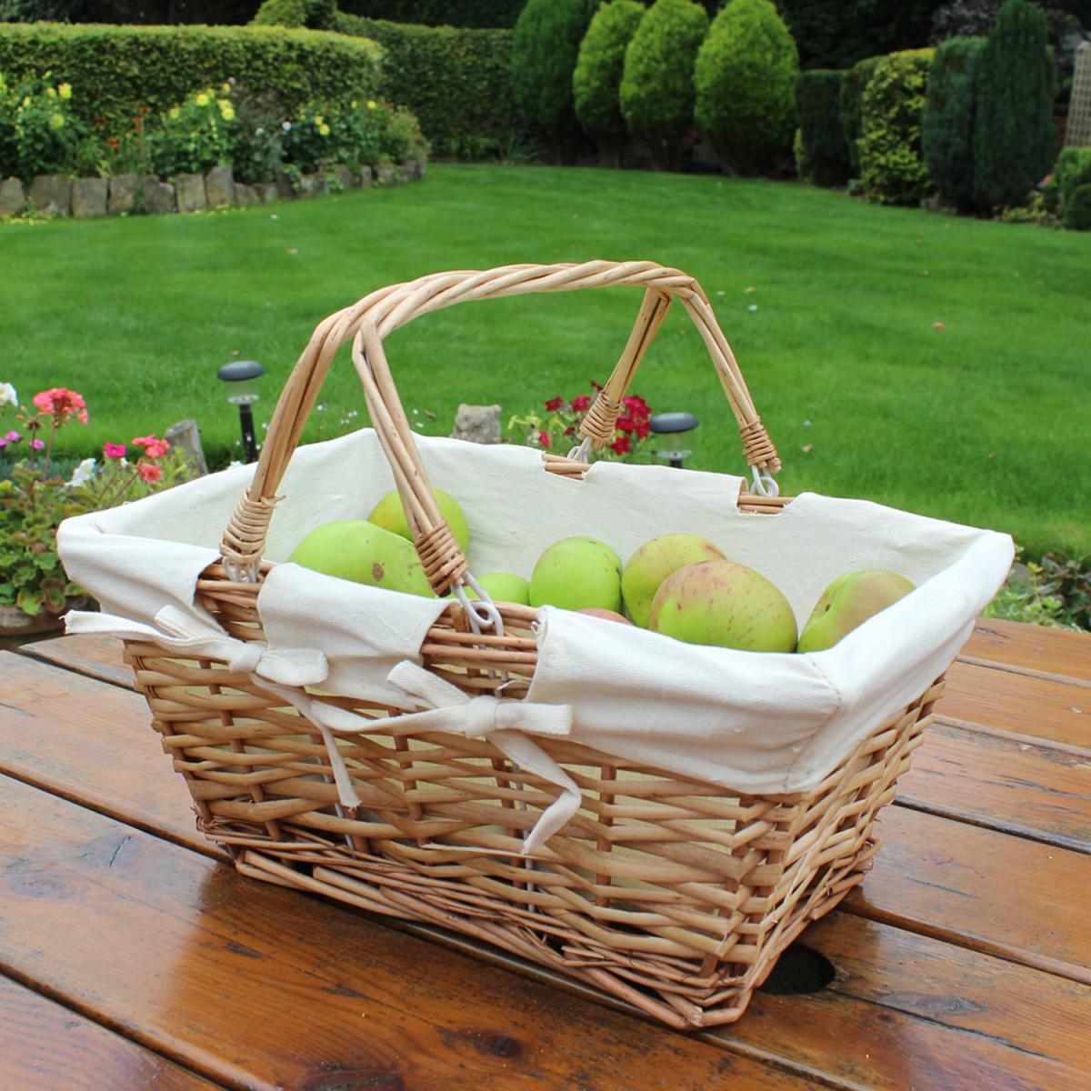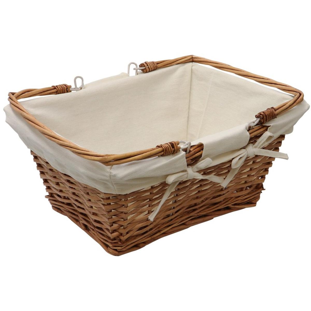 All purpose tapered basket, that can be used for carrying fruit, bread or other shopping items. The elegant buff finish on split willow provides a country finish. Two collapsible carrying handles allow the basket to be moved and stored easily. The cream lining is machine washable at 30 degrees Celsius which allows the basket to stay looking nice. cm.